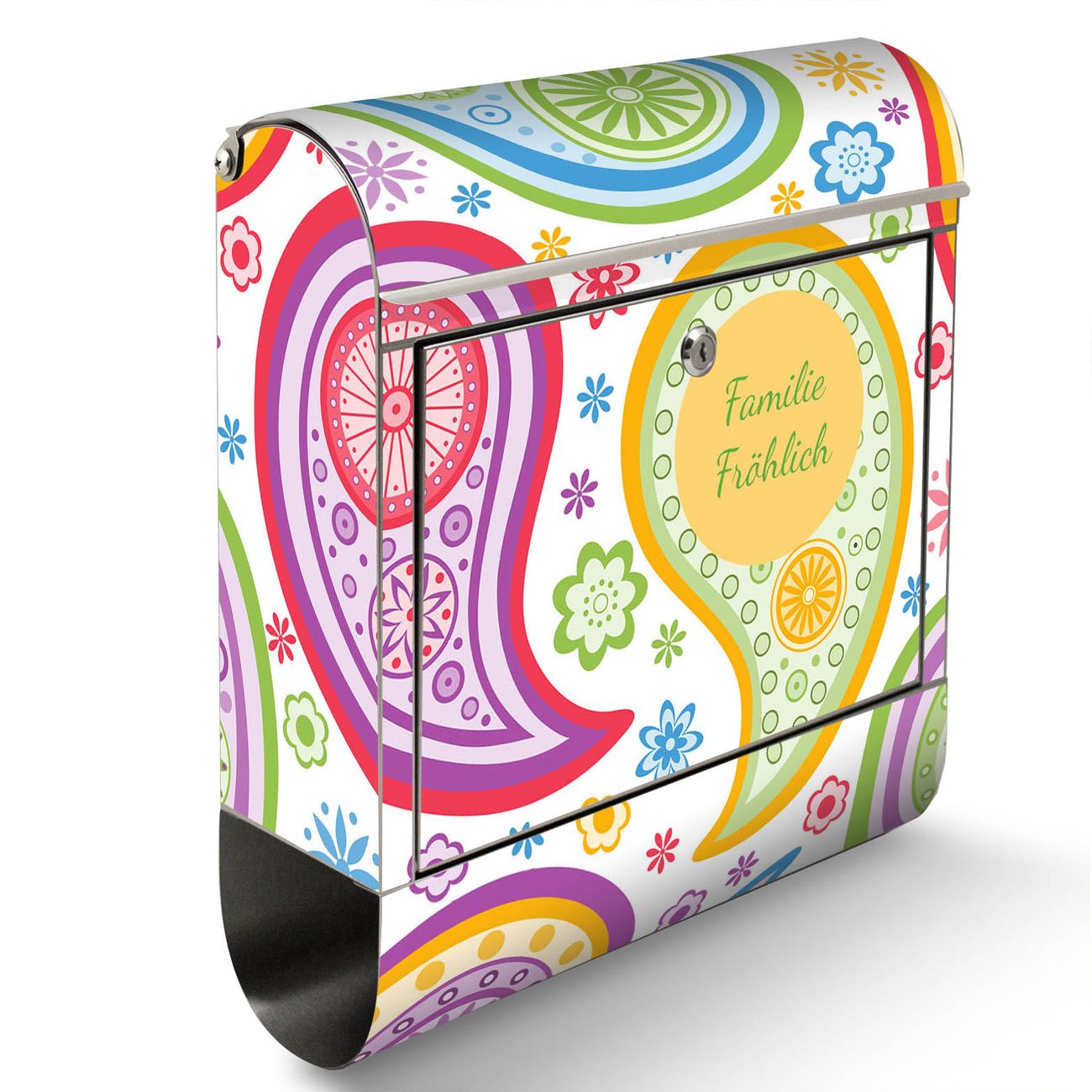 Der banjado Edelstahl Standbriefkasten mit Motiv Paisley bunt und eigenem Wunschtext bietet Ihnen mit seinem Fassungsvermögen genügend Platz auch für große A4 Sendungen. Das integrierte Zeitungsfach eignet sich hervorragend, um unkompliziert die Tageszeitung zu fassen.