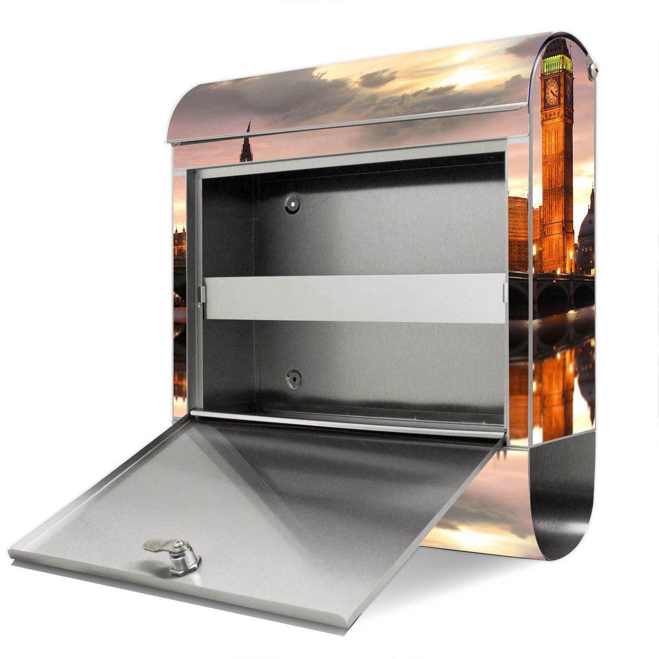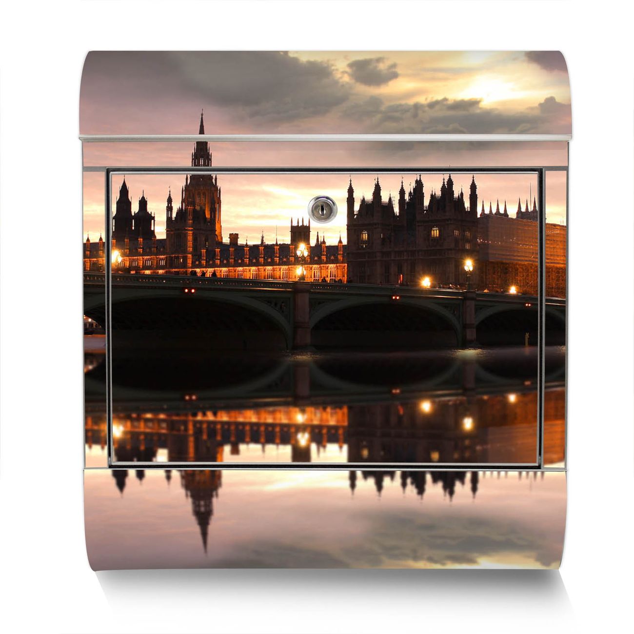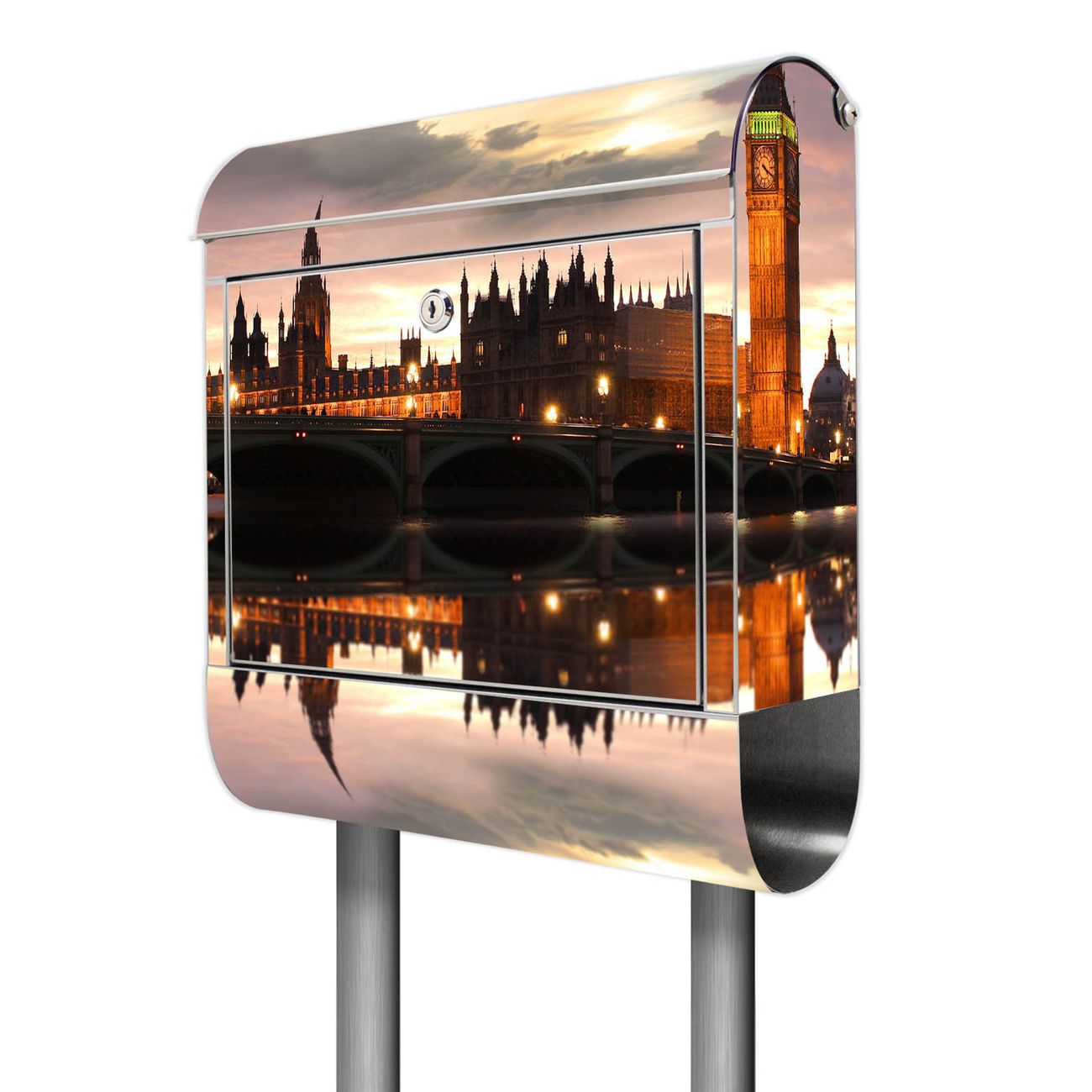 Der Motivstandbriefkasten hat ein sehr ansprechendes und ausgefallenes Design, damit entlocken Sie Ihren Nachbarn und dem Postboten ein Lächeln. Heben Sie Sich ab von der tristen grauen Masse, ohne auf Funktionalität zu verzichten. Der Briefkasten besteht aus hochwertigem 18/0 Edelstahl und die Wetter- und UV-resistenten Folie mit Palace of Westminster Motiv ist zusätzlich mit einem Schutzlaminat überzogen. Der Standbriefkasten wird mit Montagematerial und zwei Schlüsseln geliefert.