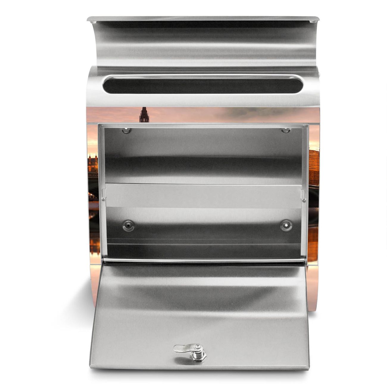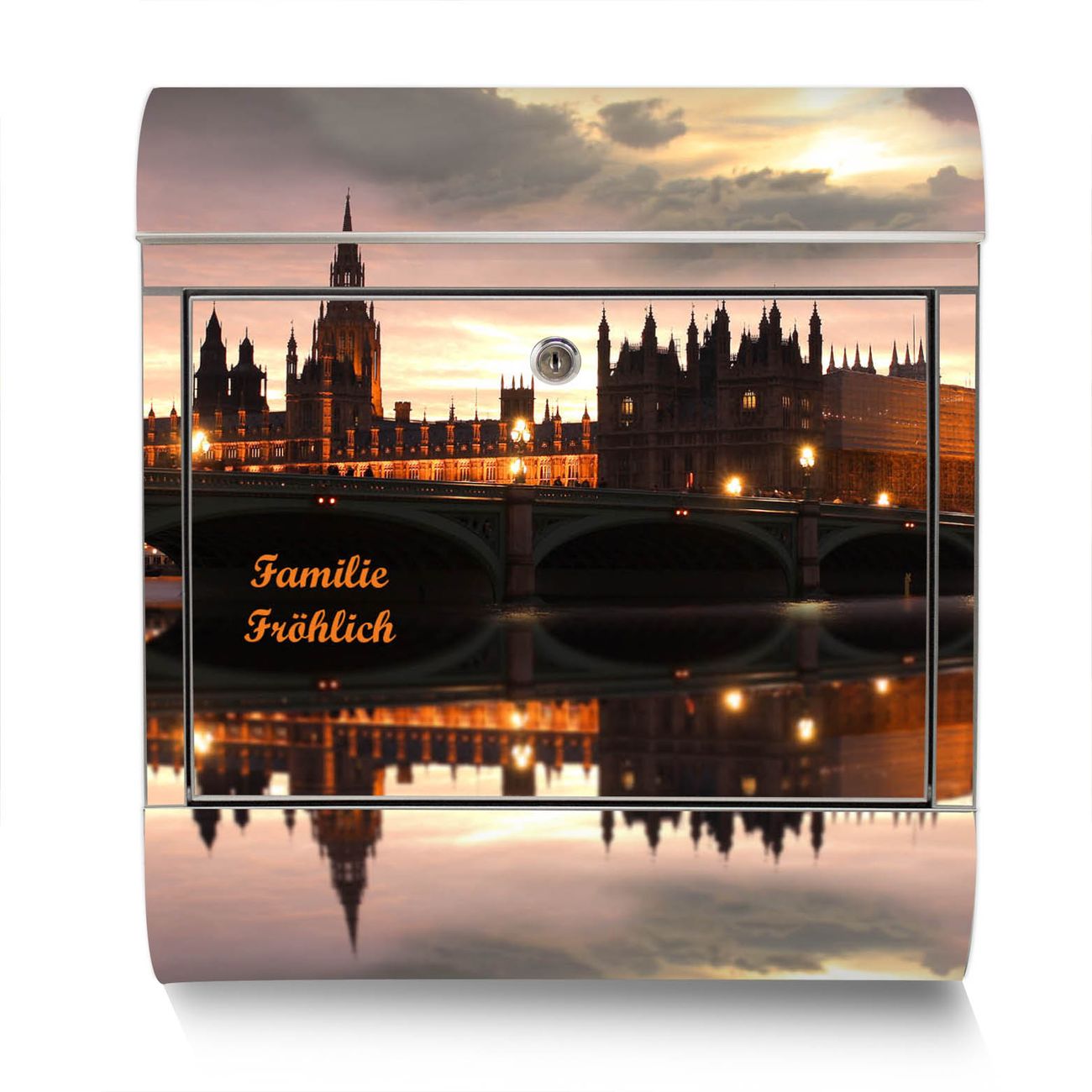 Der banjado Edelstahl Standbriefkasten mit Motiv Palace of Westminster und eigenem Wunschtext bietet Ihnen mit seinem Fassungsvermögen genügend Platz auch für große A4 Sendungen. Das integrierte Zeitungsfach eignet sich hervorragend, um unkompliziert die Tageszeitung zu fassen.