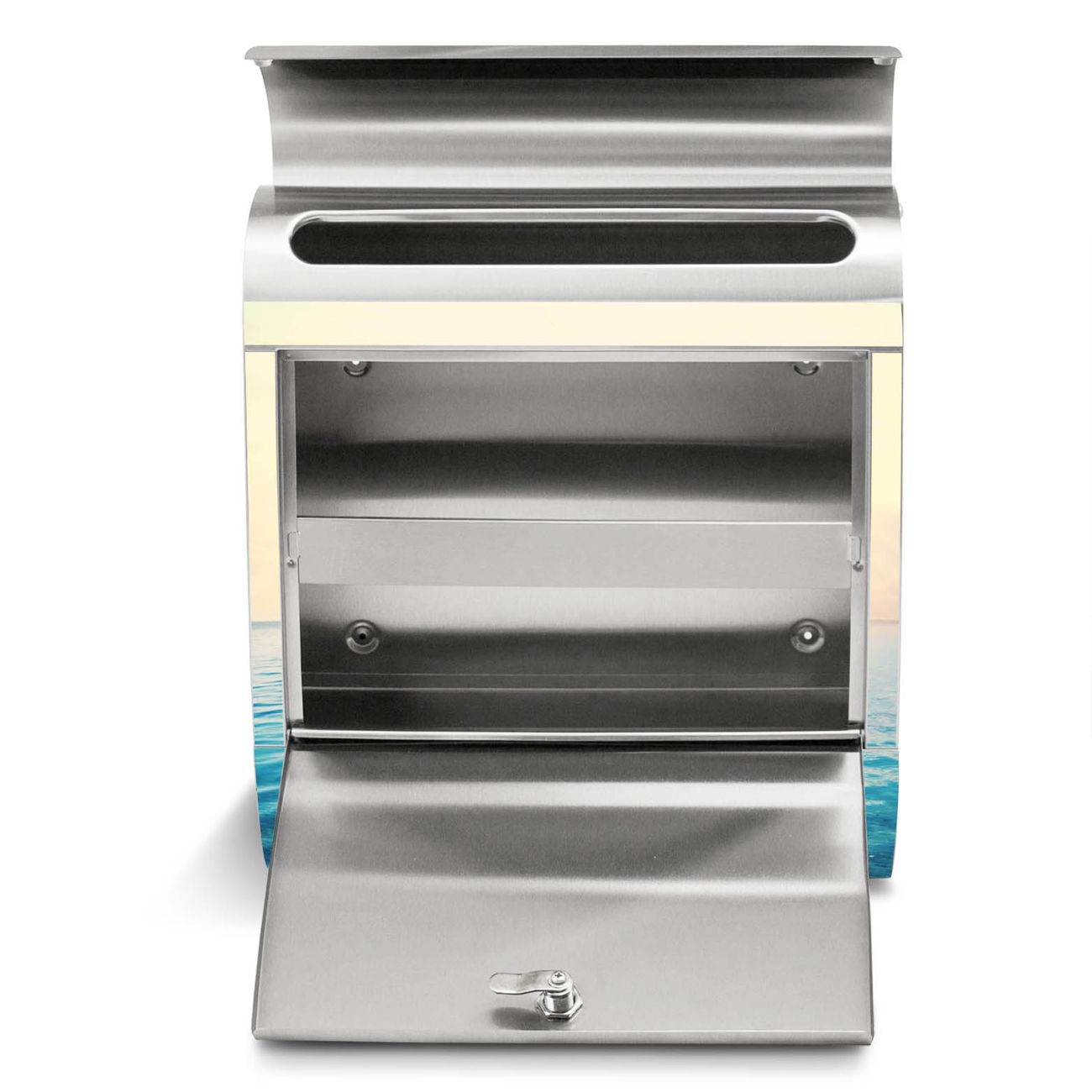 Der banjado Edelstahl Standbriefkasten mit Motiv Paradis und eigenem Wunschtext bietet Ihnen mit seinem Fassungsvermögen genügend Platz auch für große A4 Sendungen. Das integrierte Zeitungsfach eignet sich hervorragend, um unkompliziert die Tageszeitung zu fassen.