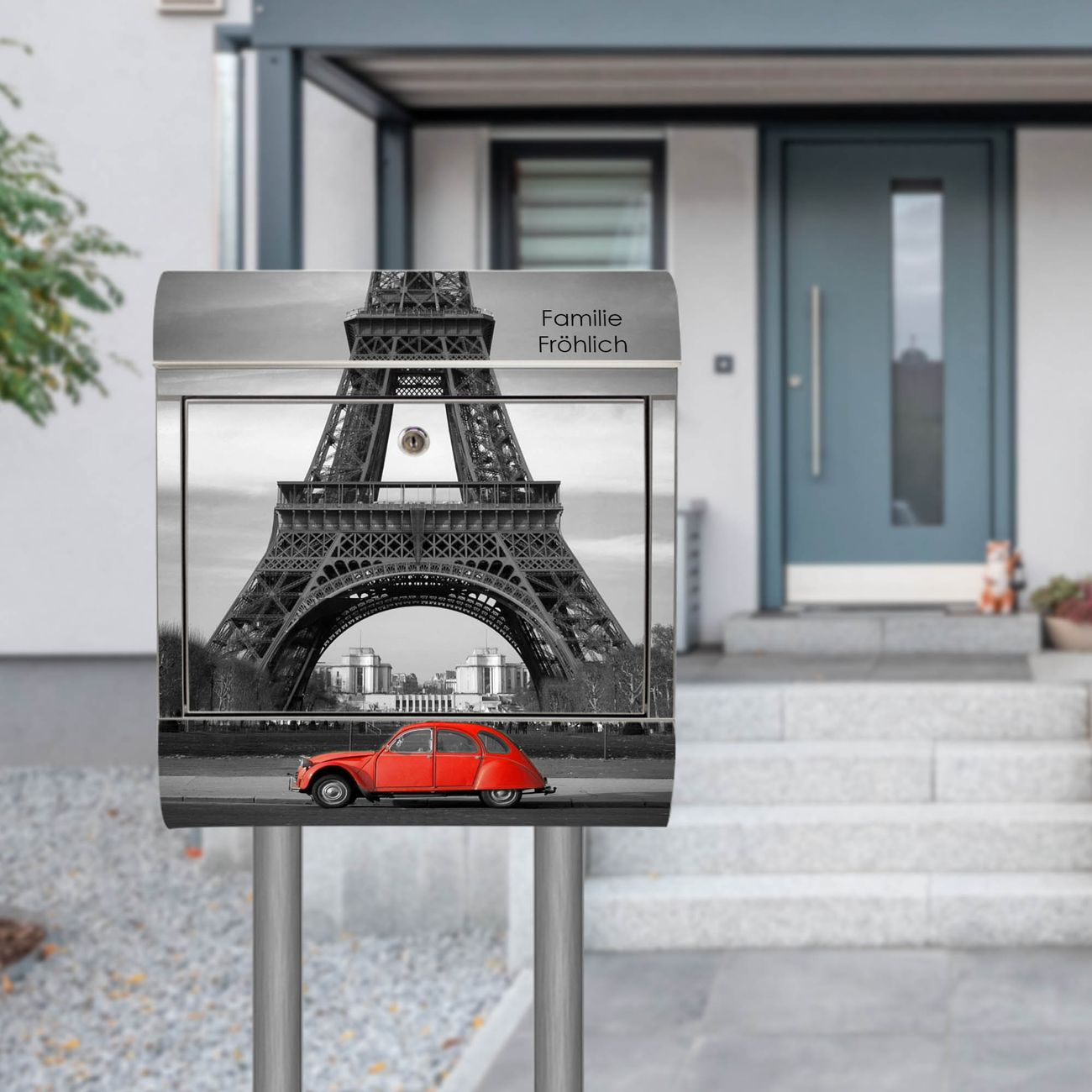 Der banjado Edelstahl Standbriefkasten mit Motiv Paris und eigenem Wunschtext bietet Ihnen mit seinem Fassungsvermögen genügend Platz auch für große A4 Sendungen. Das integrierte Zeitungsfach eignet sich hervorragend, um unkompliziert die Tageszeitung zu fassen.