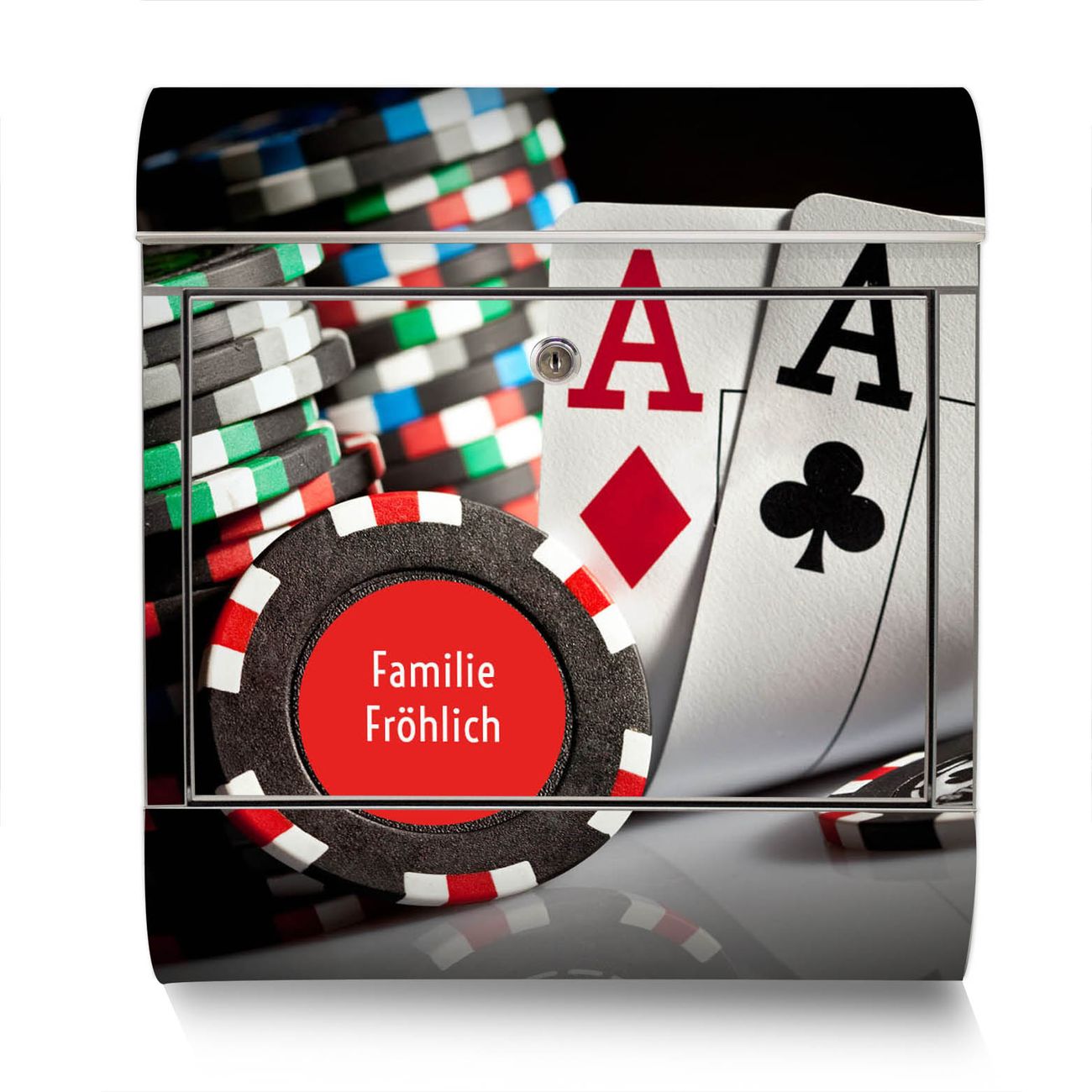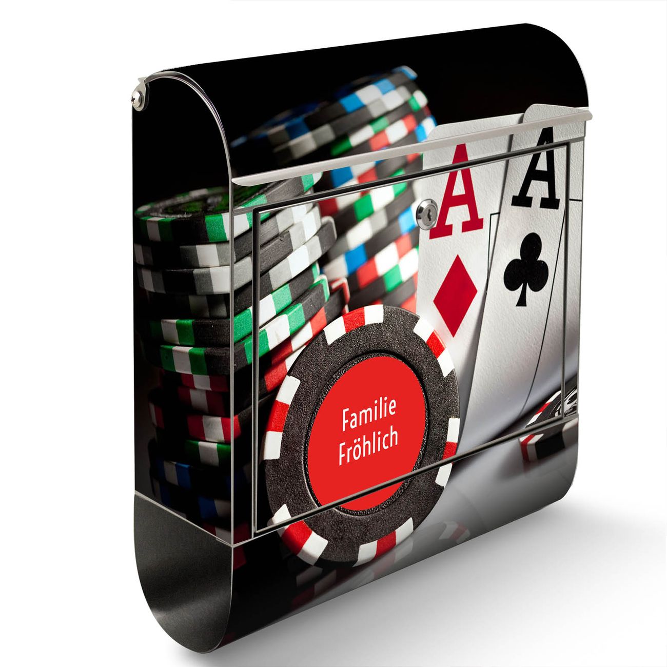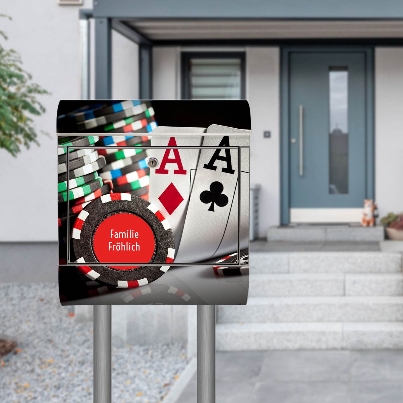 Der banjado Edelstahl Standbriefkasten mit Motiv Poker und eigenem Wunschtext bietet Ihnen mit seinem Fassungsvermögen genügend Platz auch für große A4 Sendungen. Das integrierte Zeitungsfach eignet sich hervorragend, um unkompliziert die Tageszeitung zu fassen.