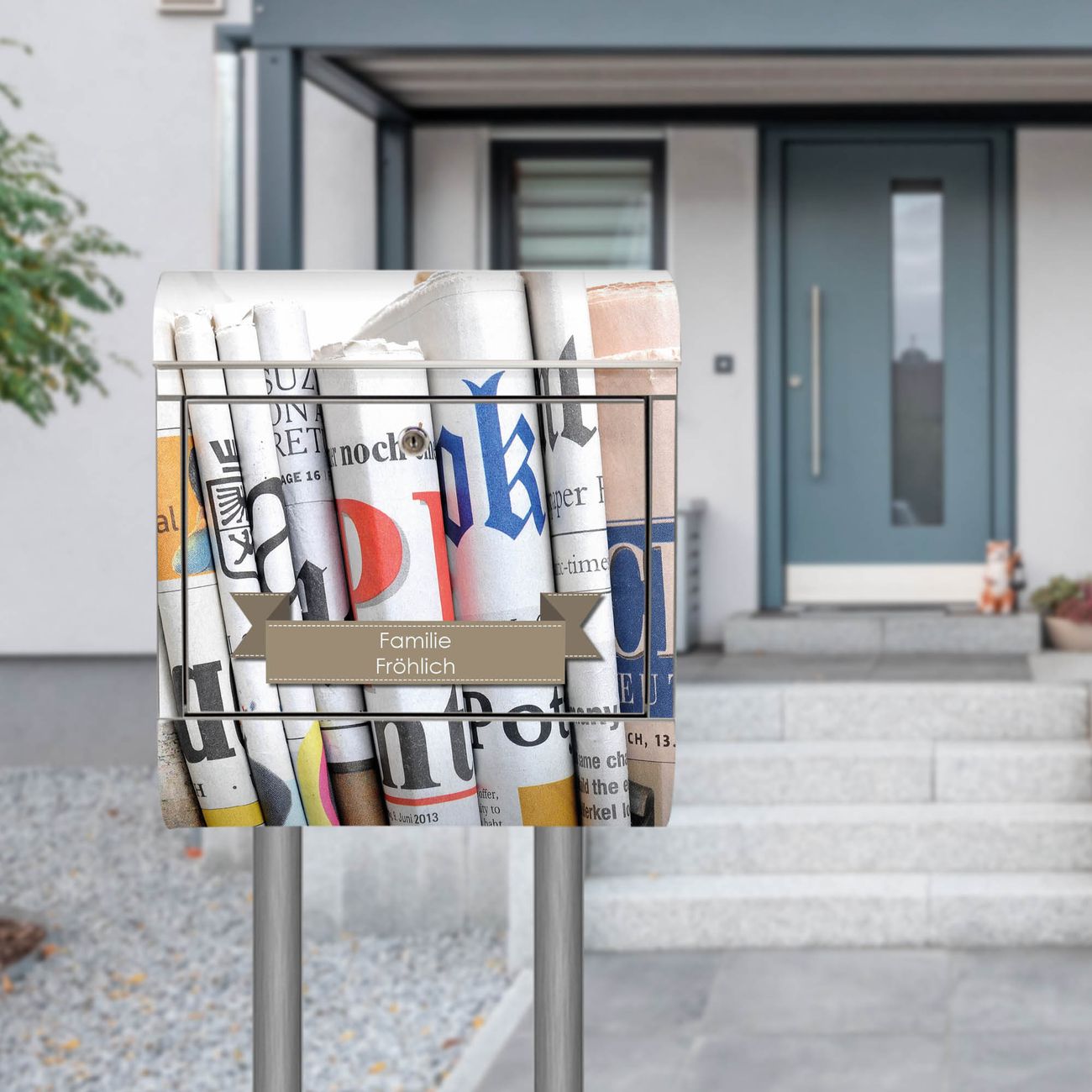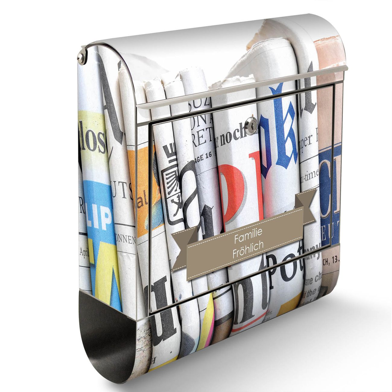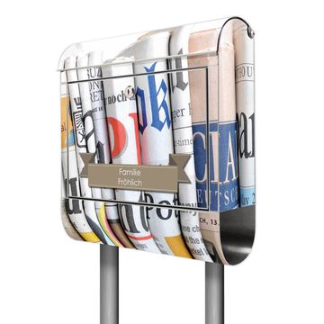 Der banjado Edelstahl Standbriefkasten mit Motiv Presse und eigenem Wunschtext bietet Ihnen mit seinem Fassungsvermögen genügend Platz auch für große A4 Sendungen. Das integrierte Zeitungsfach eignet sich hervorragend, um unkompliziert die Tageszeitung zu fassen.
