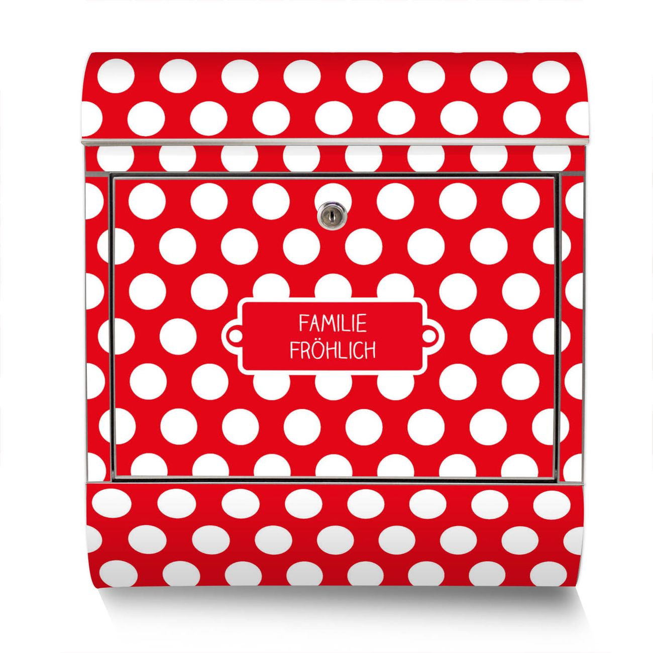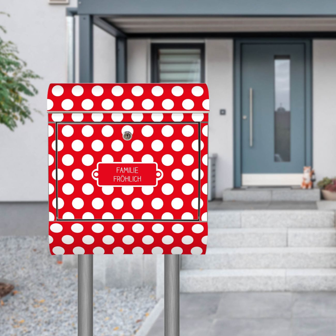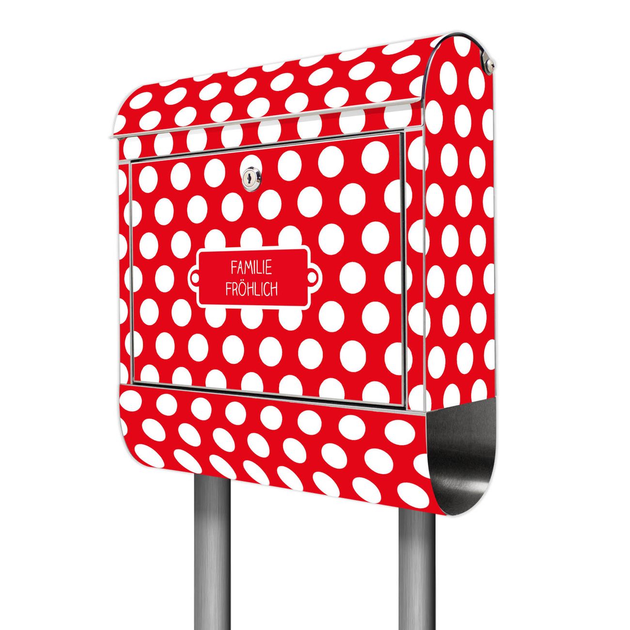 Der banjado Edelstahl Standbriefkasten mit Motiv Punkte Rot und eigenem Wunschtext bietet Ihnen mit seinem Fassungsvermögen genügend Platz auch für große A4 Sendungen. Das integrierte Zeitungsfach eignet sich hervorragend, um unkompliziert die Tageszeitung zu fassen.