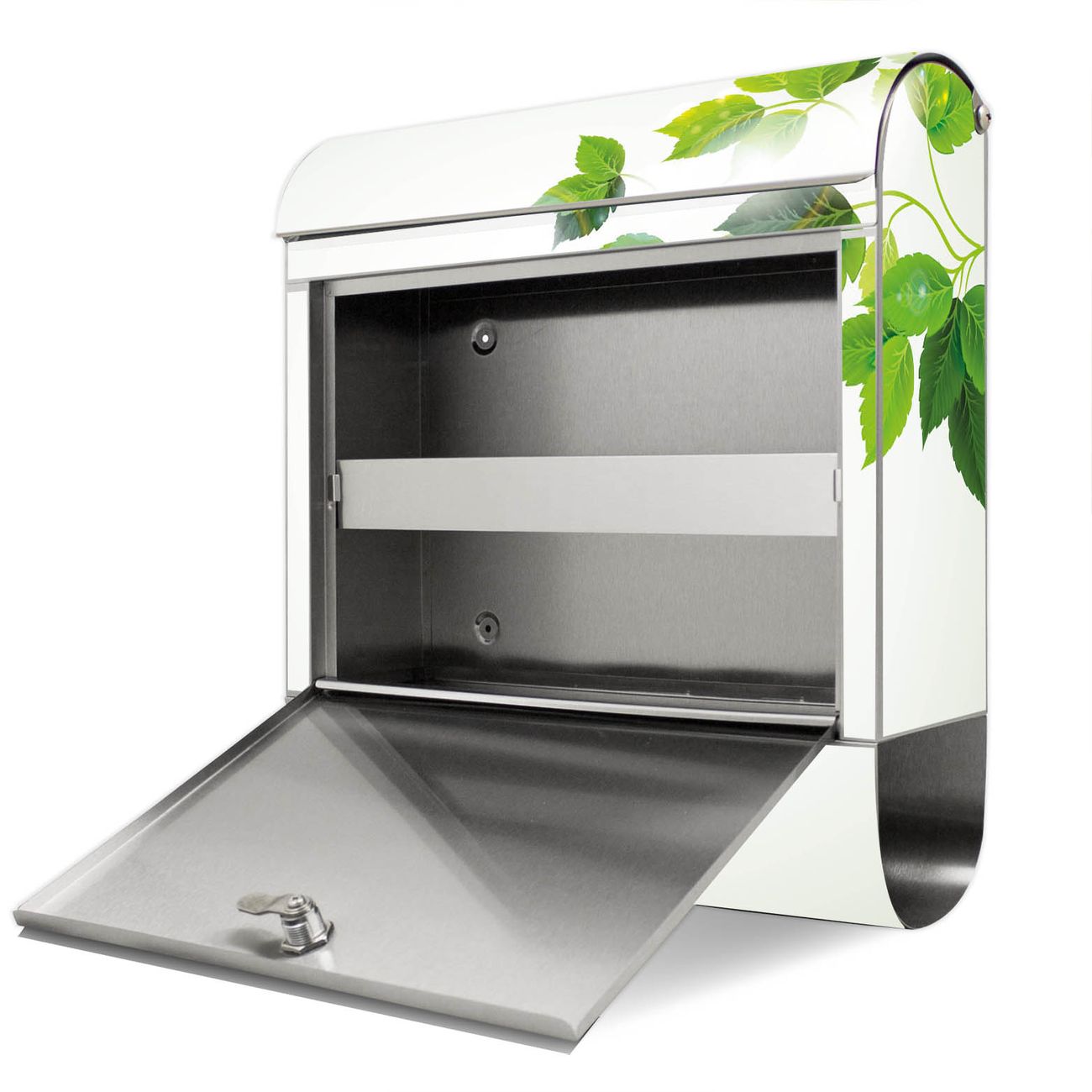 Der banjado Edelstahl Standbriefkasten mit Motiv Ranke Gelb Weiß und eigenem Wunschtext bietet Ihnen mit seinem Fassungsvermögen genügend Platz auch für große A4 Sendungen. Das integrierte Zeitungsfach eignet sich hervorragend, um unkompliziert die Tageszeitung zu fassen.