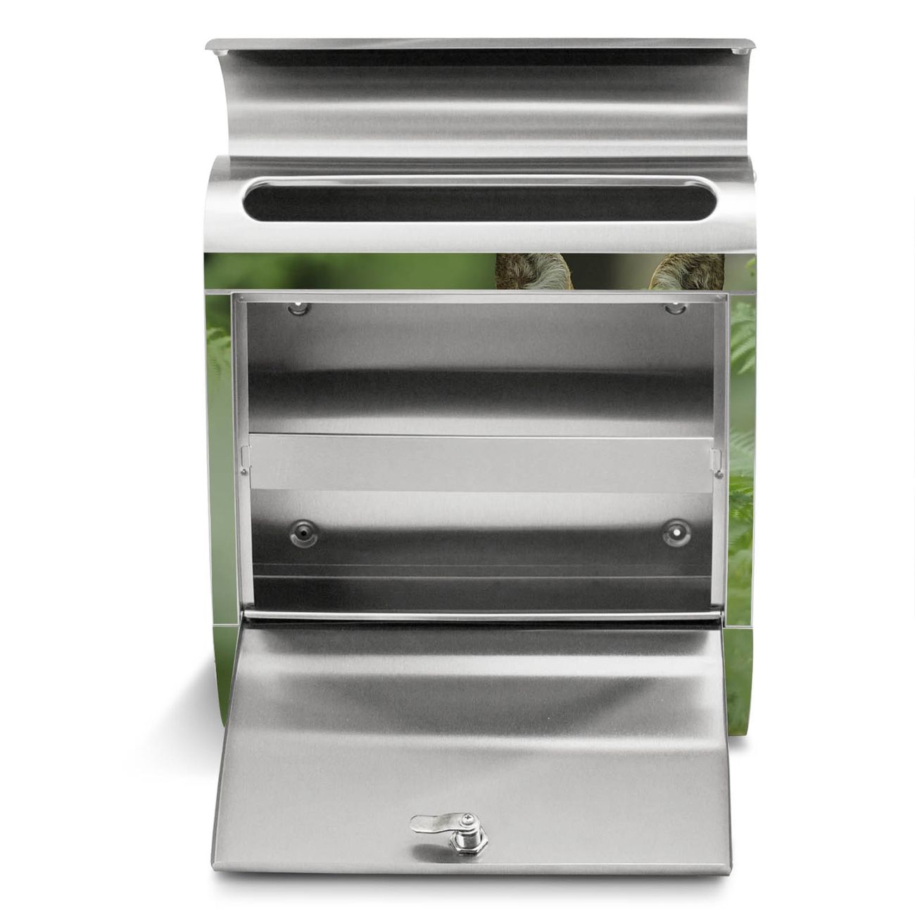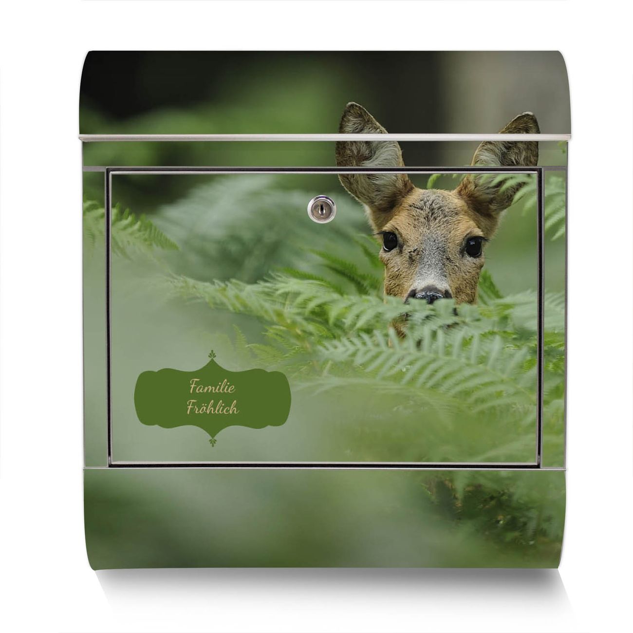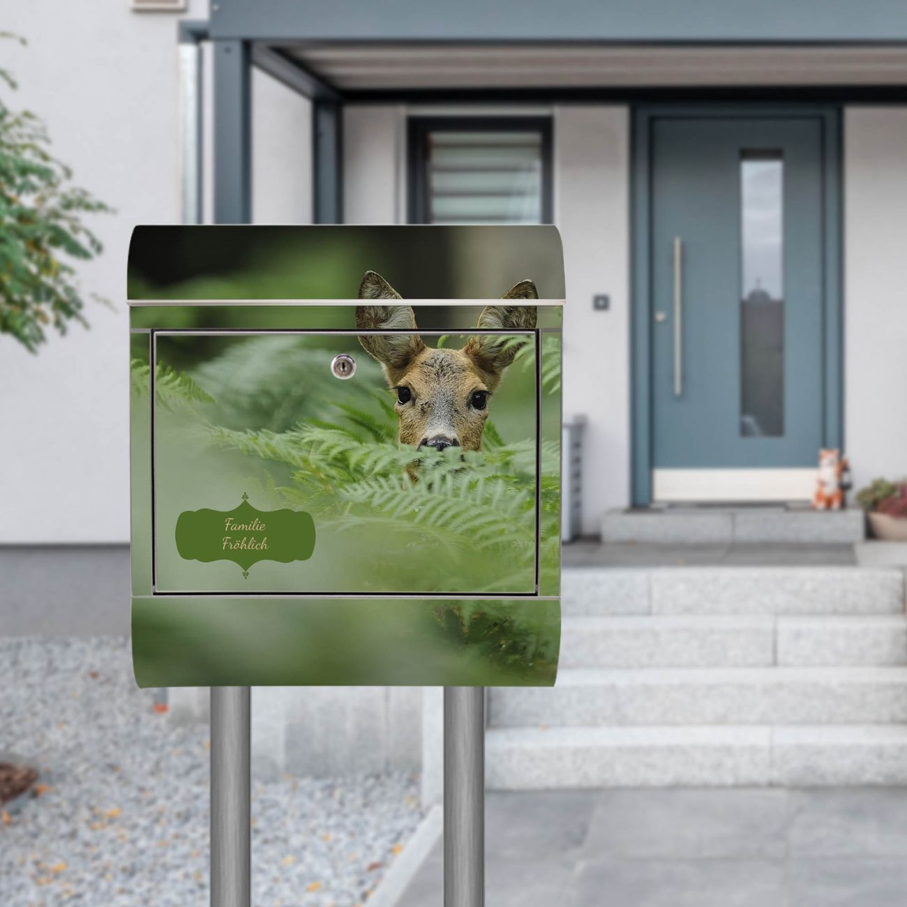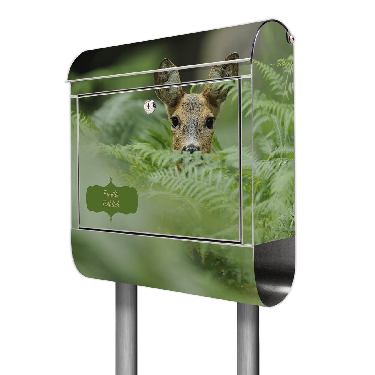 Der banjado Edelstahl Standbriefkasten mit Motiv Reh und eigenem Wunschtext bietet Ihnen mit seinem Fassungsvermögen genügend Platz auch für große A4 Sendungen. Das integrierte Zeitungsfach eignet sich hervorragend, um unkompliziert die Tageszeitung zu fassen.