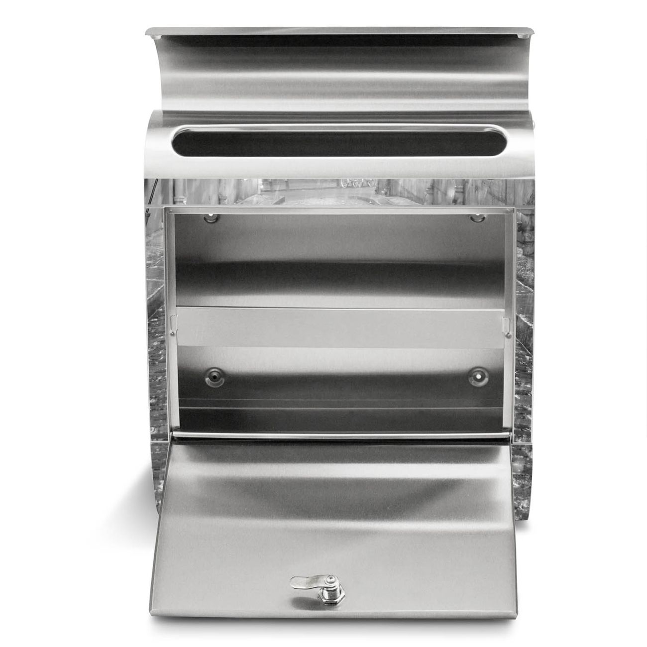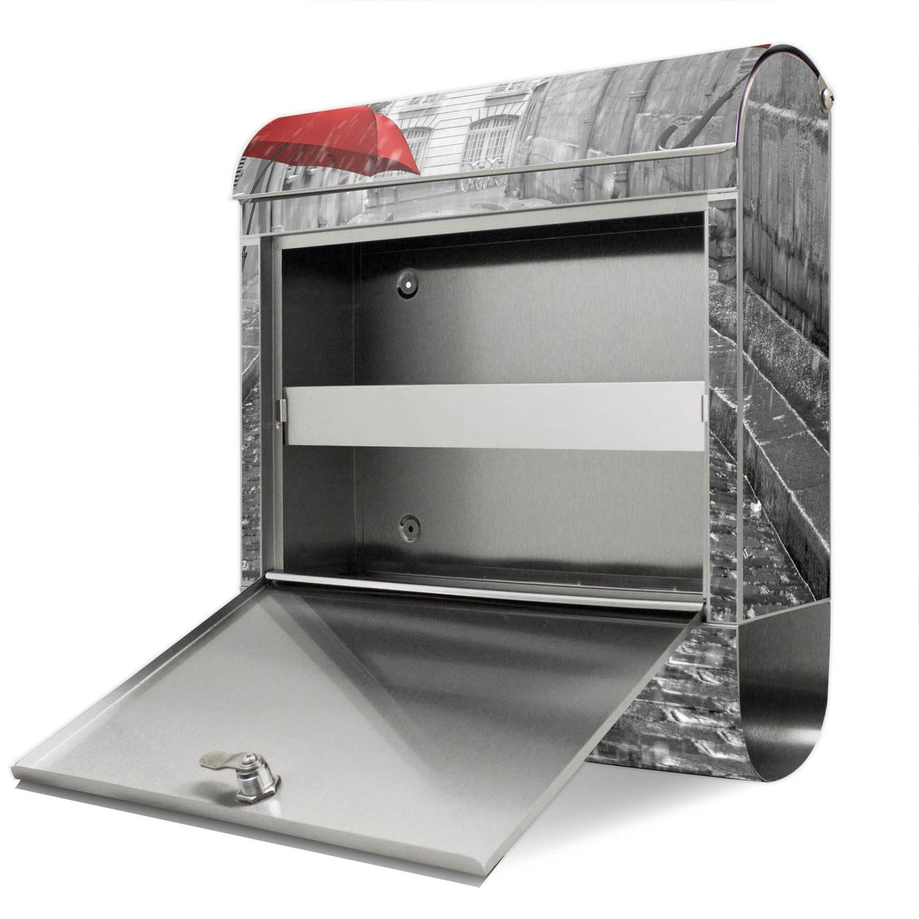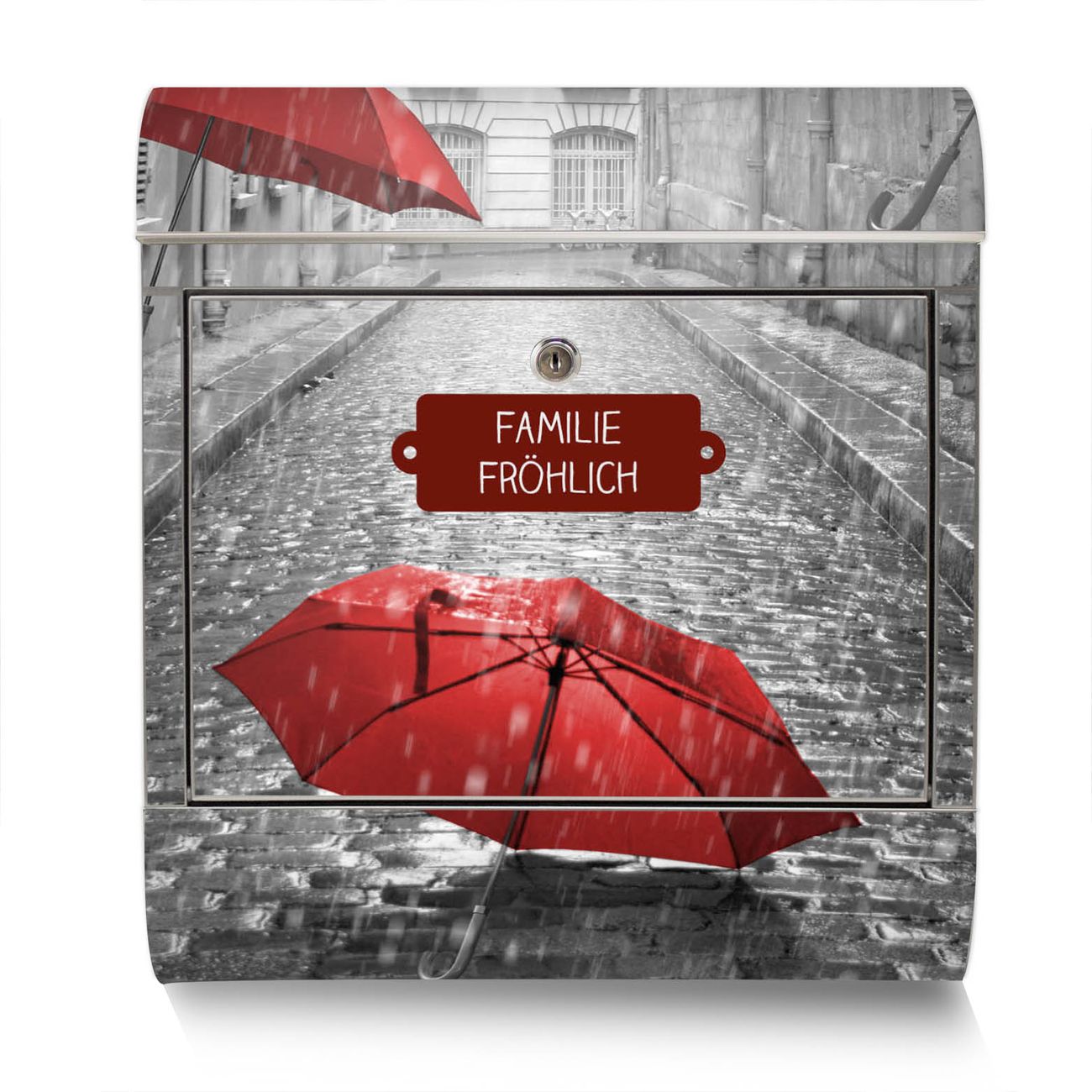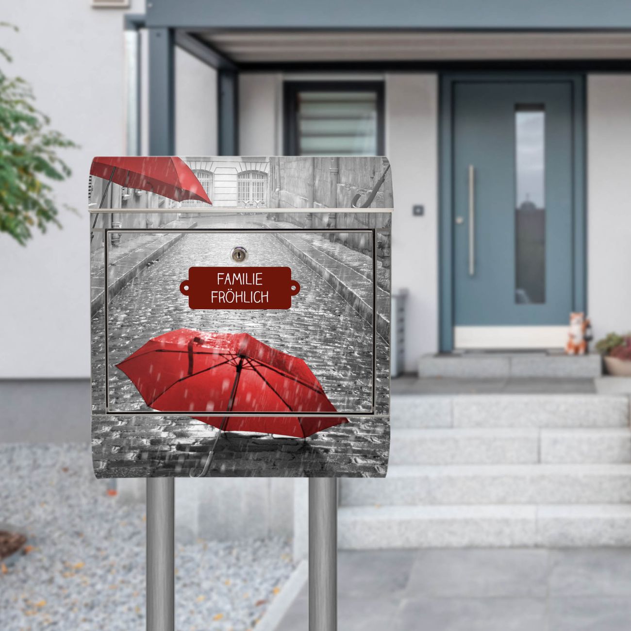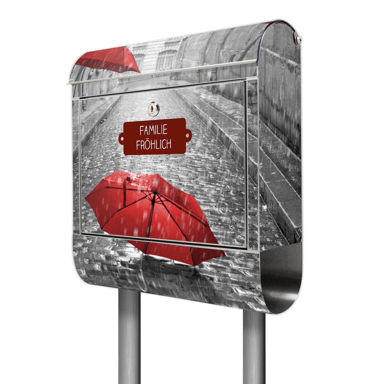 Der banjado Edelstahl Standbriefkasten mit Motiv Rote Schirme und eigenem Wunschtext bietet Ihnen mit seinem Fassungsvermögen genügend Platz auch für große A4 Sendungen. Das integrierte Zeitungsfach eignet sich hervorragend, um unkompliziert die Tageszeitung zu fassen.