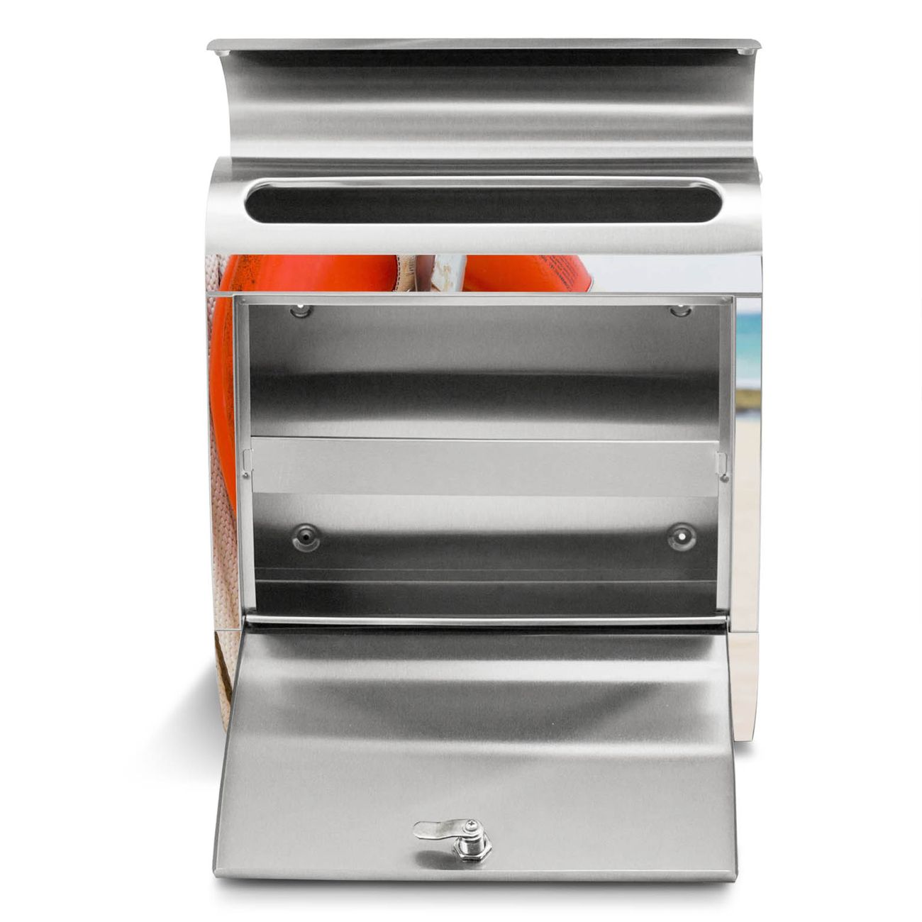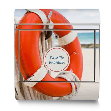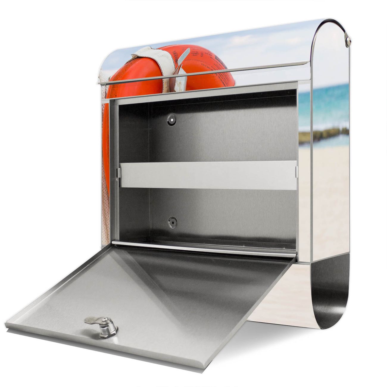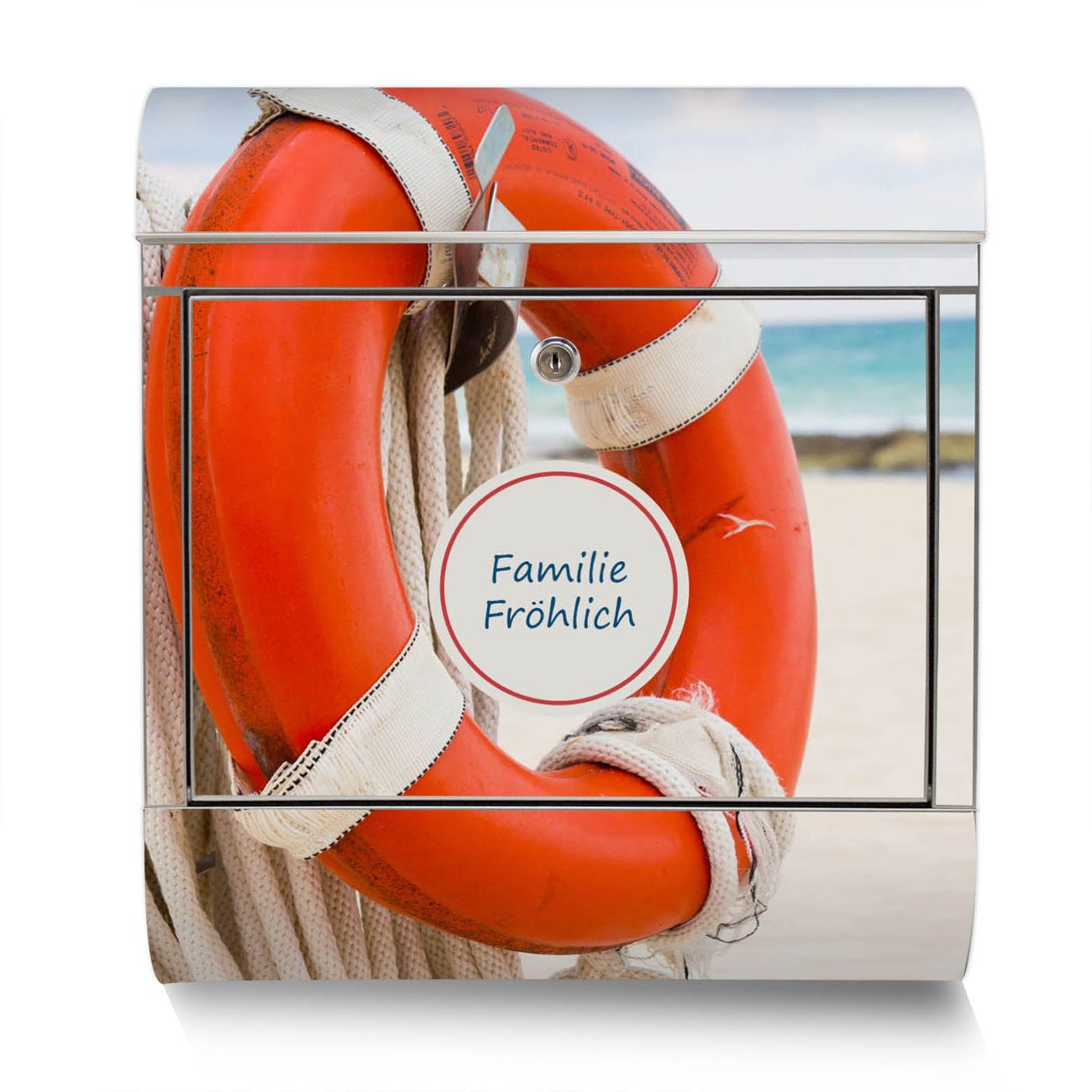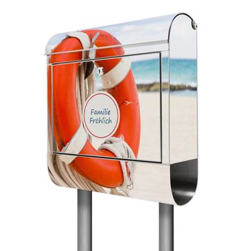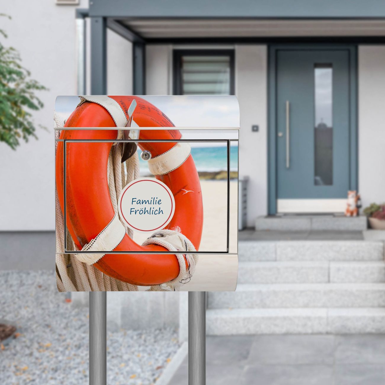 Der banjado Edelstahl Standbriefkasten mit Motiv Roter Rettungsring und eigenem Wunschtext bietet Ihnen mit seinem Fassungsvermögen genügend Platz auch für große A4 Sendungen. Das integrierte Zeitungsfach eignet sich hervorragend, um unkompliziert die Tageszeitung zu fassen.