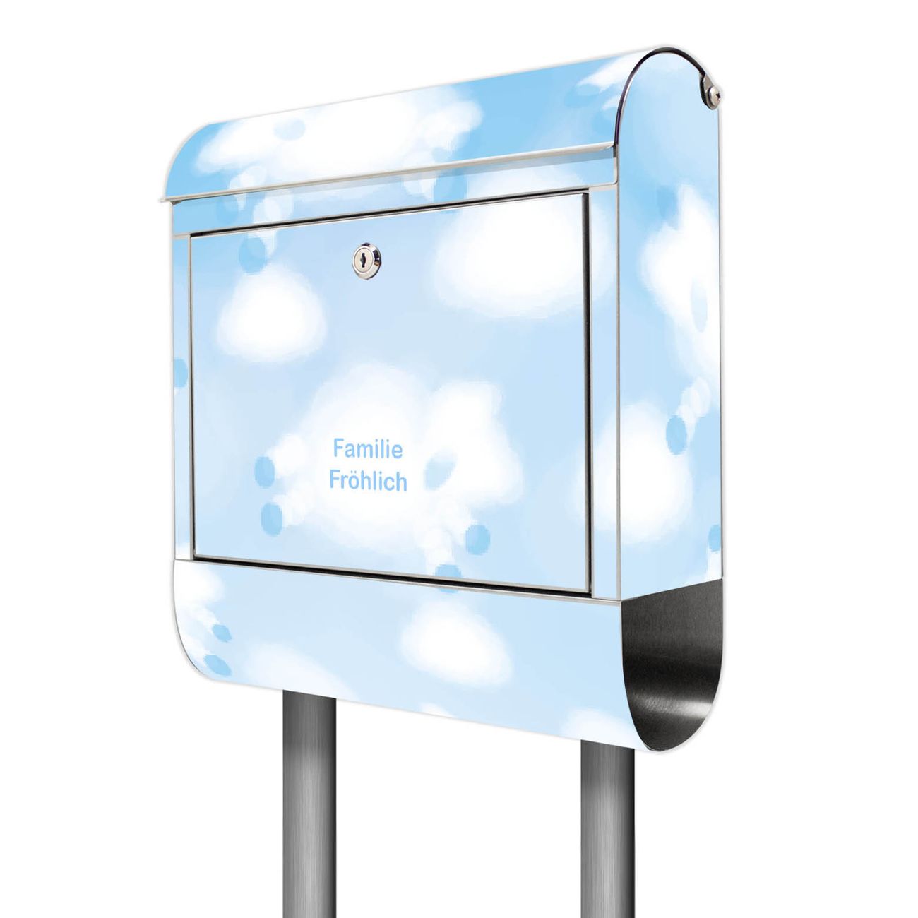 Der banjado Edelstahl Standbriefkasten mit Motiv Schäfchenwolken und eigenem Wunschtext bietet Ihnen mit seinem Fassungsvermögen genügend Platz auch für große A4 Sendungen. Das integrierte Zeitungsfach eignet sich hervorragend, um unkompliziert die Tageszeitung zu fassen.