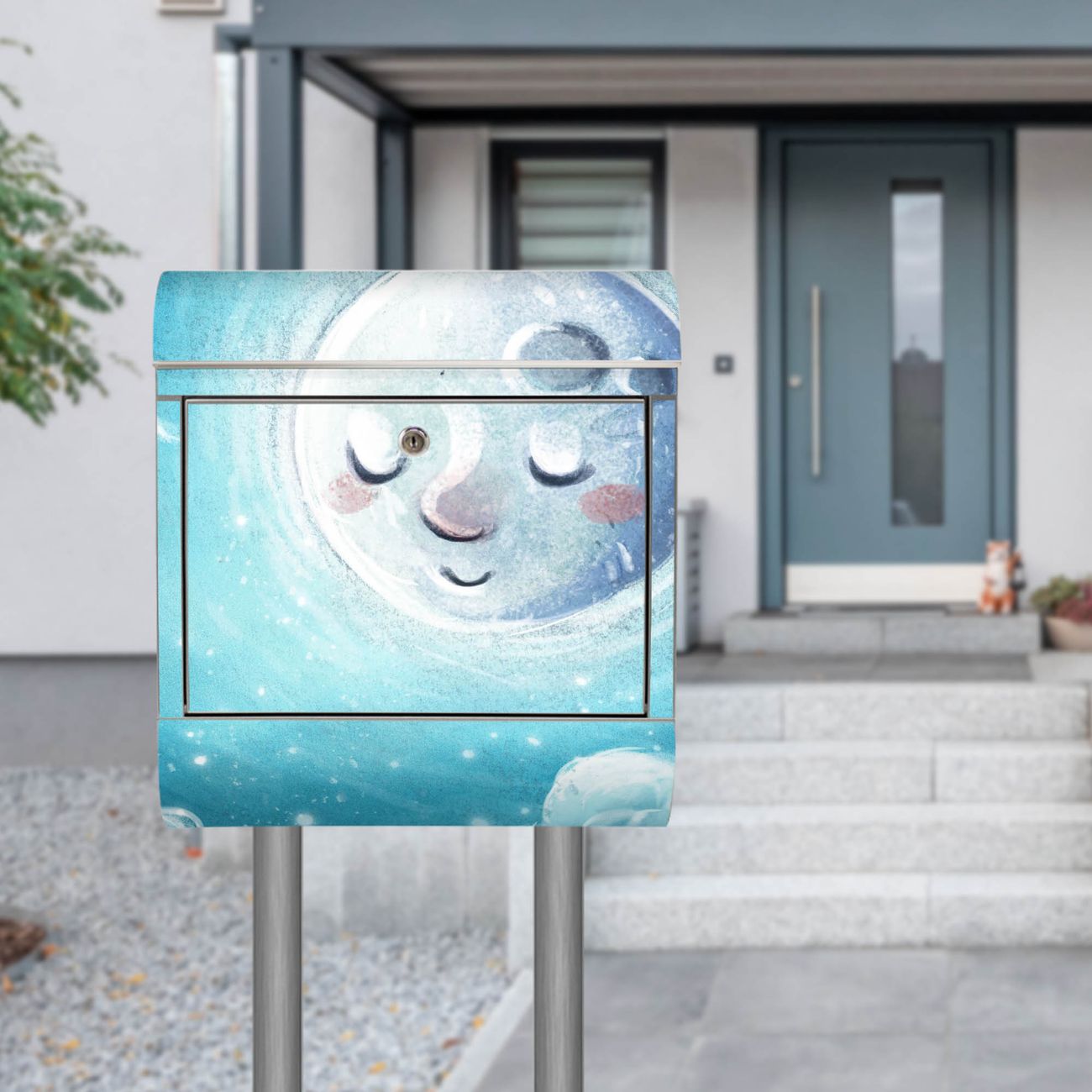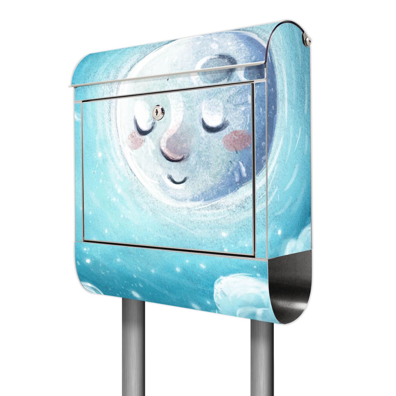 Der Motivstandbriefkasten hat ein sehr ansprechendes und ausgefallenes Design, damit entlocken Sie Ihren Nachbarn und dem Postboten ein Lächeln. Heben Sie Sich ab von der tristen grauen Masse, ohne auf Funktionalität zu verzichten. Der Briefkasten besteht aus hochwertigem 18/0 Edelstahl und die Wetter- und UV-resistenten Folie mit schlafender Mond Motiv ist zusätzlich mit einem Schutzlaminat überzogen. Der Standbriefkasten wird mit Montagematerial und zwei Schlüsseln geliefert.