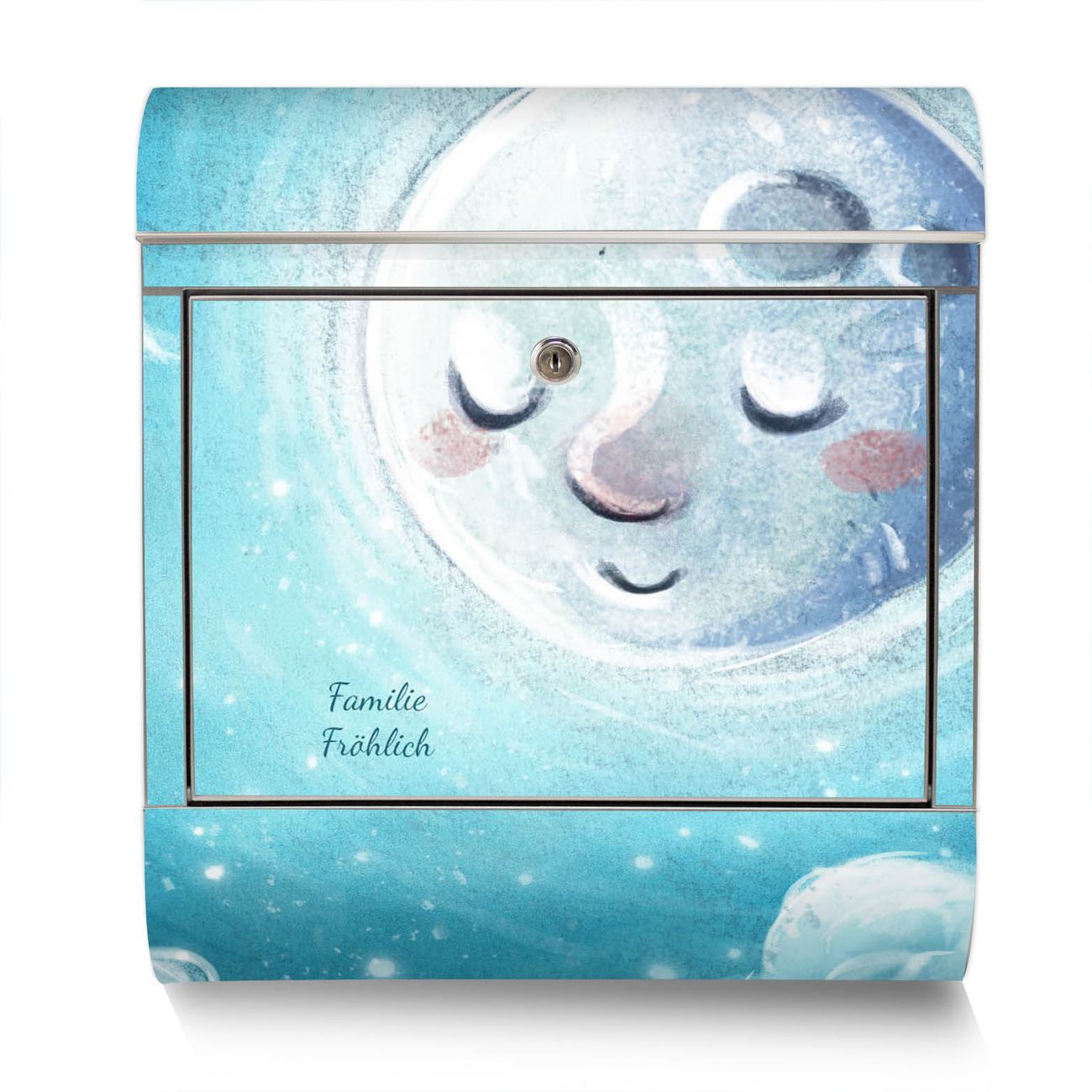Der Motivstandbriefkasten hat ein sehr ansprechendes und ausgefallenes Design, damit entlocken Sie Ihren Nachbarn und dem Postboten ein Lächeln. Heben Sie Sich ab von der tristen grauen Masse, ohne auf Funktionalität zu verzichten. Der Briefkasten besteht aus hochwertigem 18/0 Edelstahl und die Wetter- und UV-resistenten Folie mit schlafender Mond Motiv ist zusätzlich mit einem Schutzlaminat überzogen. Der Standbriefkasten wird mit Montagematerial und zwei Schlüsseln geliefert.