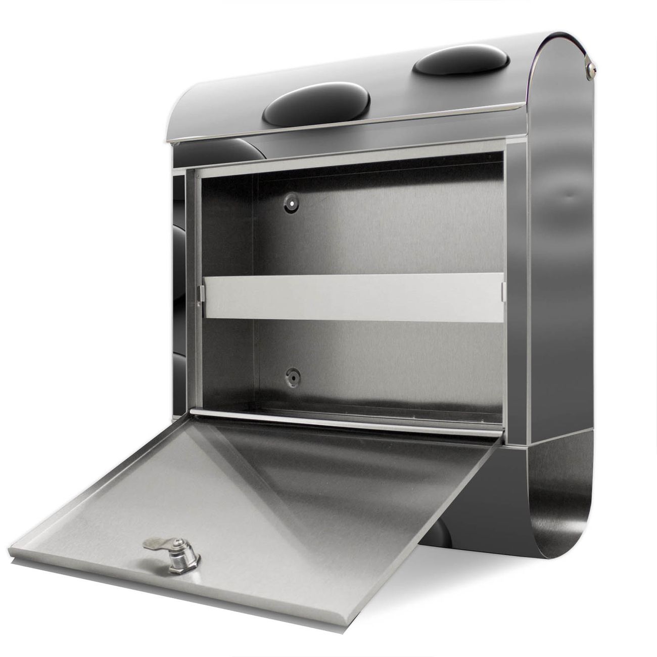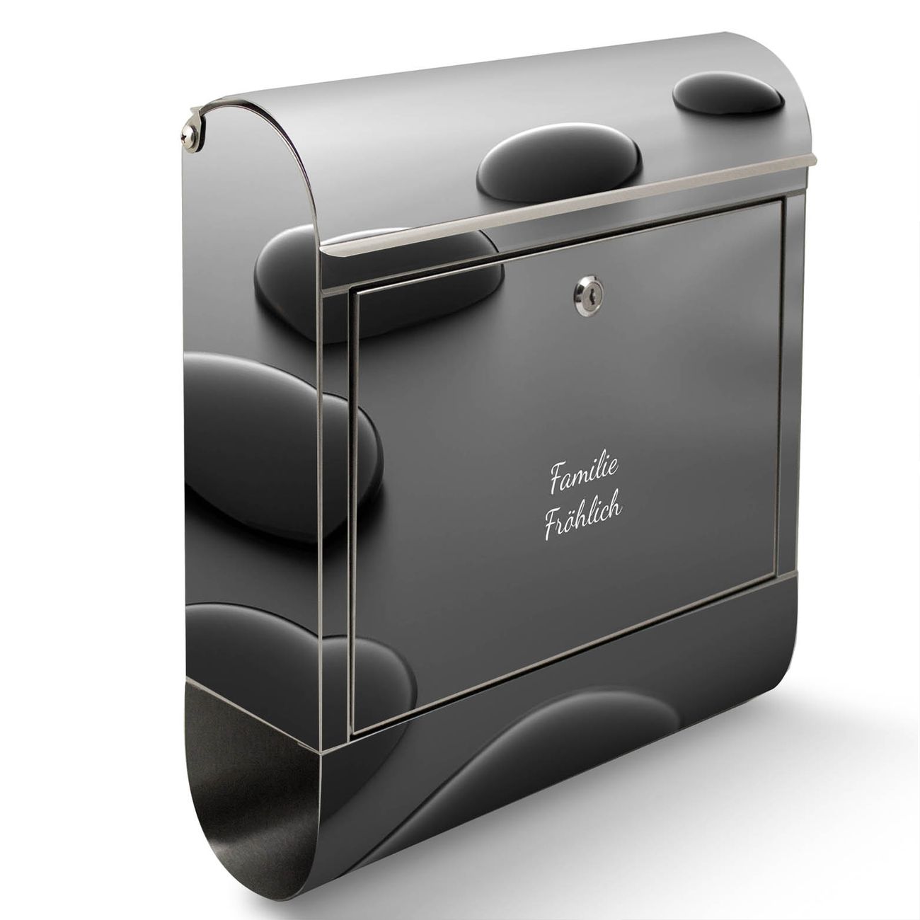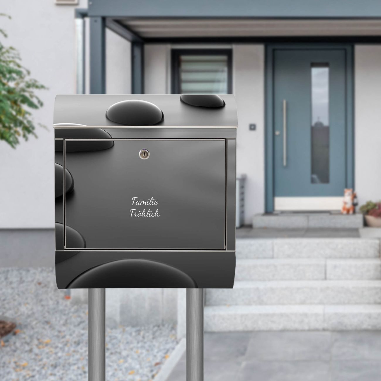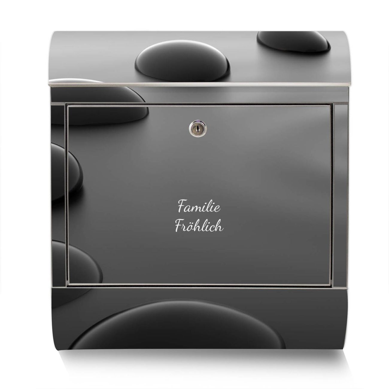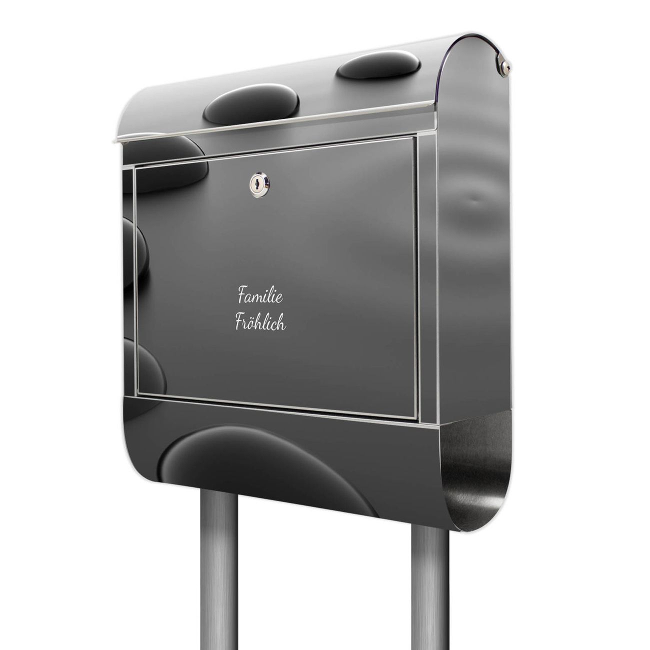 Der banjado Edelstahl Standbriefkasten mit Motiv Schwarze Steine und eigenem Wunschtext bietet Ihnen mit seinem Fassungsvermögen genügend Platz auch für große A4 Sendungen. Das integrierte Zeitungsfach eignet sich hervorragend, um unkompliziert die Tageszeitung zu fassen.