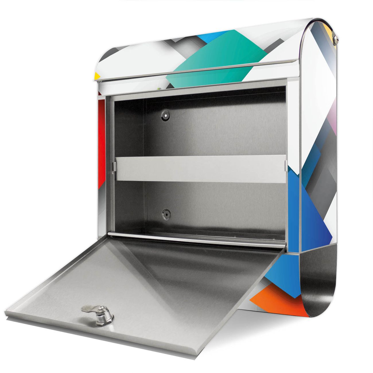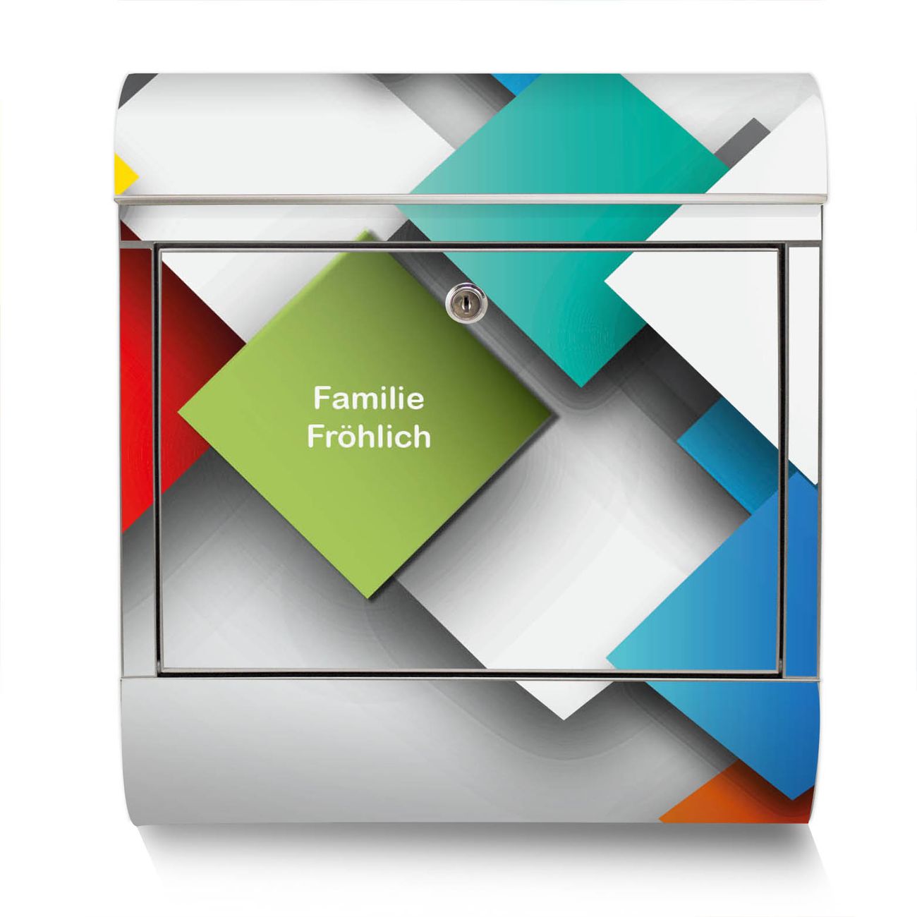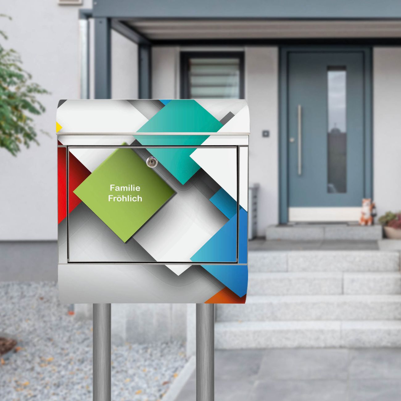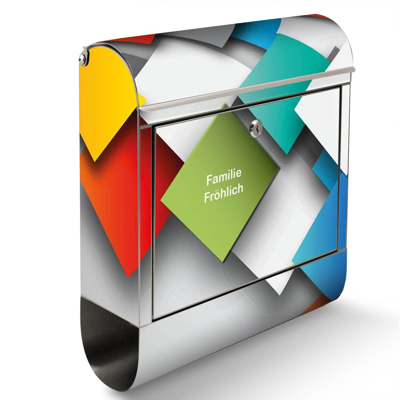 Der Motivstandbriefkasten hat ein sehr ansprechendes und ausgefallenes Design, damit entlocken Sie Ihren Nachbarn und dem Postboten ein Lächeln. Heben Sie Sich ab von der tristen grauen Masse, ohne auf Funktionalität zu verzichten. Der Briefkasten besteht aus hochwertigem 18/0 Edelstahl und die Wetter- und UV-resistenten Folie mit Schwebende Quadrate Motiv ist zusätzlich mit einem Schutzlaminat überzogen. Der Standbriefkasten wird mit Montagematerial und zwei Schlüsseln geliefert.