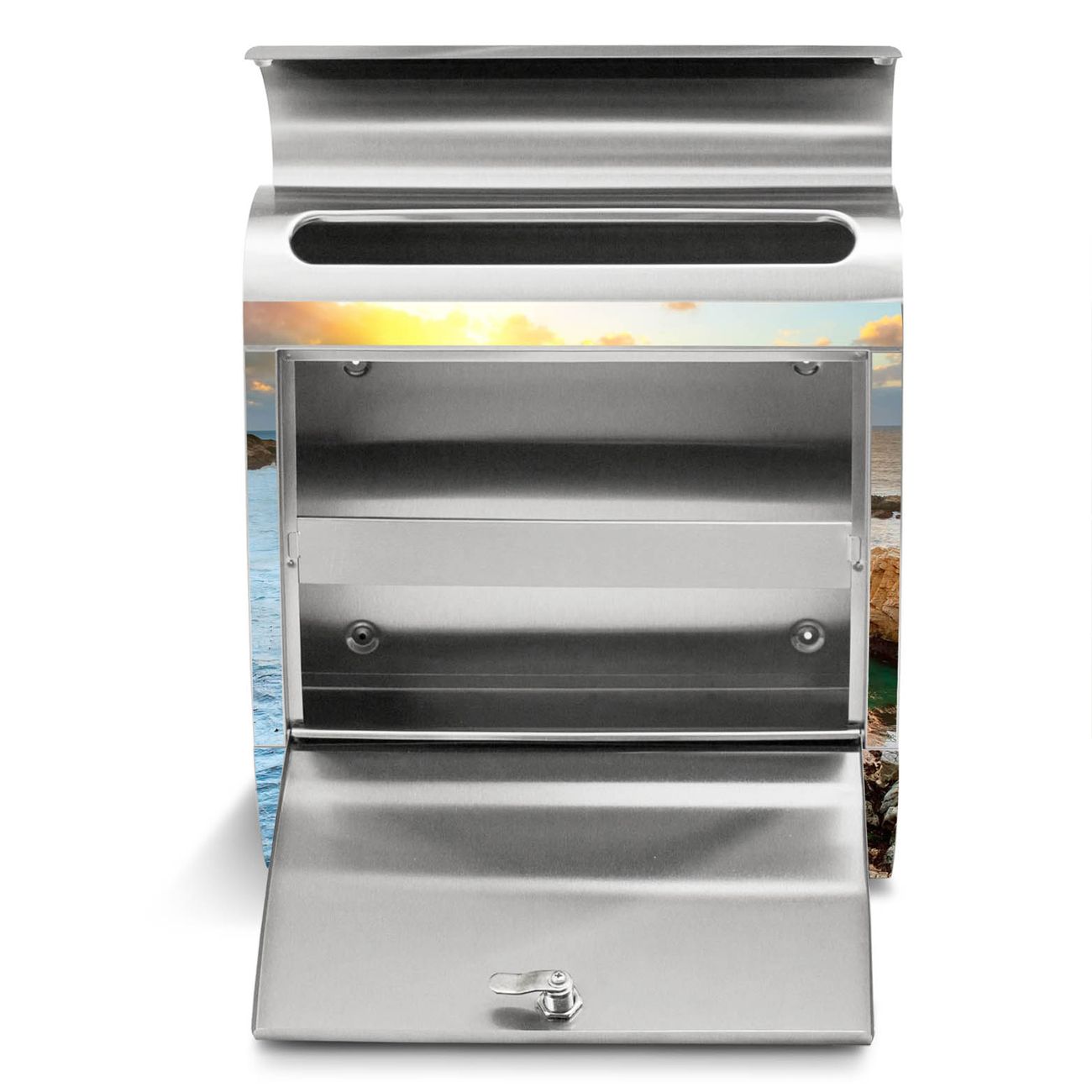 Der Motivstandbriefkasten hat ein sehr ansprechendes und ausgefallenes Design, damit entlocken Sie Ihren Nachbarn und dem Postboten ein Lächeln. Heben Sie Sich ab von der tristen grauen Masse, ohne auf Funktionalität zu verzichten. Der Briefkasten besteht aus hochwertigem 18/0 Edelstahl und die Wetter- und UV-resistenten Folie mit Sonnenaufgang am Meer Motiv ist zusätzlich mit einem Schutzlaminat überzogen. Der Standbriefkasten wird mit Montagematerial und zwei Schlüsseln geliefert.