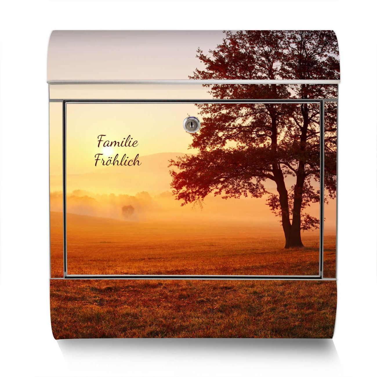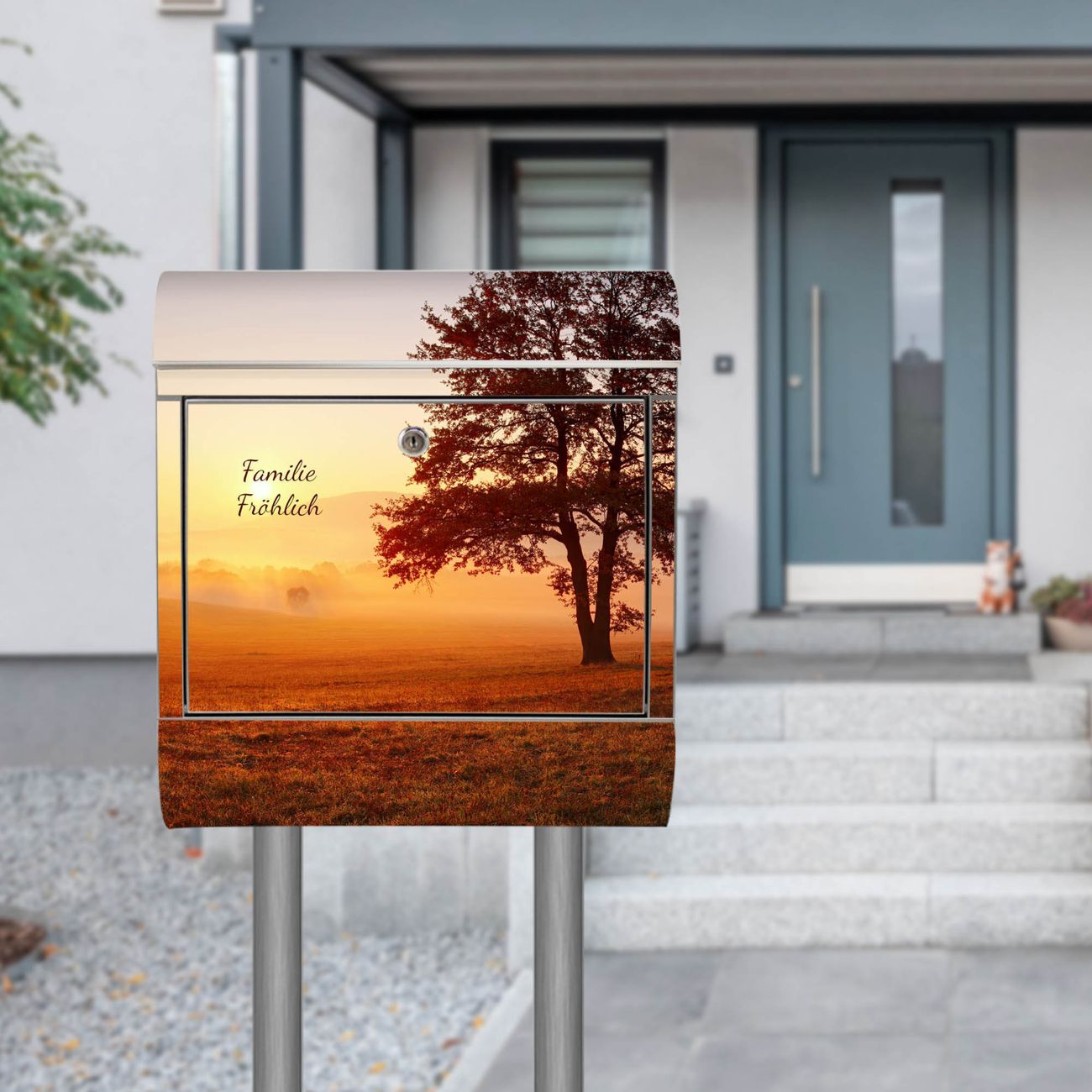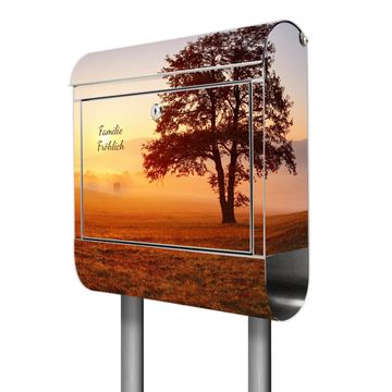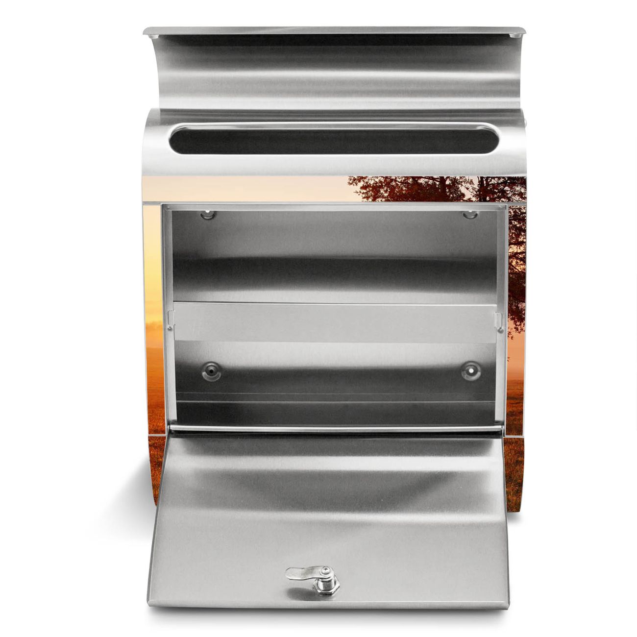 Der banjado Edelstahl Standbriefkasten mit Motiv Sonnenaufgang und eigenem Wunschtext bietet Ihnen mit seinem Fassungsvermögen genügend Platz auch für große A4 Sendungen. Das integrierte Zeitungsfach eignet sich hervorragend, um unkompliziert die Tageszeitung zu fassen.