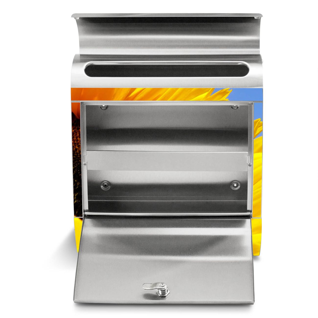 Der banjado Edelstahl Standbriefkasten mit Motiv Sonnenblume bietet Ihnen mit seinem Fassungsvermögen genügend Platz auch für große A4 Sendungen. Das integrierte Zeitungsfach eignet sich hervorragend, um unkompliziert die Tageszeitung zu fassen.