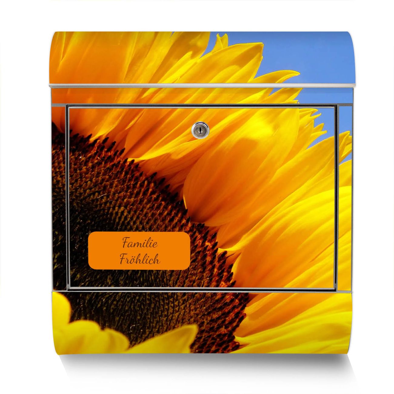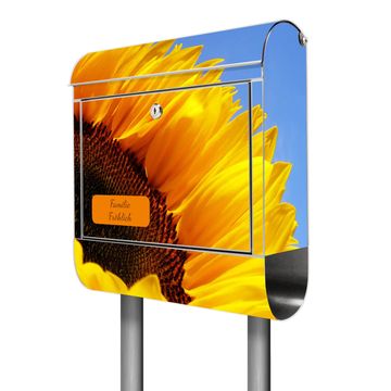 Der banjado Edelstahl Standbriefkasten mit Motiv Sonnenblume und eigenem Wunschtext bietet Ihnen mit seinem Fassungsvermögen genügend Platz auch für große A4 Sendungen. Das integrierte Zeitungsfach eignet sich hervorragend, um unkompliziert die Tageszeitung zu fassen.