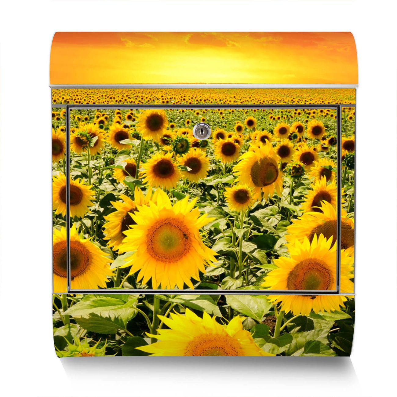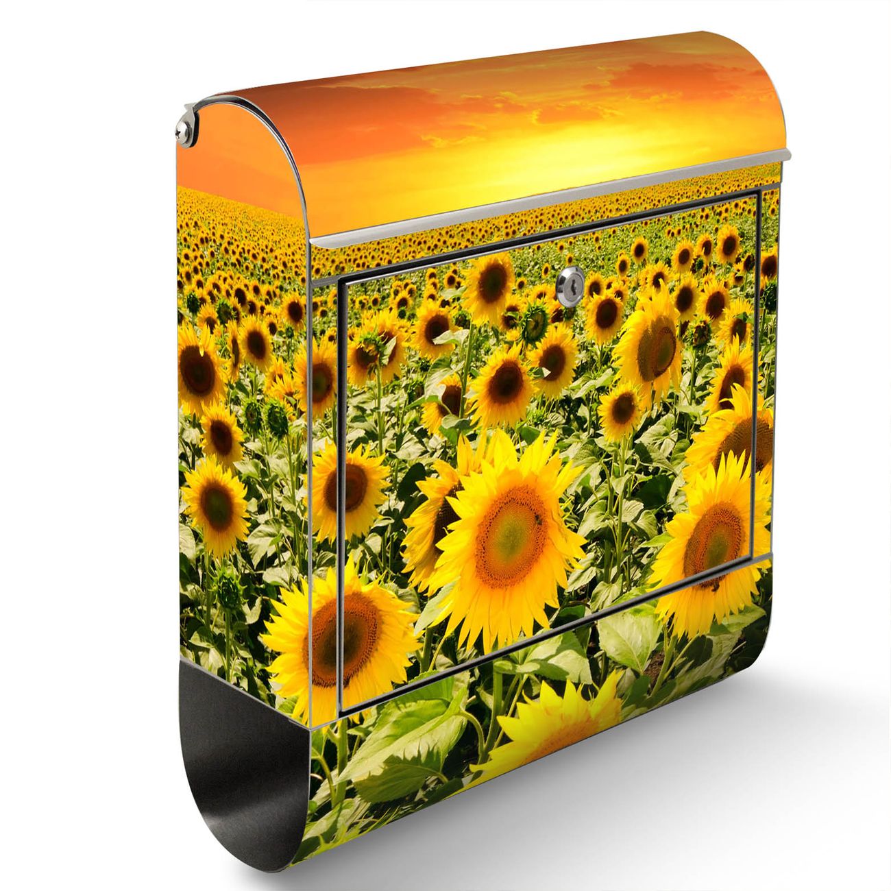 Der Motivstandbriefkasten hat ein sehr ansprechendes und ausgefallenes Design, damit entlocken Sie Ihren Nachbarn und dem Postboten ein Lächeln. Heben Sie Sich ab von der tristen grauen Masse, ohne auf Funktionalität zu verzichten. Der Briefkasten besteht aus hochwertigem 18/0 Edelstahl und die Wetter- und UV-resistenten Folie mit Sonnenblumenmeer Motiv ist zusätzlich mit einem Schutzlaminat überzogen. Der Standbriefkasten wird mit Montagematerial und zwei Schlüsseln geliefert.