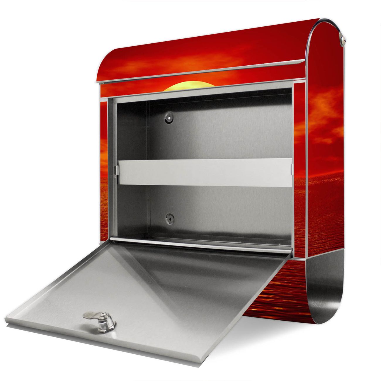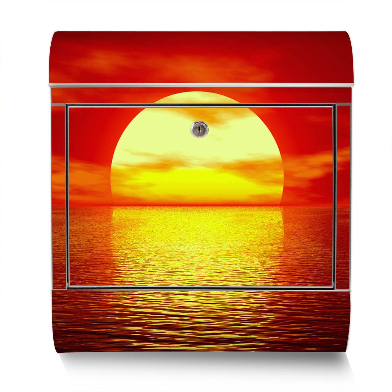 Der Motivstandbriefkasten hat ein sehr ansprechendes und ausgefallenes Design, damit entlocken Sie Ihren Nachbarn und dem Postboten ein Lächeln. Heben Sie Sich ab von der tristen grauen Masse, ohne auf Funktionalität zu verzichten. Der Briefkasten besteht aus hochwertigem 18/0 Edelstahl und die Wetter- und UV-resistenten Folie mit Sonnenuntergang Motiv ist zusätzlich mit einem Schutzlaminat überzogen. Der Standbriefkasten wird mit Montagematerial und zwei Schlüsseln geliefert.
