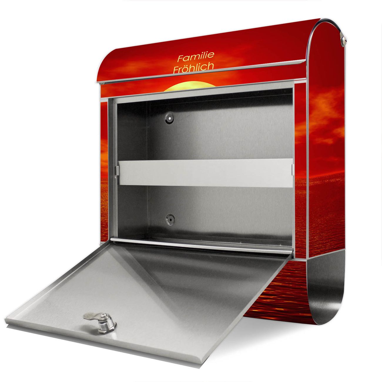 Der banjado Edelstahl Standbriefkasten mit Motiv Sonnenuntergang und eigenem Wunschtext bietet Ihnen mit seinem Fassungsvermögen genügend Platz auch für große A4 Sendungen. Das integrierte Zeitungsfach eignet sich hervorragend, um unkompliziert die Tageszeitung zu fassen.