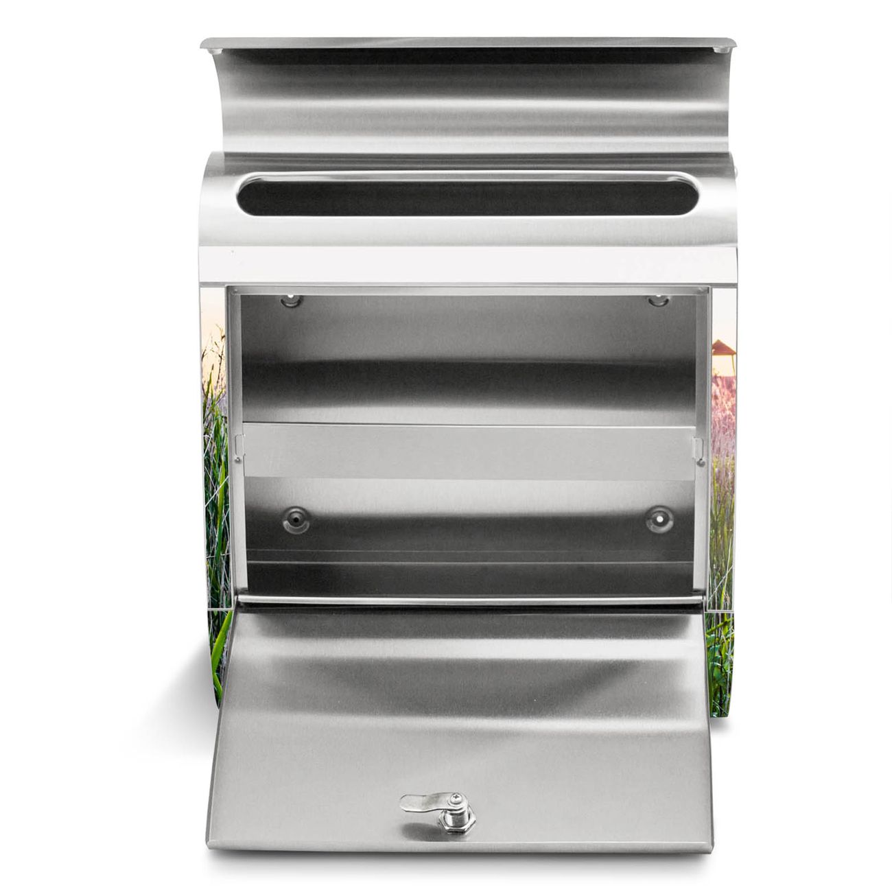 Der banjado Edelstahl Standbriefkasten mit Motiv Steg Durchs Schilf und eigenem Wunschtext bietet Ihnen mit seinem Fassungsvermögen genügend Platz auch für große A4 Sendungen. Das integrierte Zeitungsfach eignet sich hervorragend, um unkompliziert die Tageszeitung zu fassen.