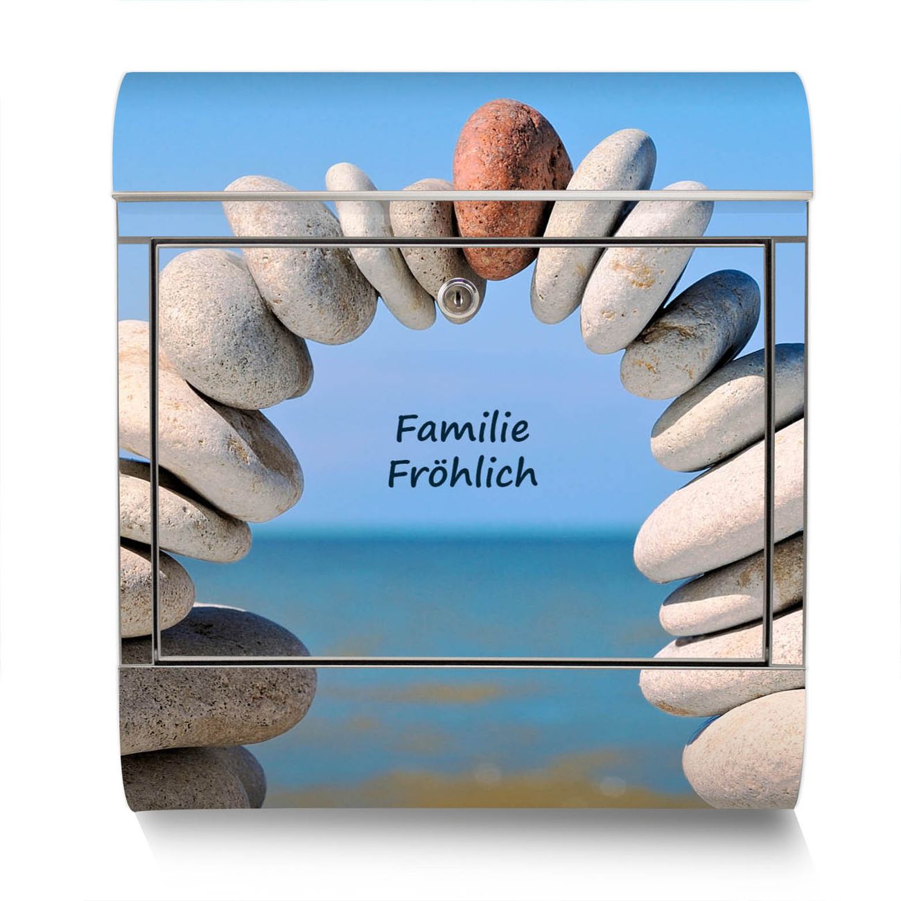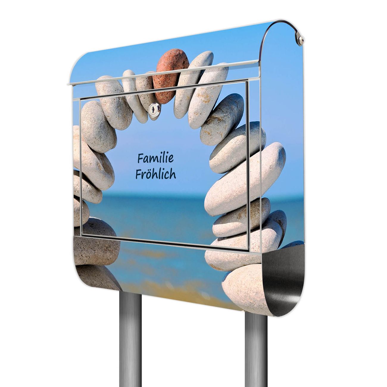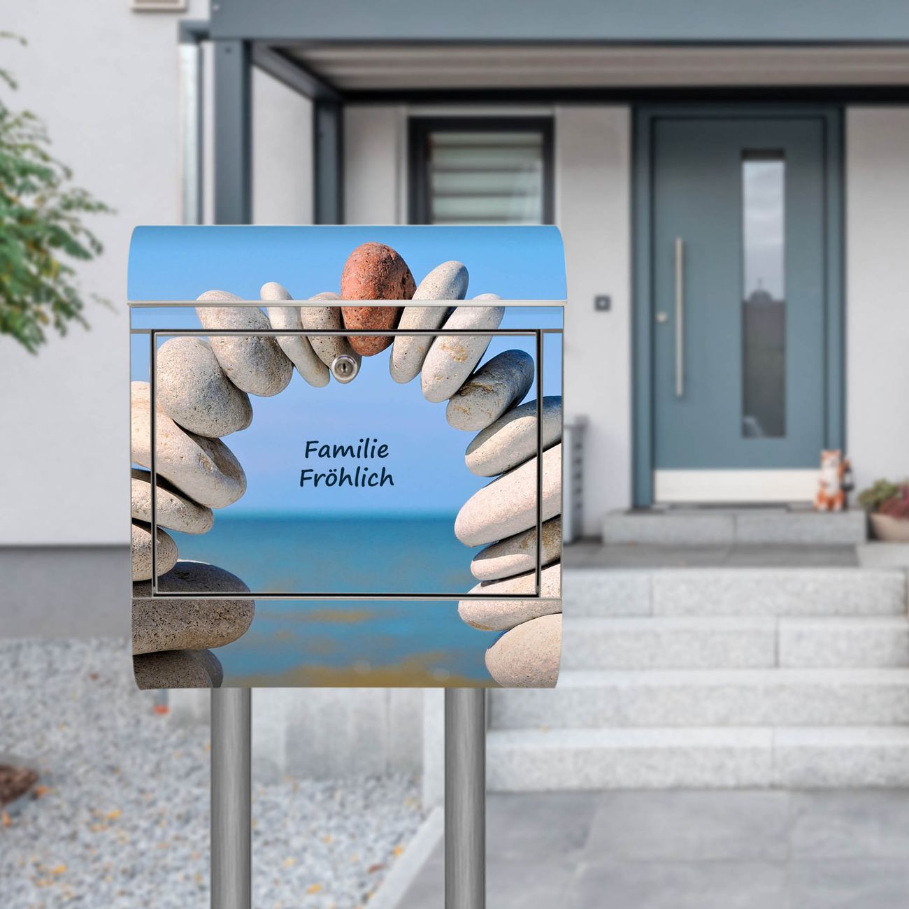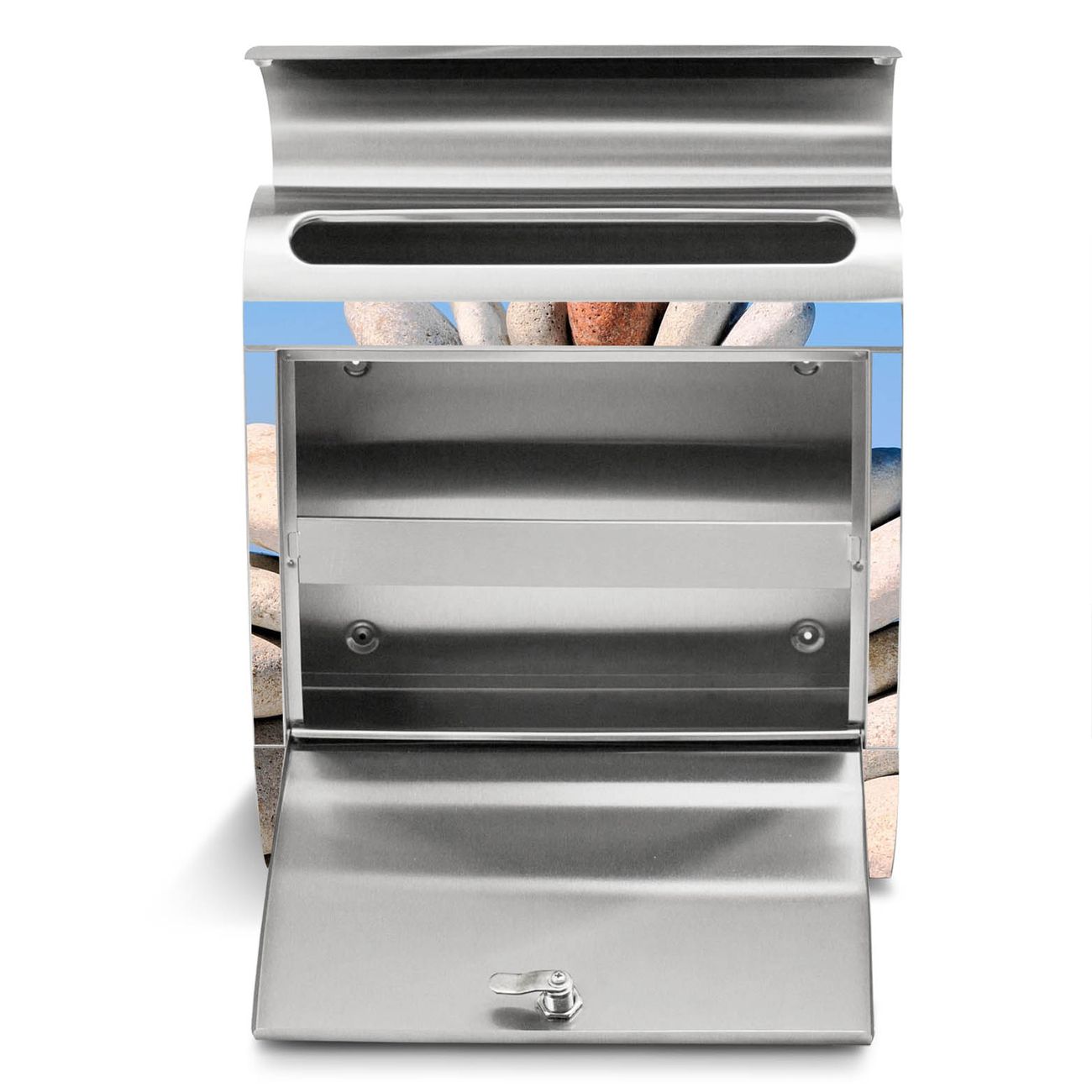 Der banjado Edelstahl Standbriefkasten mit Motiv Steine&Meer und eigenem Wunschtext bietet Ihnen mit seinem Fassungsvermögen genügend Platz auch für große A4 Sendungen. Das integrierte Zeitungsfach eignet sich hervorragend, um unkompliziert die Tageszeitung zu fassen.