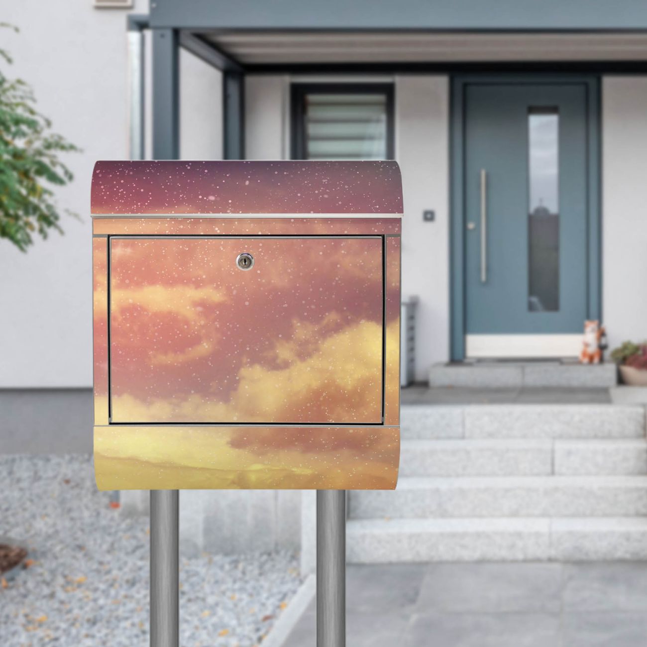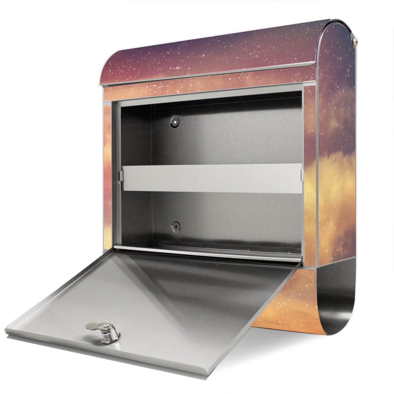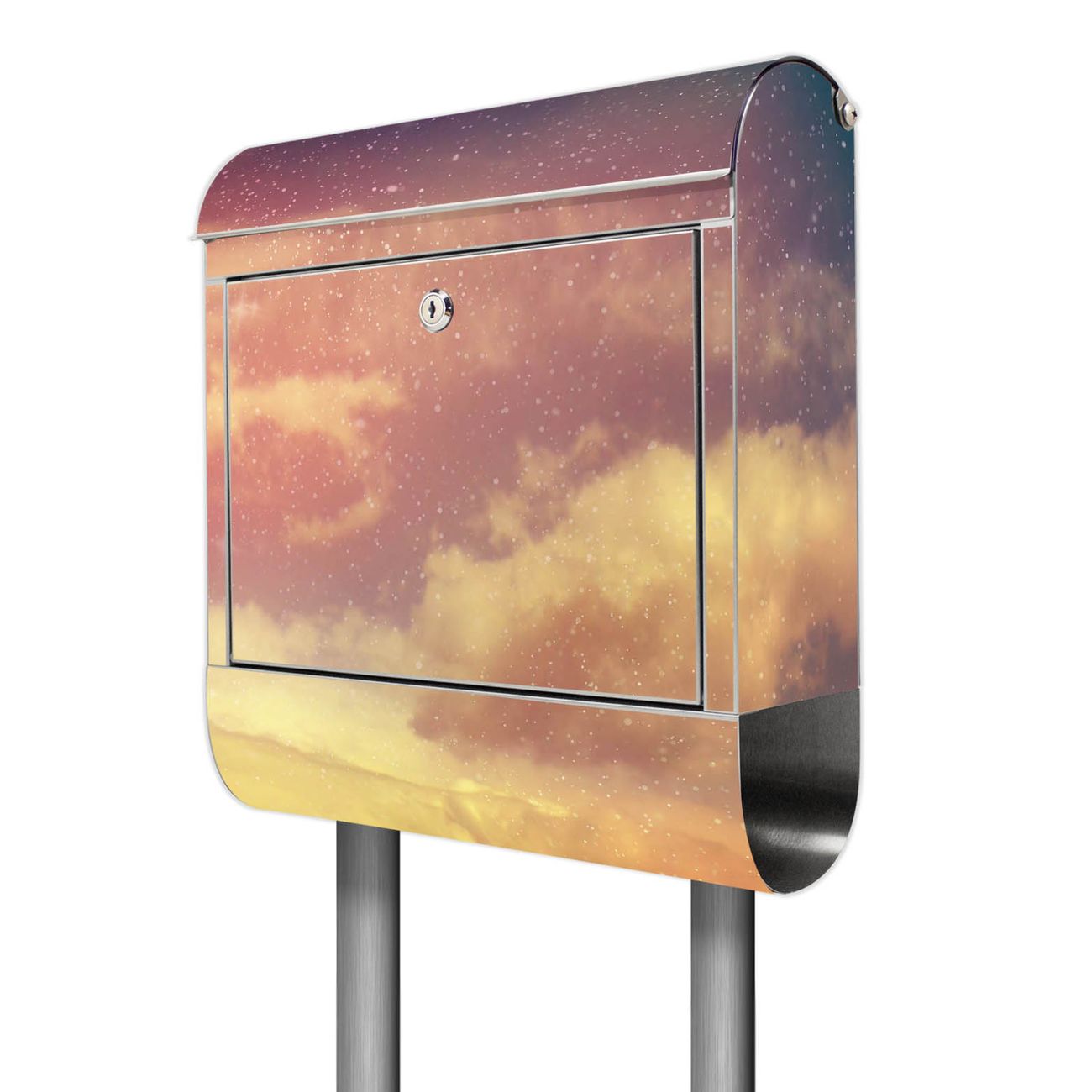 Der Motivstandbriefkasten hat ein sehr ansprechendes und ausgefallenes Design, damit entlocken Sie Ihren Nachbarn und dem Postboten ein Lächeln. Heben Sie Sich ab von der tristen grauen Masse, ohne auf Funktionalität zu verzichten. Der Briefkasten besteht aus hochwertigem 18/0 Edelstahl und die Wetter- und UV-resistenten Folie mit Sternenhimmel Motiv ist zusätzlich mit einem Schutzlaminat überzogen. Der Standbriefkasten wird mit Montagematerial und zwei Schlüsseln geliefert.