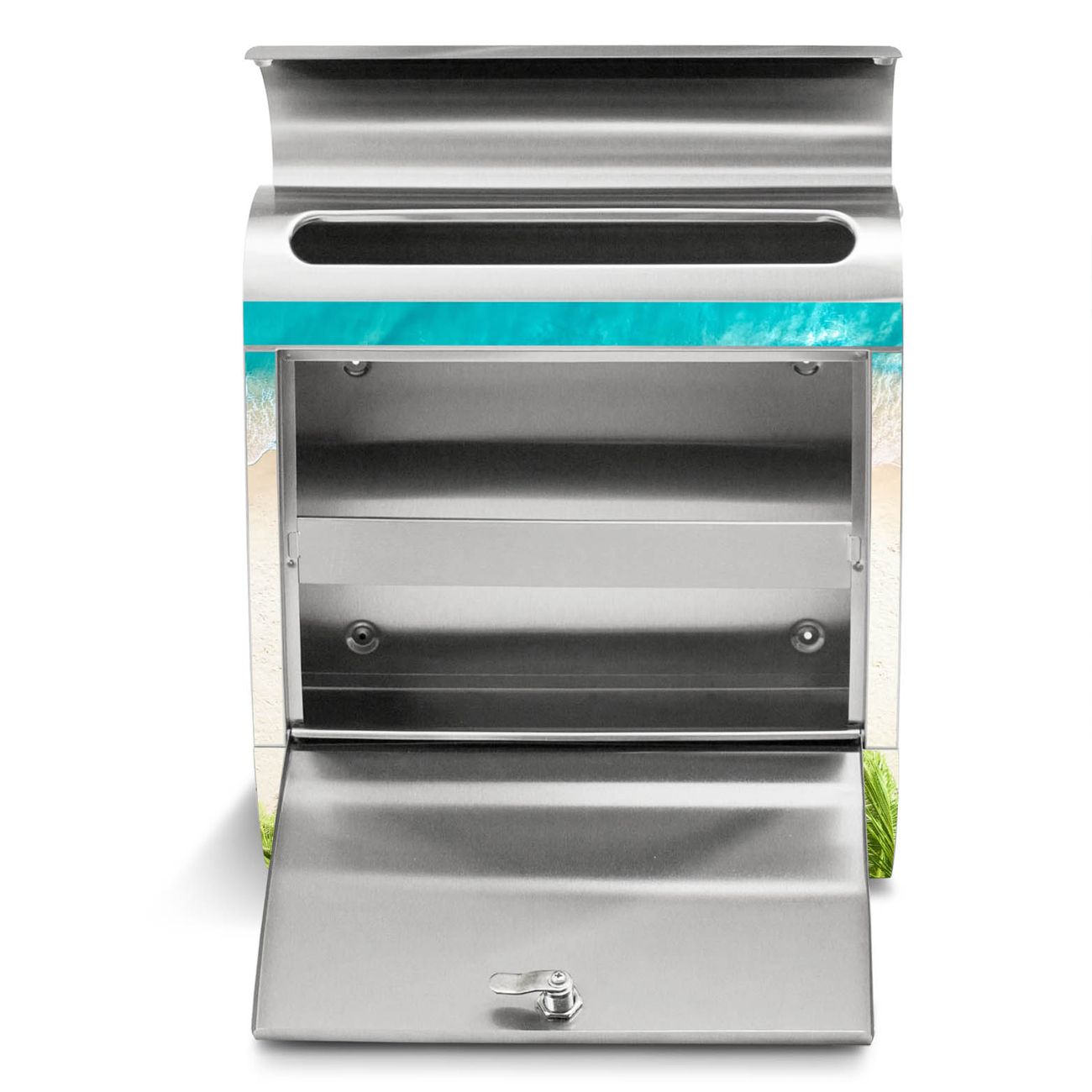 Der banjado Edelstahl Standbriefkasten mit Motiv Strandtag und eigenem Wunschtext bietet Ihnen mit seinem Fassungsvermögen genügend Platz auch für große A4 Sendungen. Das integrierte Zeitungsfach eignet sich hervorragend, um unkompliziert die Tageszeitung zu fassen.