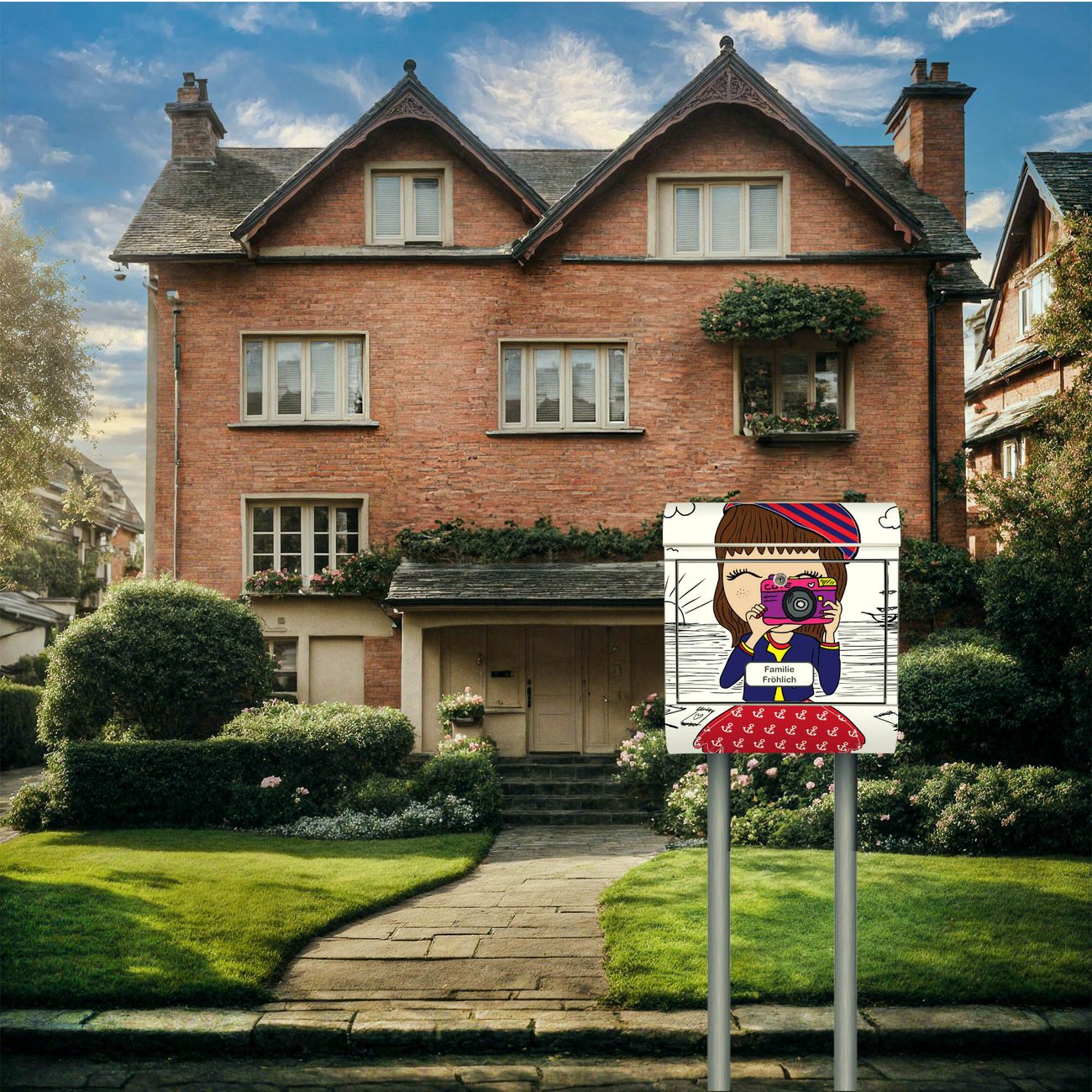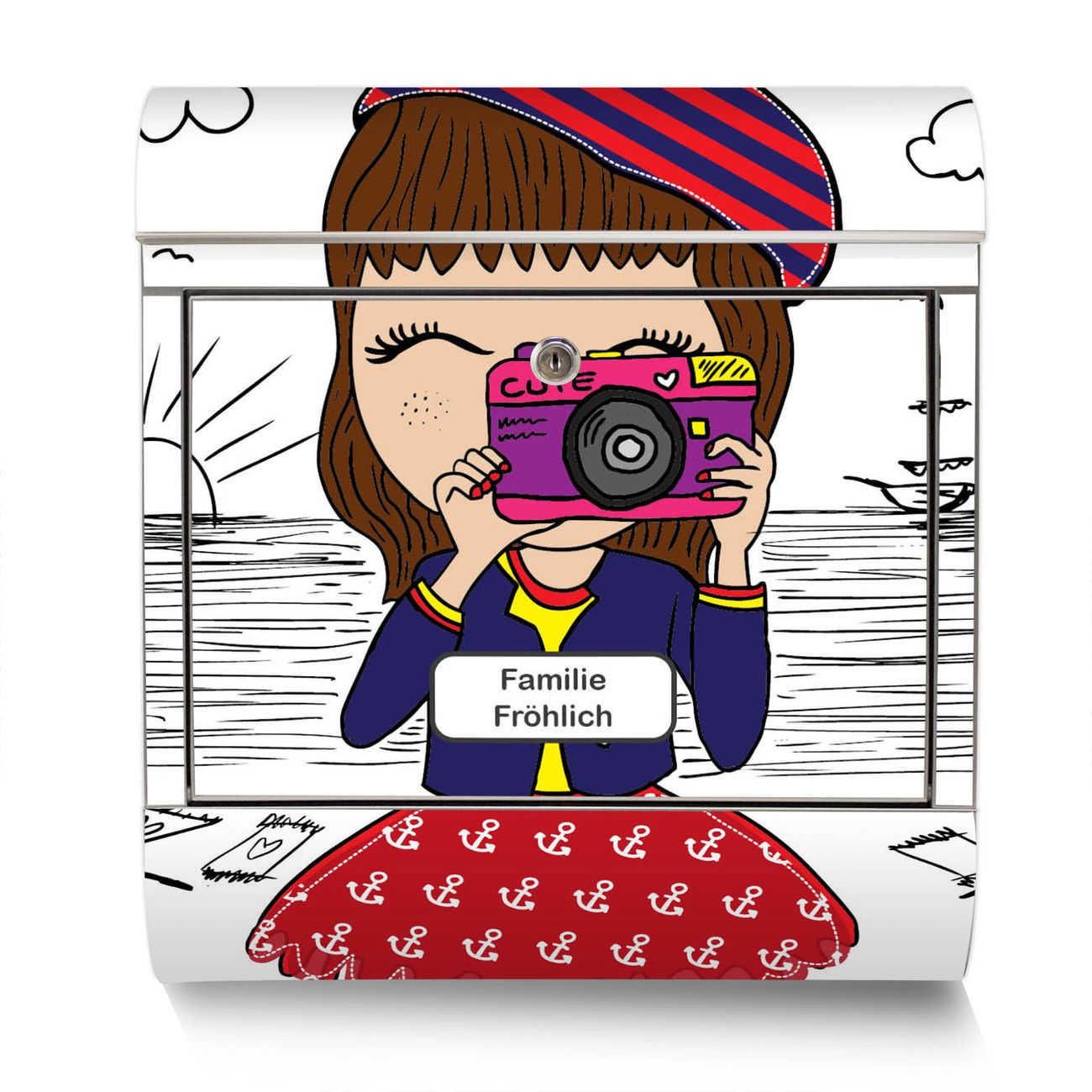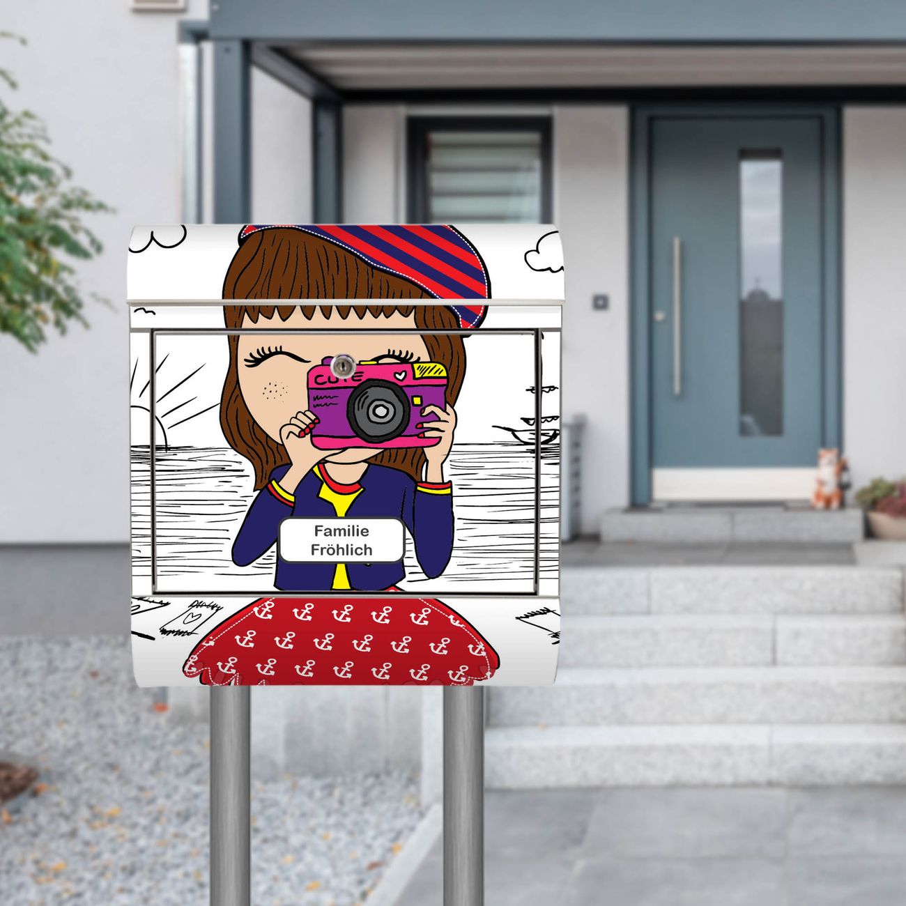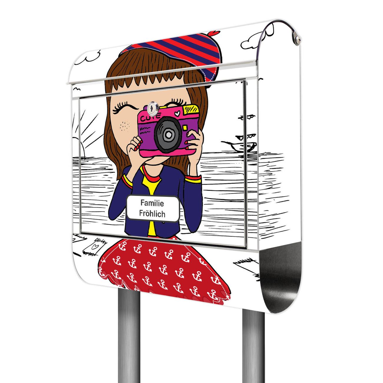 Der Motivstandbriefkasten hat ein sehr ansprechendes und ausgefallenes Design, damit entlocken Sie Ihren Nachbarn und dem Postboten ein Lächeln. Heben Sie Sich ab von der tristen grauen Masse, ohne auf Funktionalität zu verzichten. Der Briefkasten besteht aus hochwertigem 18/0 Edelstahl und die Wetter- und UV-resistenten Folie mit Süße Kamera Motiv ist zusätzlich mit einem Schutzlaminat überzogen. Der Standbriefkasten wird mit Montagematerial und zwei Schlüsseln geliefert.