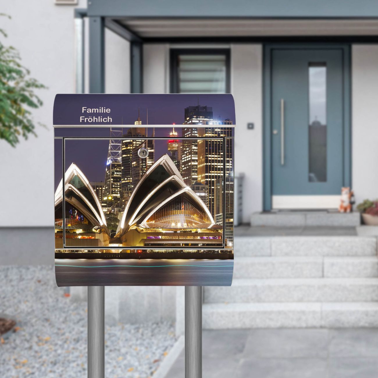 Der Motivstandbriefkasten hat ein sehr ansprechendes und ausgefallenes Design, damit entlocken Sie Ihren Nachbarn und dem Postboten ein Lächeln. Heben Sie Sich ab von der tristen grauen Masse, ohne auf Funktionalität zu verzichten. Der Briefkasten besteht aus hochwertigem 18/0 Edelstahl und die Wetter- und UV-resistenten Folie mit Sydney Motiv ist zusätzlich mit einem Schutzlaminat überzogen. Der Standbriefkasten wird mit Montagematerial und zwei Schlüsseln geliefert.