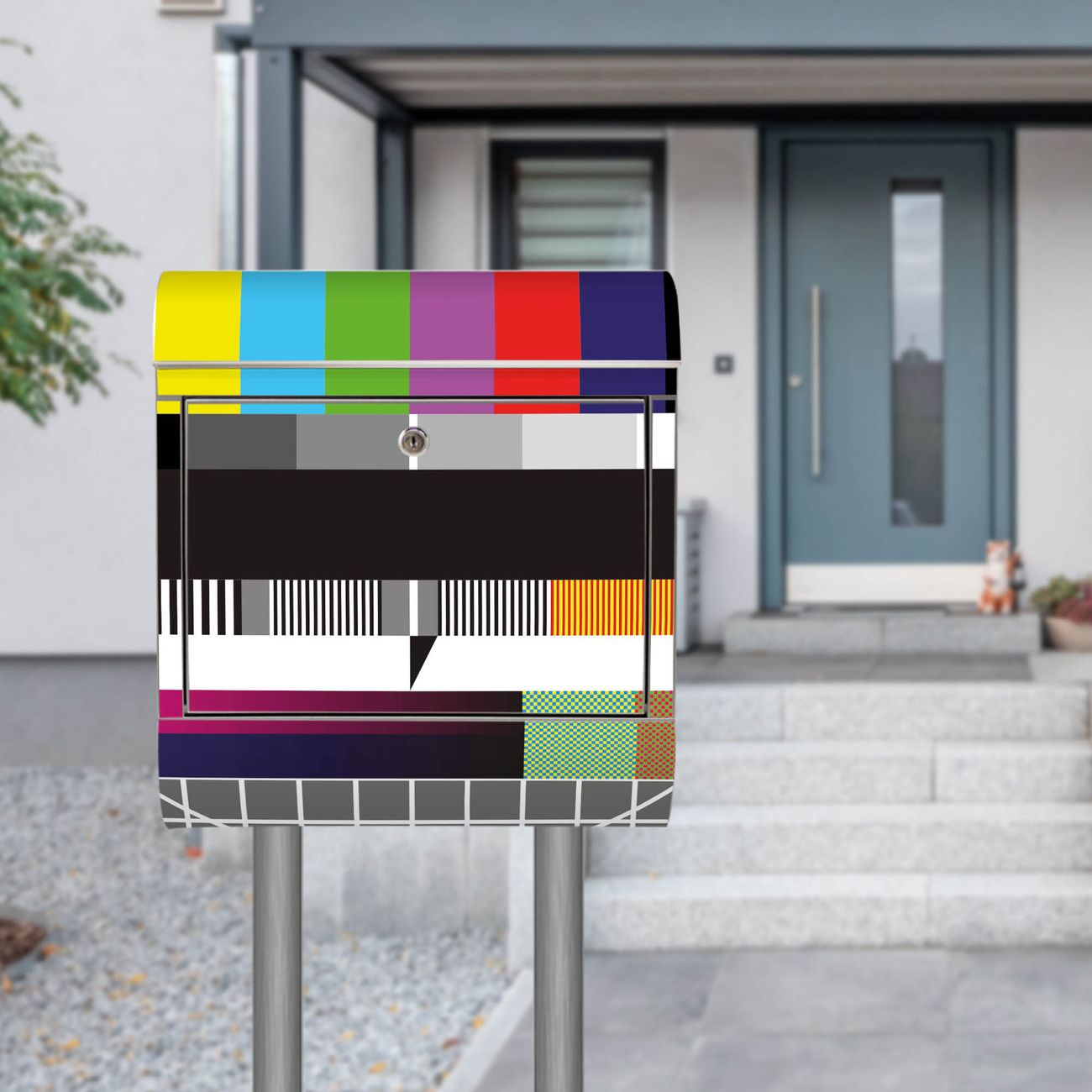 Der Motivstandbriefkasten hat ein sehr ansprechendes und ausgefallenes Design, damit entlocken Sie Ihren Nachbarn und dem Postboten ein Lächeln. Heben Sie Sich ab von der tristen grauen Masse, ohne auf Funktionalität zu verzichten. Der Briefkasten besteht aus hochwertigem 18/0 Edelstahl und die Wetter- und UV-resistenten Folie mit Testbild Motiv ist zusätzlich mit einem Schutzlaminat überzogen. Der Standbriefkasten wird mit Montagematerial und zwei Schlüsseln geliefert.