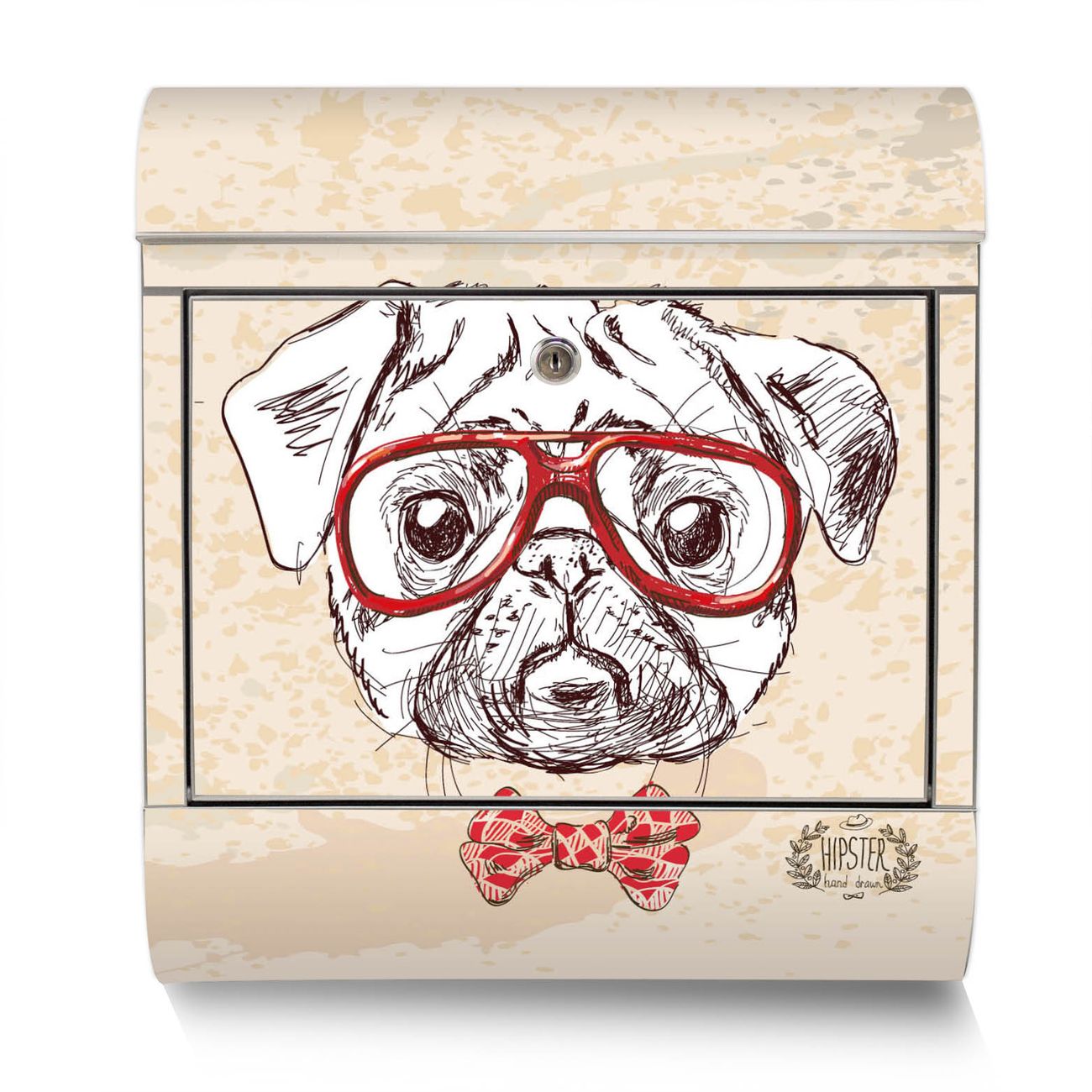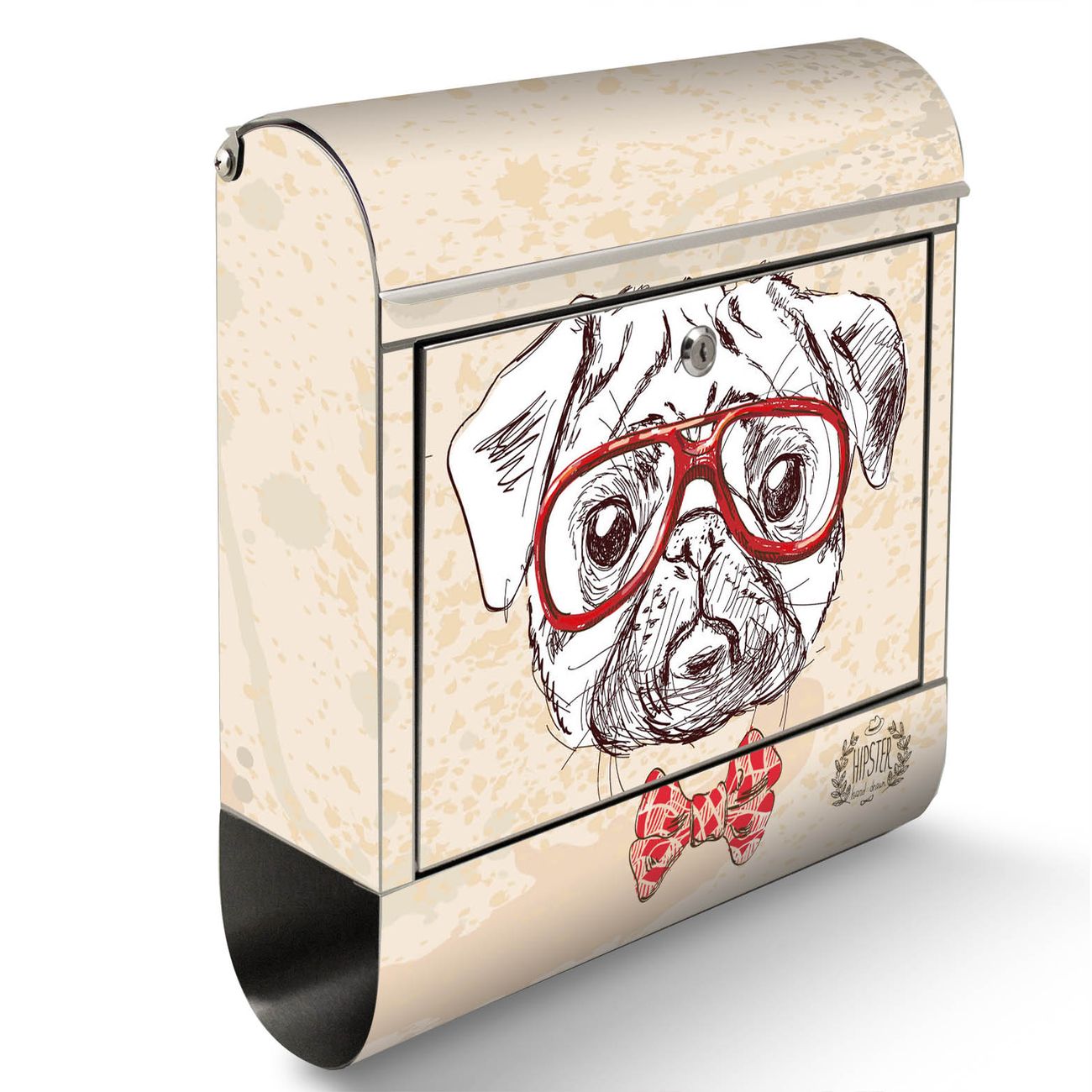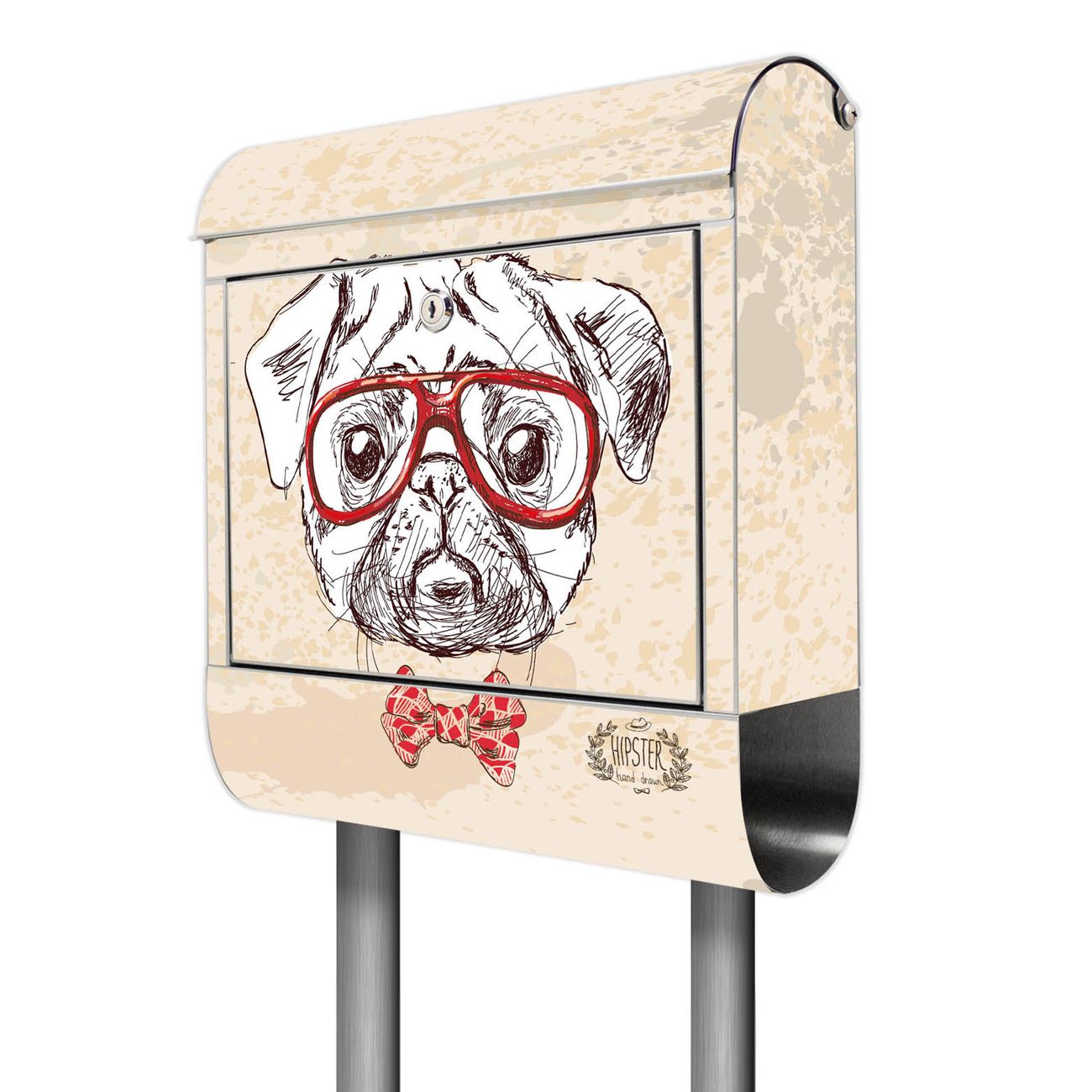 Der Motivstandbriefkasten hat ein sehr ansprechendes und ausgefallenes Design, damit entlocken Sie Ihren Nachbarn und dem Postboten ein Lächeln. Heben Sie Sich ab von der tristen grauen Masse, ohne auf Funktionalität zu verzichten. Der Briefkasten besteht aus hochwertigem 18/0 Edelstahl und die Wetter- und UV-resistenten Folie mit Timothy Motiv ist zusätzlich mit einem Schutzlaminat überzogen. Der Standbriefkasten wird mit Montagematerial und zwei Schlüsseln geliefert.