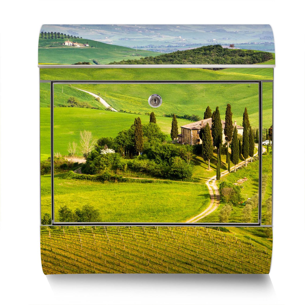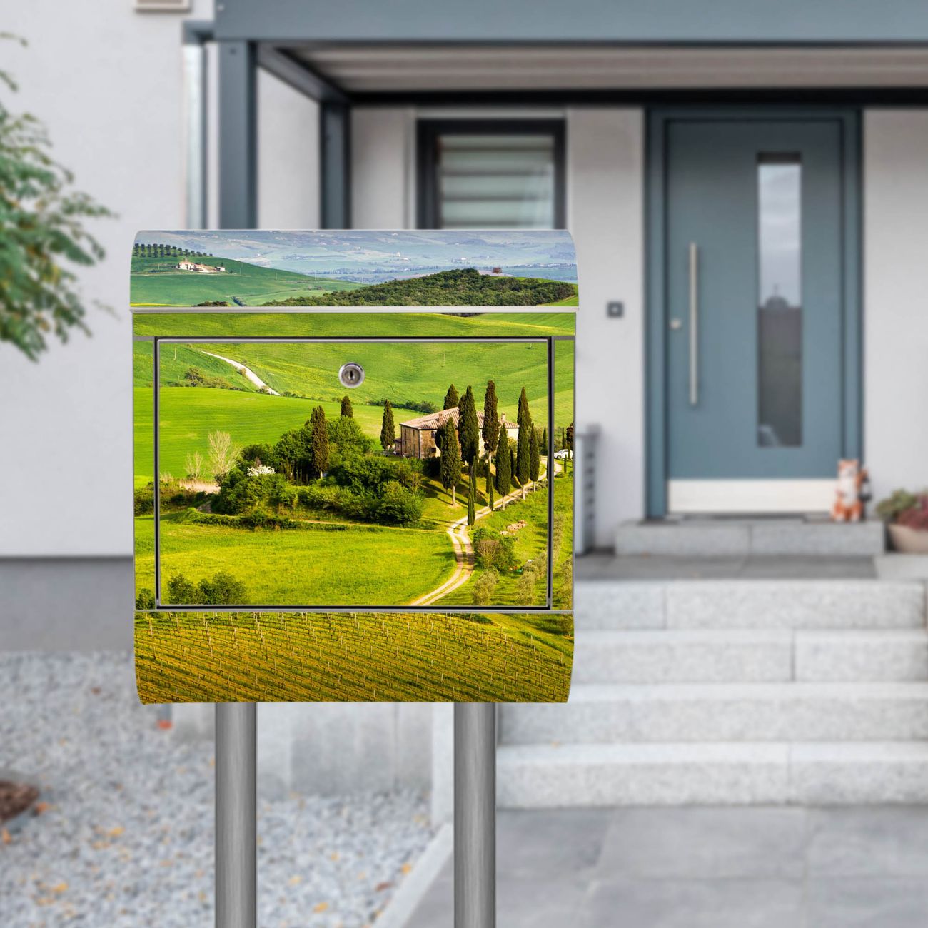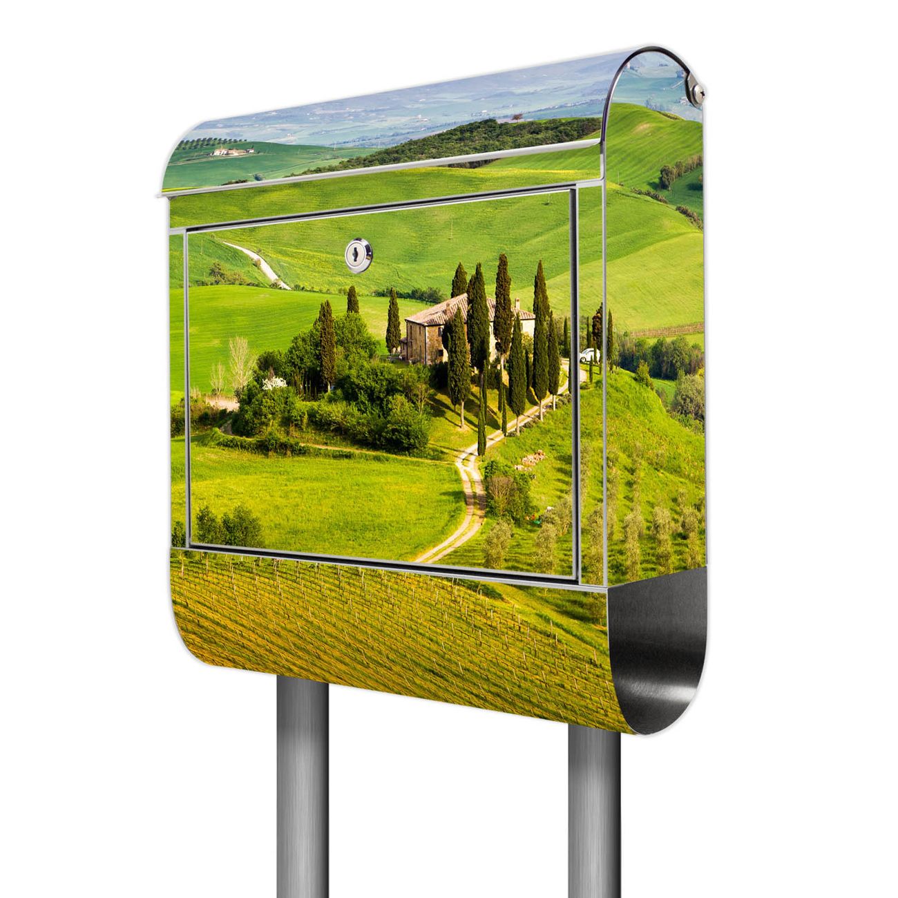 Der Motivstandbriefkasten hat ein sehr ansprechendes und ausgefallenes Design, damit entlocken Sie Ihren Nachbarn und dem Postboten ein Lächeln. Heben Sie Sich ab von der tristen grauen Masse, ohne auf Funktionalität zu verzichten. Der Briefkasten besteht aus hochwertigem 18/0 Edelstahl und die Wetter- und UV-resistenten Folie mit Toskana Motiv ist zusätzlich mit einem Schutzlaminat überzogen. Der Standbriefkasten wird mit Montagematerial und zwei Schlüsseln geliefert.