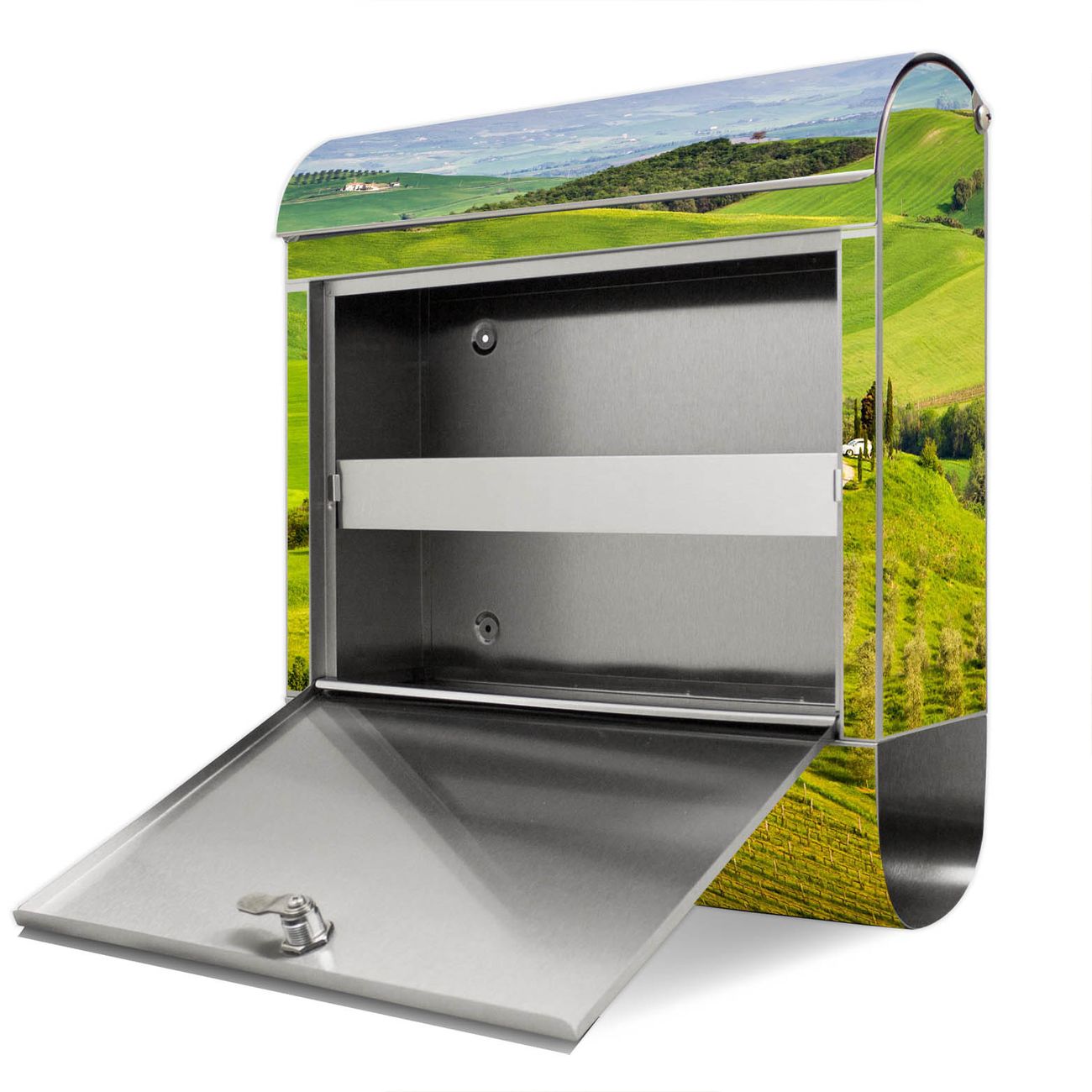 Der banjado Edelstahl Standbriefkasten mit Motiv Toskana bietet Ihnen mit seinem Fassungsvermögen genügend Platz auch für große A4 Sendungen. Das integrierte Zeitungsfach eignet sich hervorragend, um unkompliziert die Tageszeitung zu fassen.
