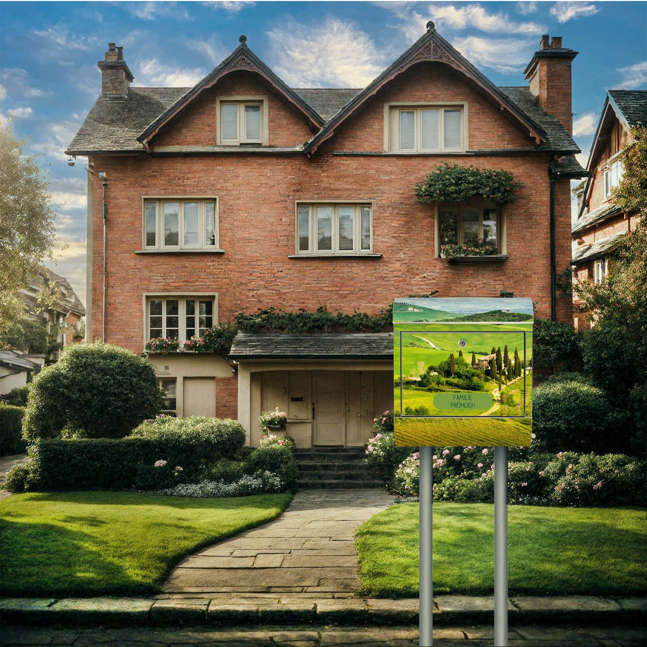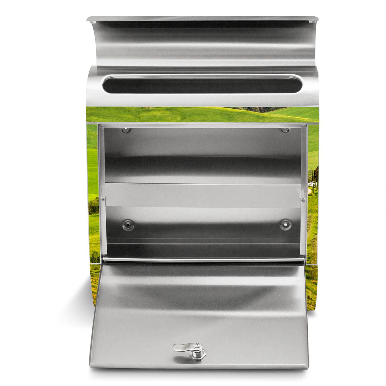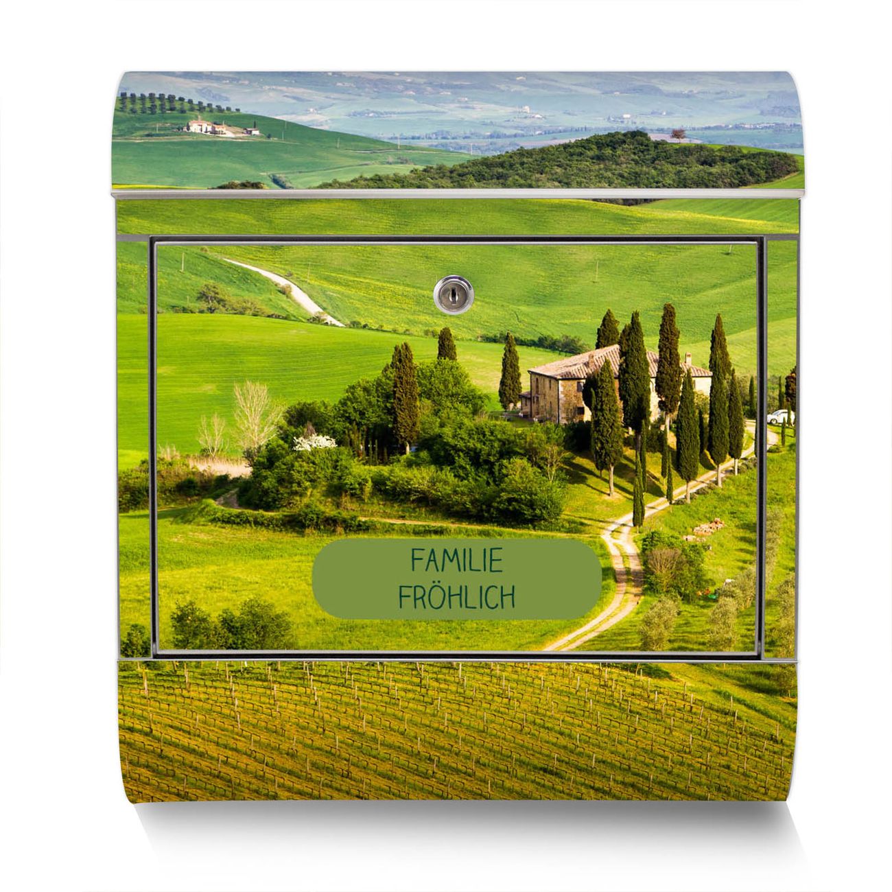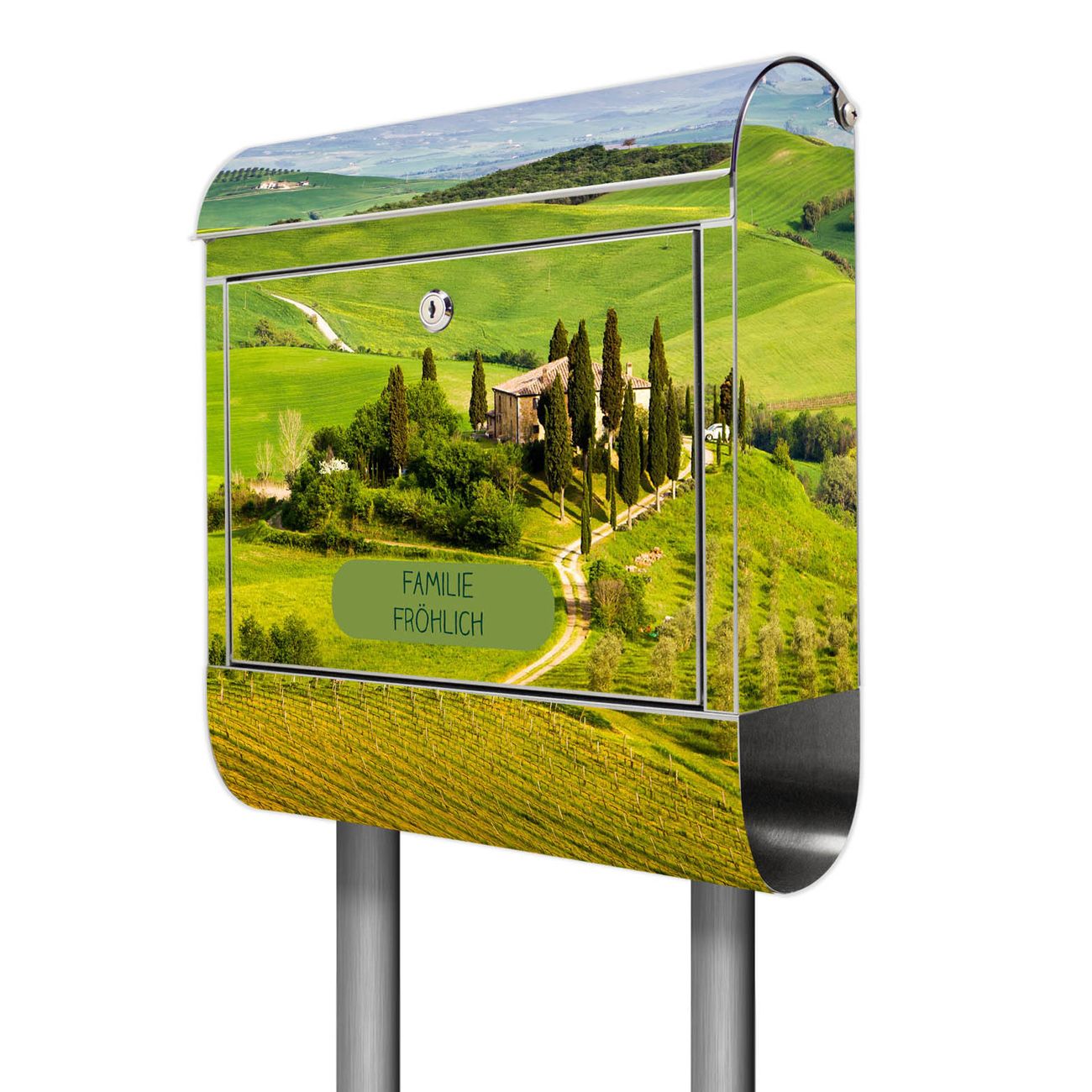 Der Motivstandbriefkasten hat ein sehr ansprechendes und ausgefallenes Design, damit entlocken Sie Ihren Nachbarn und dem Postboten ein Lächeln. Heben Sie Sich ab von der tristen grauen Masse, ohne auf Funktionalität zu verzichten. Der Briefkasten besteht aus hochwertigem 18/0 Edelstahl und die Wetter- und UV-resistenten Folie mit Toskana Motiv ist zusätzlich mit einem Schutzlaminat überzogen. Der Standbriefkasten wird mit Montagematerial und zwei Schlüsseln geliefert.
