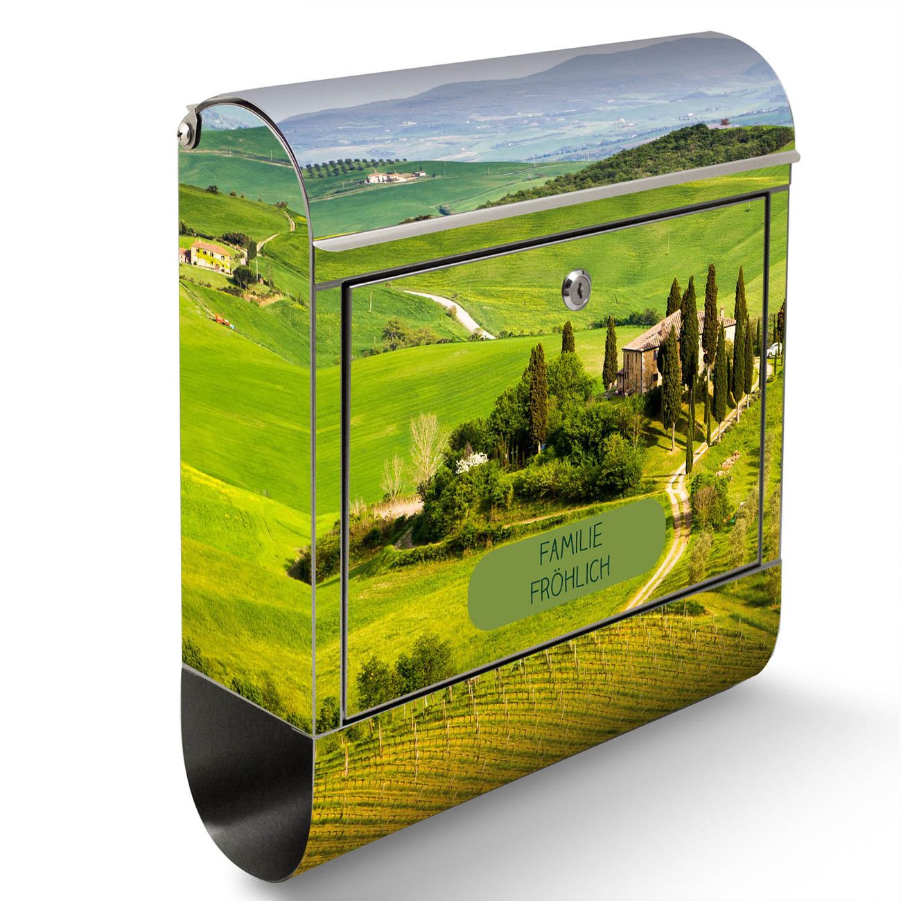 Der banjado Edelstahl Standbriefkasten mit Motiv Toskana und eigenem Wunschtext bietet Ihnen mit seinem Fassungsvermögen genügend Platz auch für große A4 Sendungen. Das integrierte Zeitungsfach eignet sich hervorragend, um unkompliziert die Tageszeitung zu fassen.