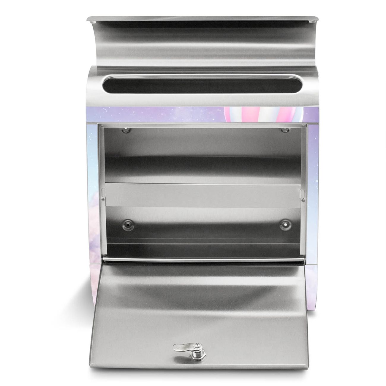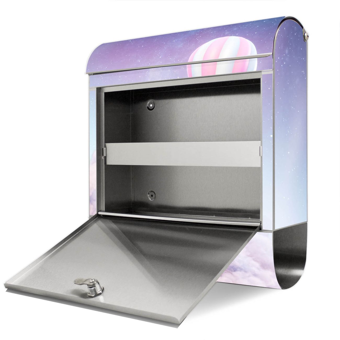 Der Motivstandbriefkasten hat ein sehr ansprechendes und ausgefallenes Design, damit entlocken Sie Ihren Nachbarn und dem Postboten ein Lächeln. Heben Sie Sich ab von der tristen grauen Masse, ohne auf Funktionalität zu verzichten. Der Briefkasten besteht aus hochwertigem 18/0 Edelstahl und die Wetter- und UV-resistenten Folie mit Über den Wolken Motiv ist zusätzlich mit einem Schutzlaminat überzogen. Der Standbriefkasten wird mit Montagematerial und zwei Schlüsseln geliefert.