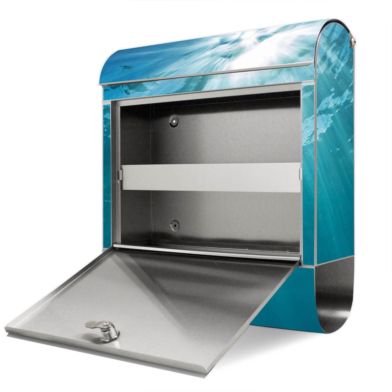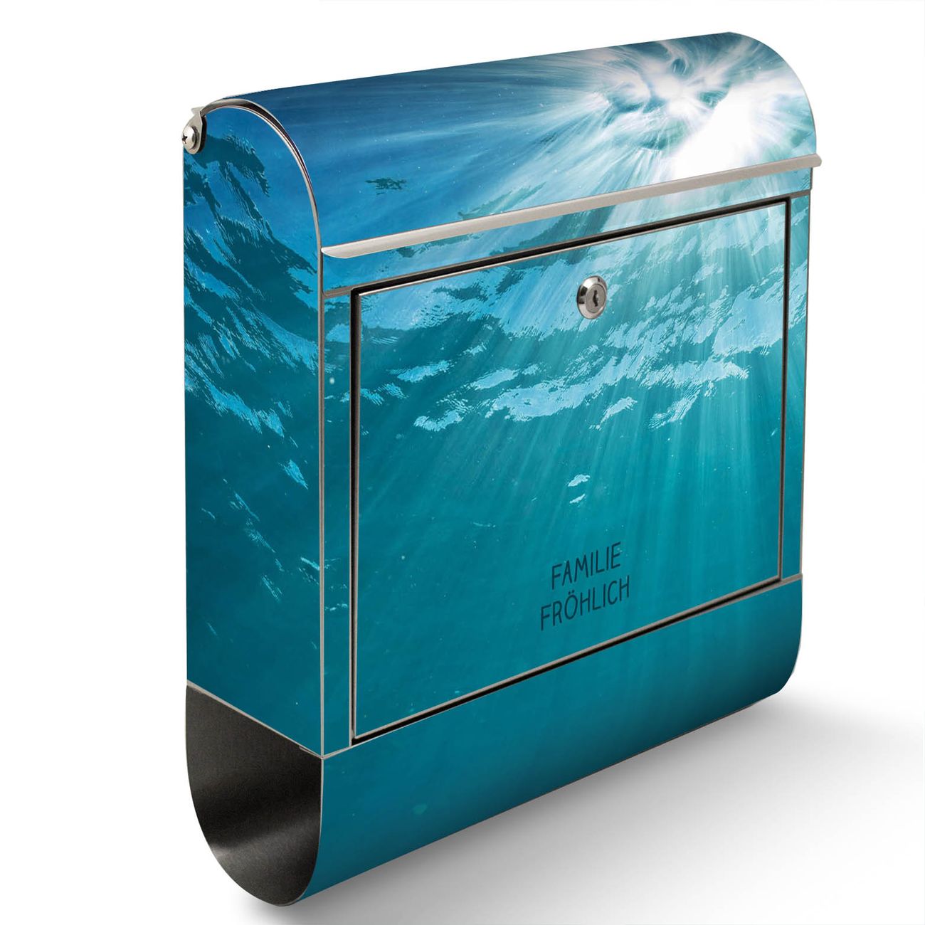 Der banjado Edelstahl Standbriefkasten mit Motiv Unter der Oberfläche und eigenem Wunschtext bietet Ihnen mit seinem Fassungsvermögen genügend Platz auch für große A4 Sendungen. Das integrierte Zeitungsfach eignet sich hervorragend, um unkompliziert die Tageszeitung zu fassen.