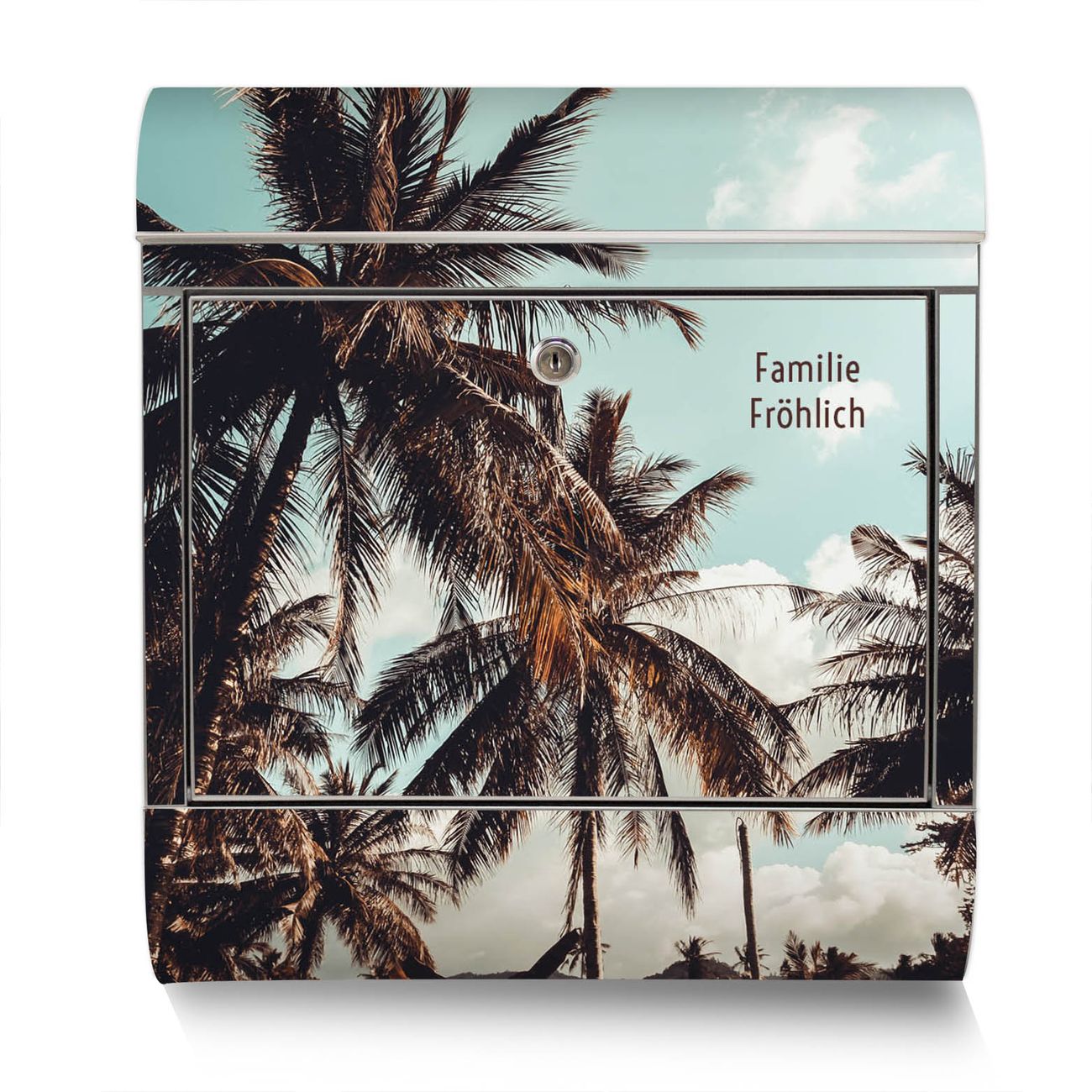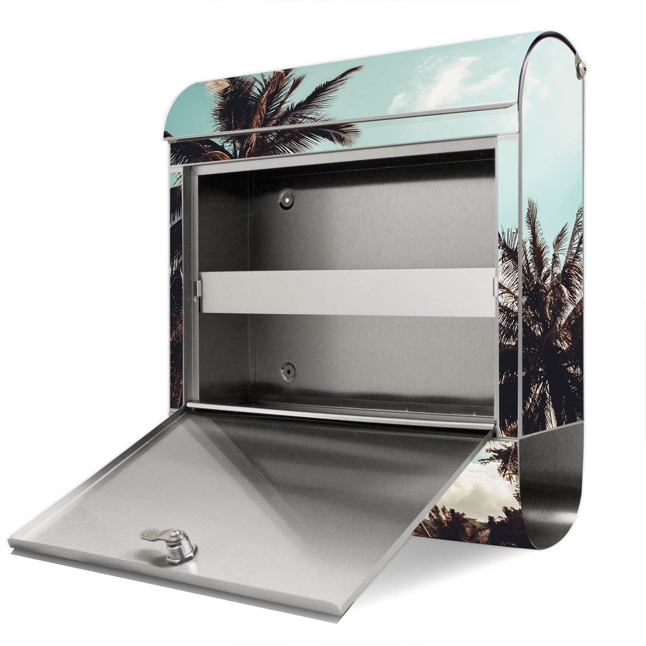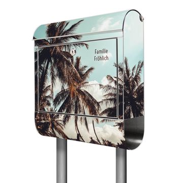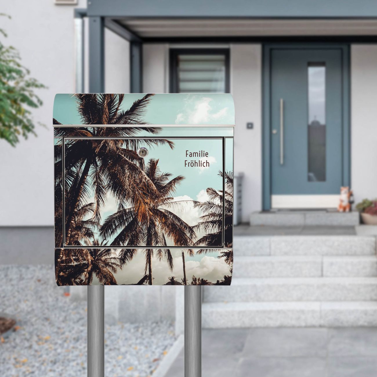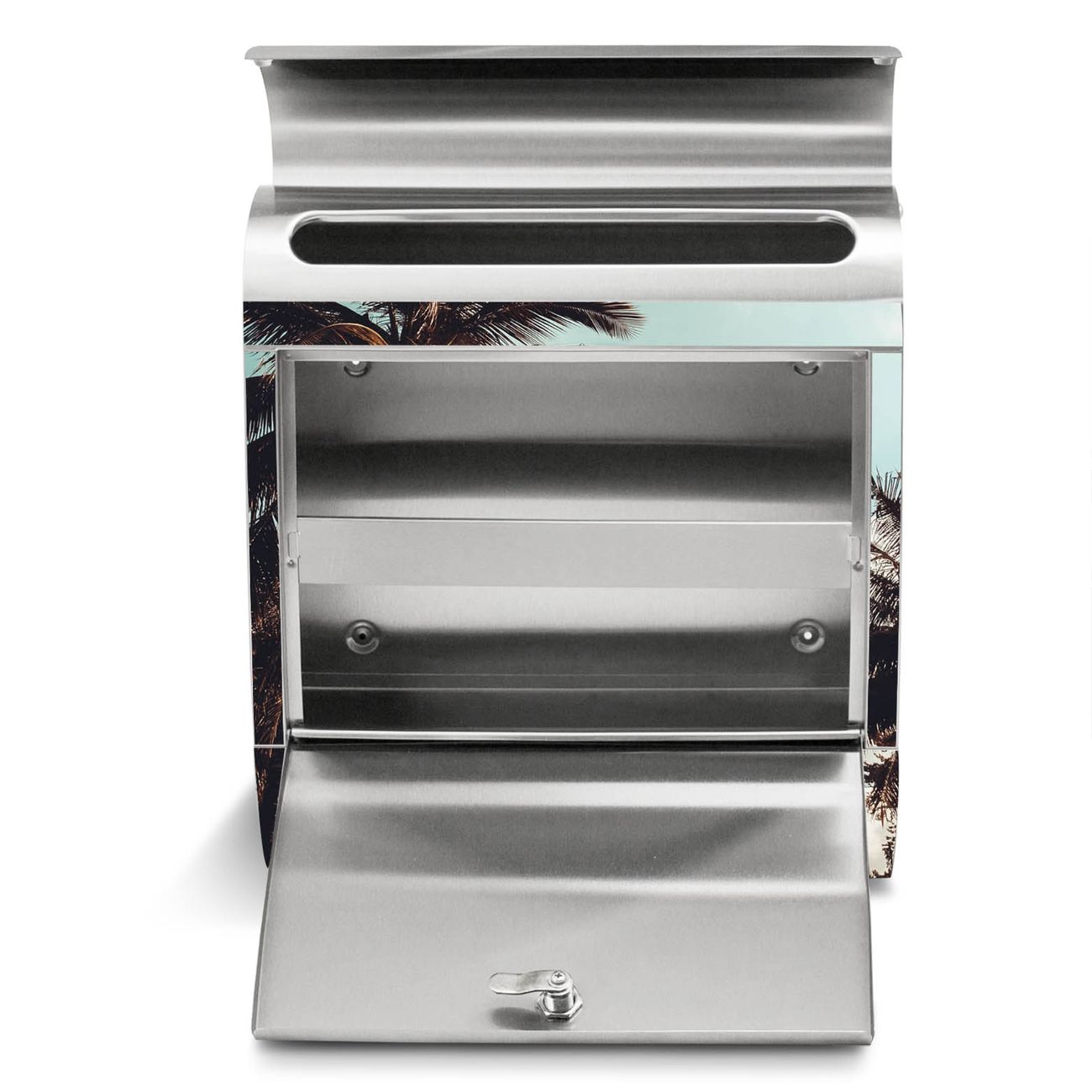 Der banjado Edelstahl Standbriefkasten mit Motiv Unter Palmen und eigenem Wunschtext bietet Ihnen mit seinem Fassungsvermögen genügend Platz auch für große A4 Sendungen. Das integrierte Zeitungsfach eignet sich hervorragend, um unkompliziert die Tageszeitung zu fassen.