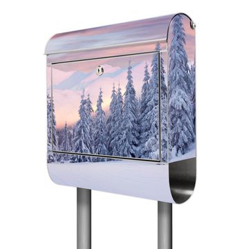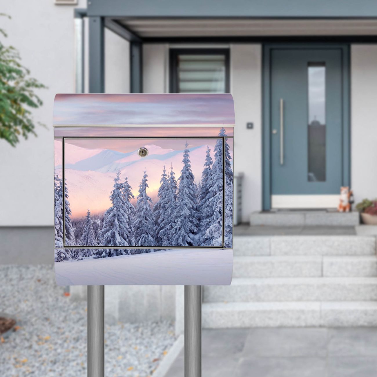 Der banjado Edelstahl Standbriefkasten mit Motiv Verschneite Berge bietet Ihnen mit seinem Fassungsvermögen genügend Platz auch für große A4 Sendungen. Das integrierte Zeitungsfach eignet sich hervorragend, um unkompliziert die Tageszeitung zu fassen.