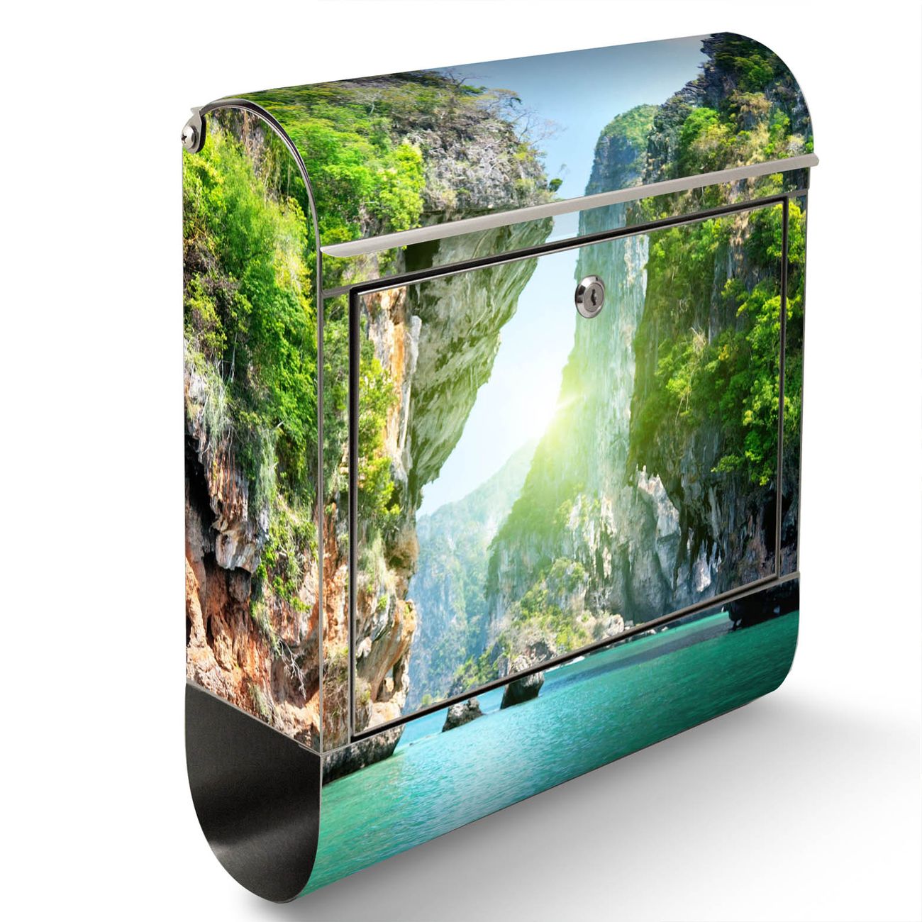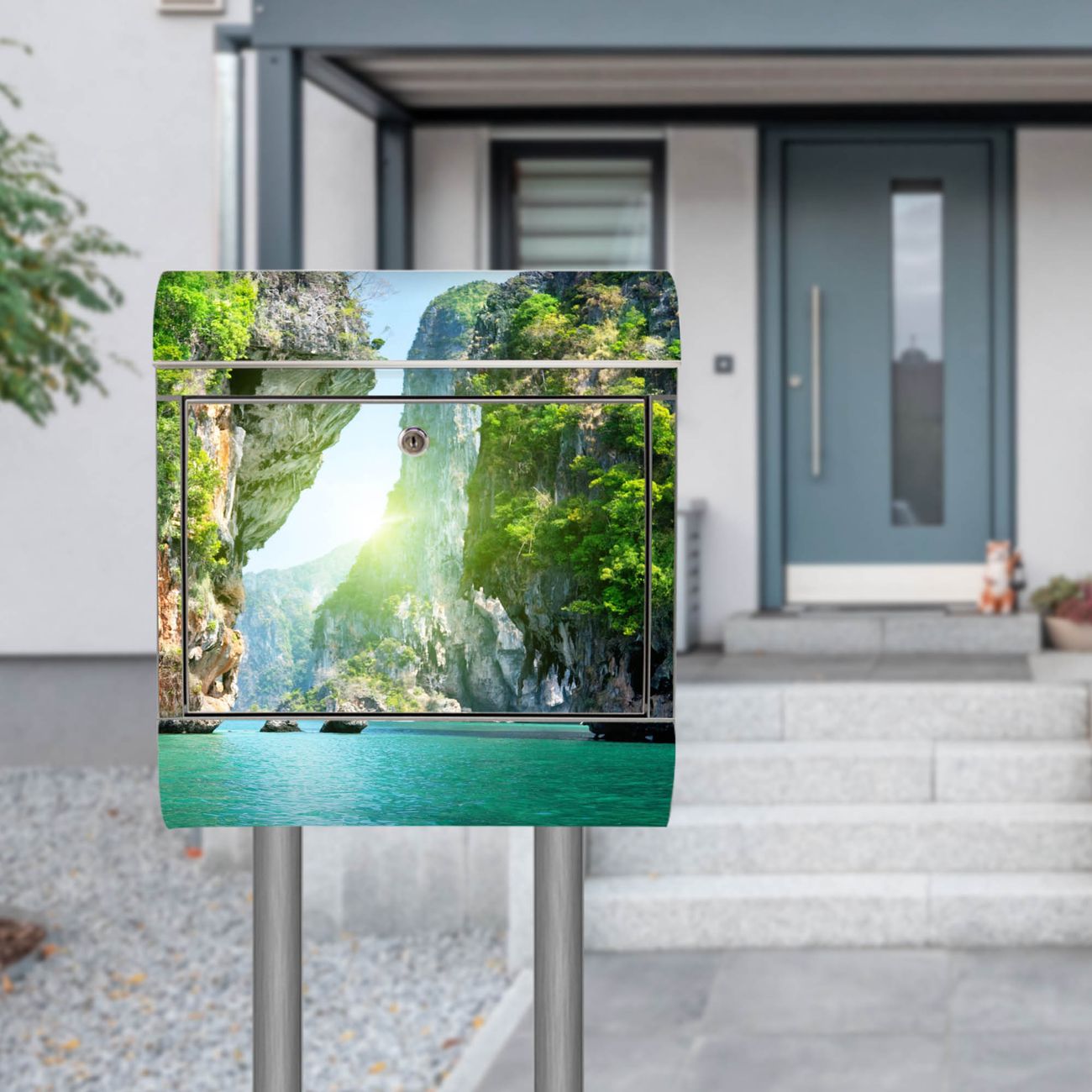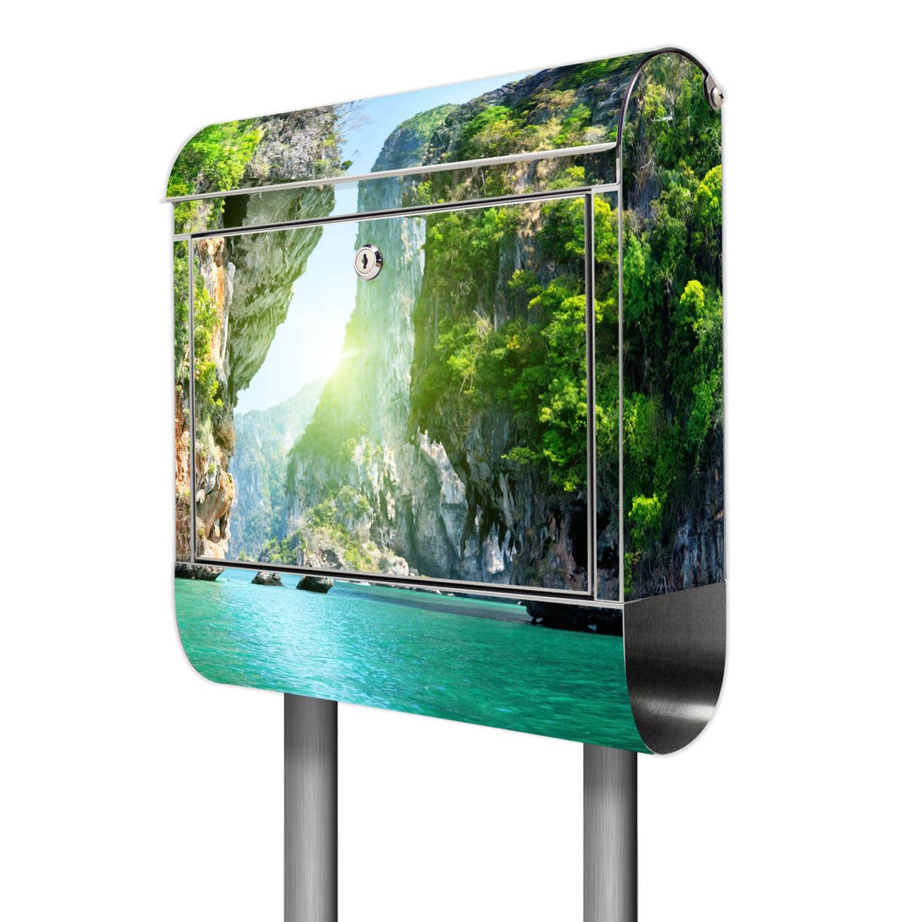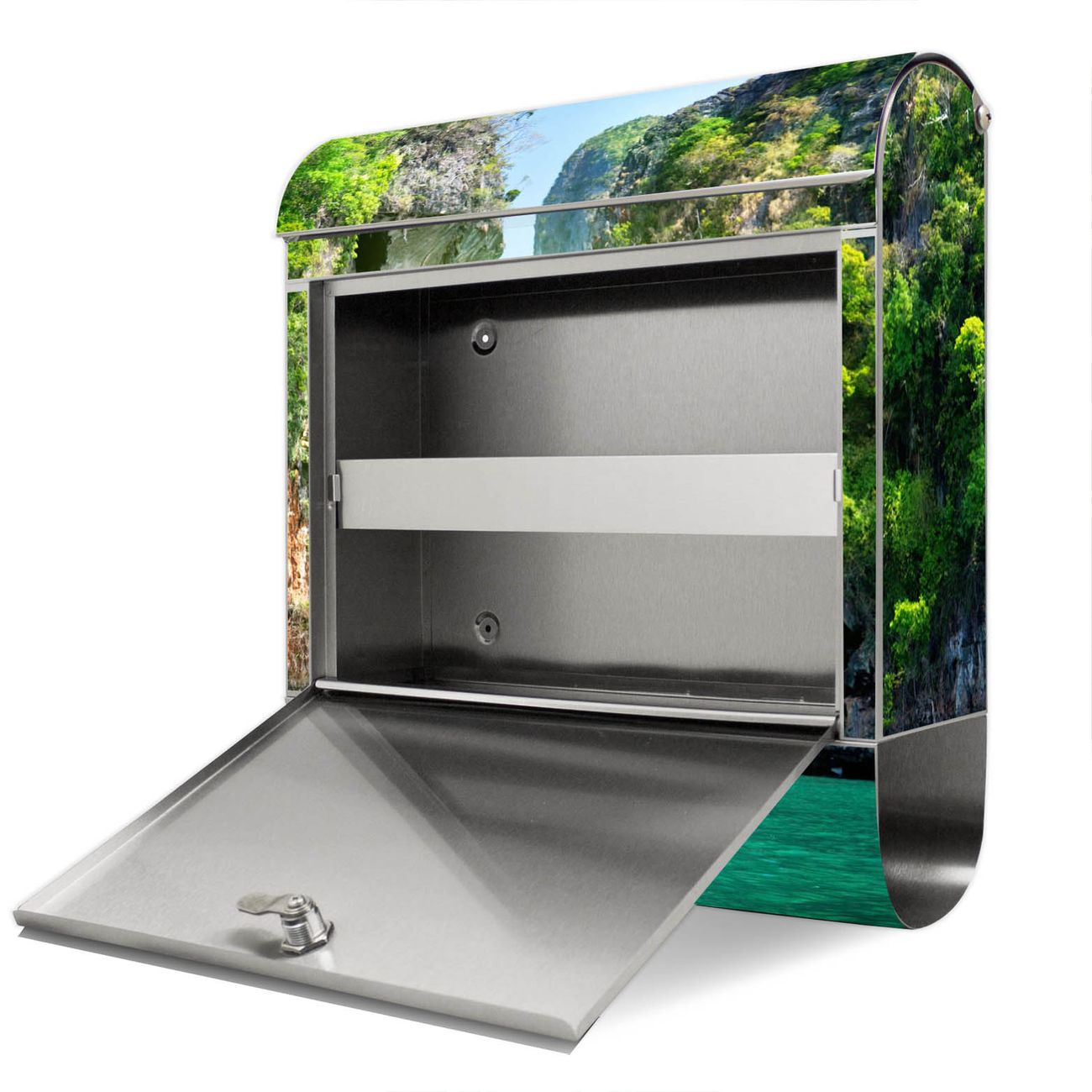 Der banjado Edelstahl Standbriefkasten mit Motiv Versteckte Bucht bietet Ihnen mit seinem Fassungsvermögen genügend Platz auch für große A4 Sendungen. Das integrierte Zeitungsfach eignet sich hervorragend, um unkompliziert die Tageszeitung zu fassen.