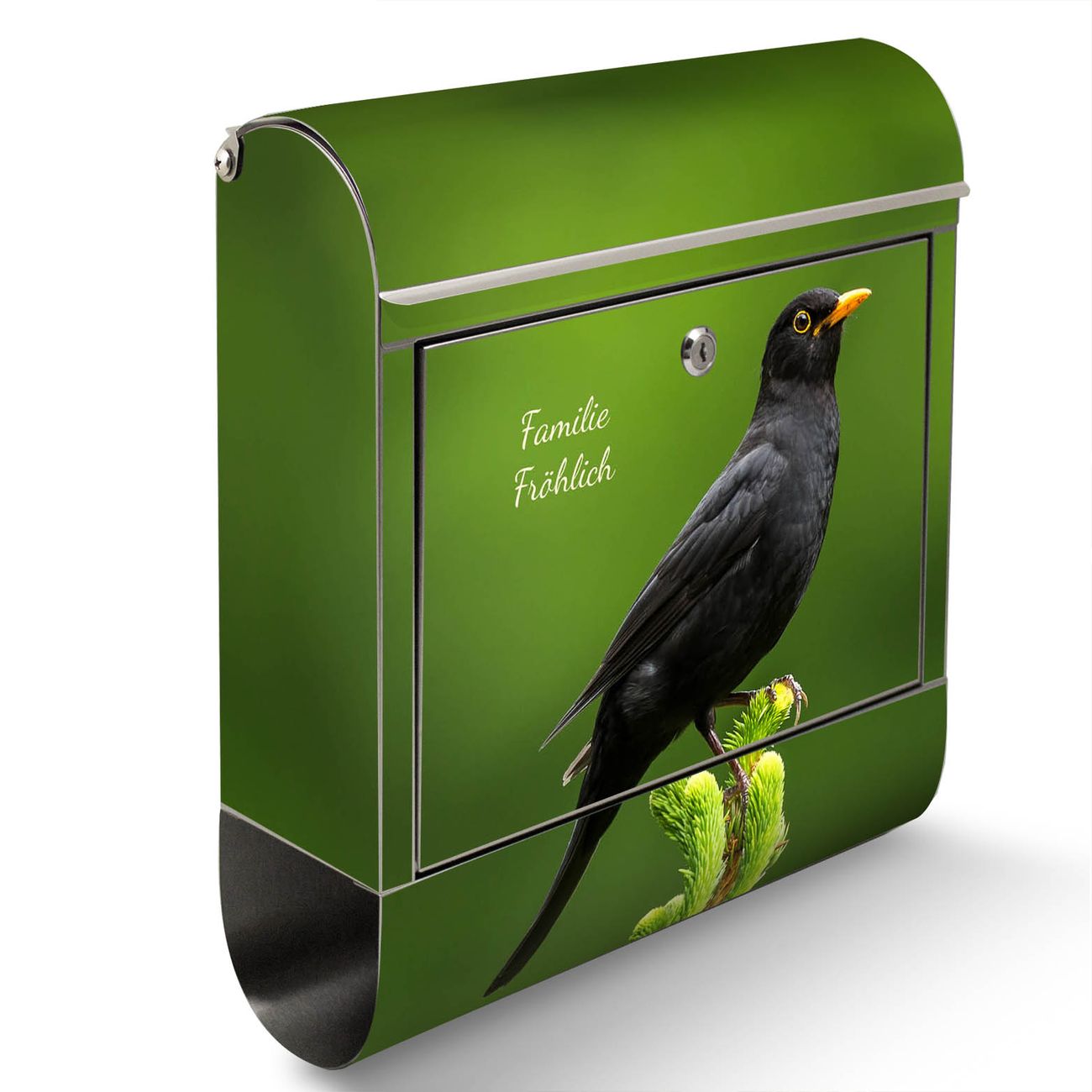 Der banjado Edelstahl Standbriefkasten mit Motiv Vogel auf Tannenzweig und eigenem Wunschtext bietet Ihnen mit seinem Fassungsvermögen genügend Platz auch für große A4 Sendungen. Das integrierte Zeitungsfach eignet sich hervorragend, um unkompliziert die Tageszeitung zu fassen.