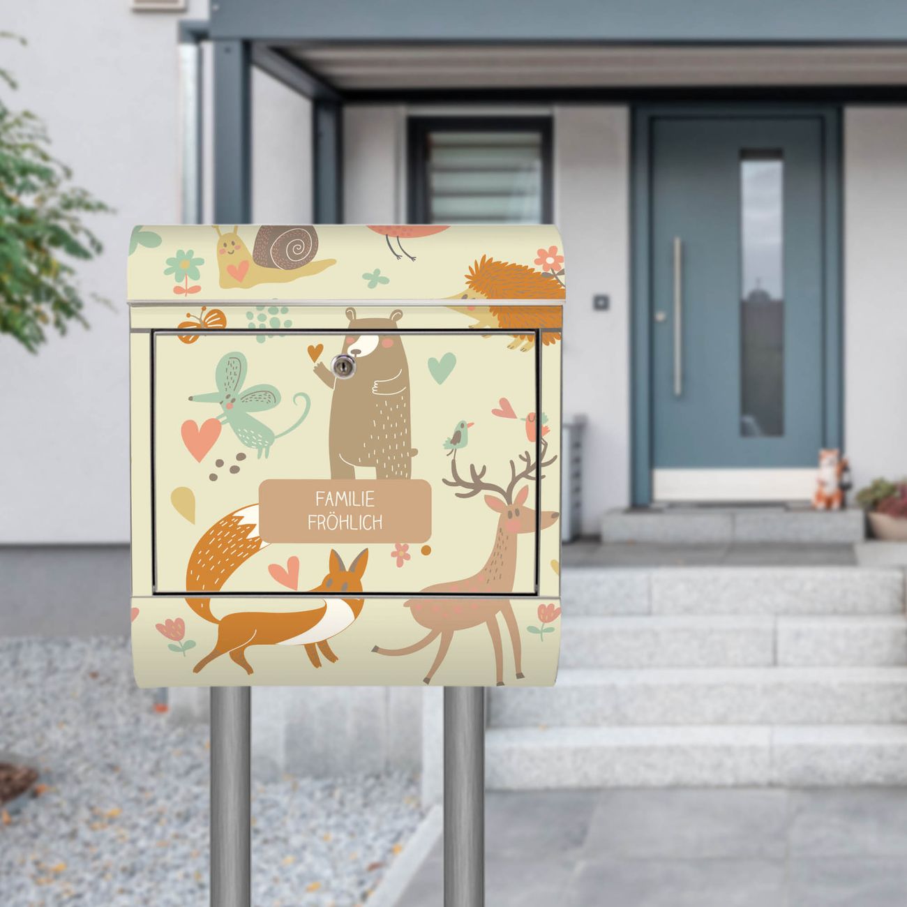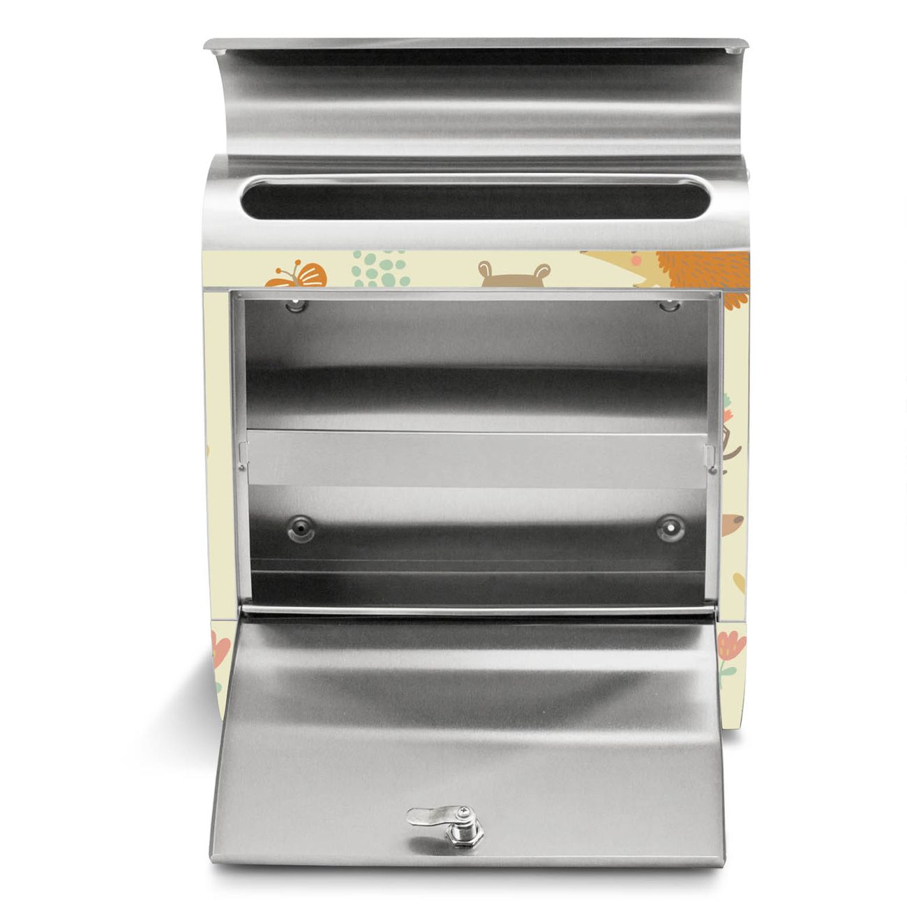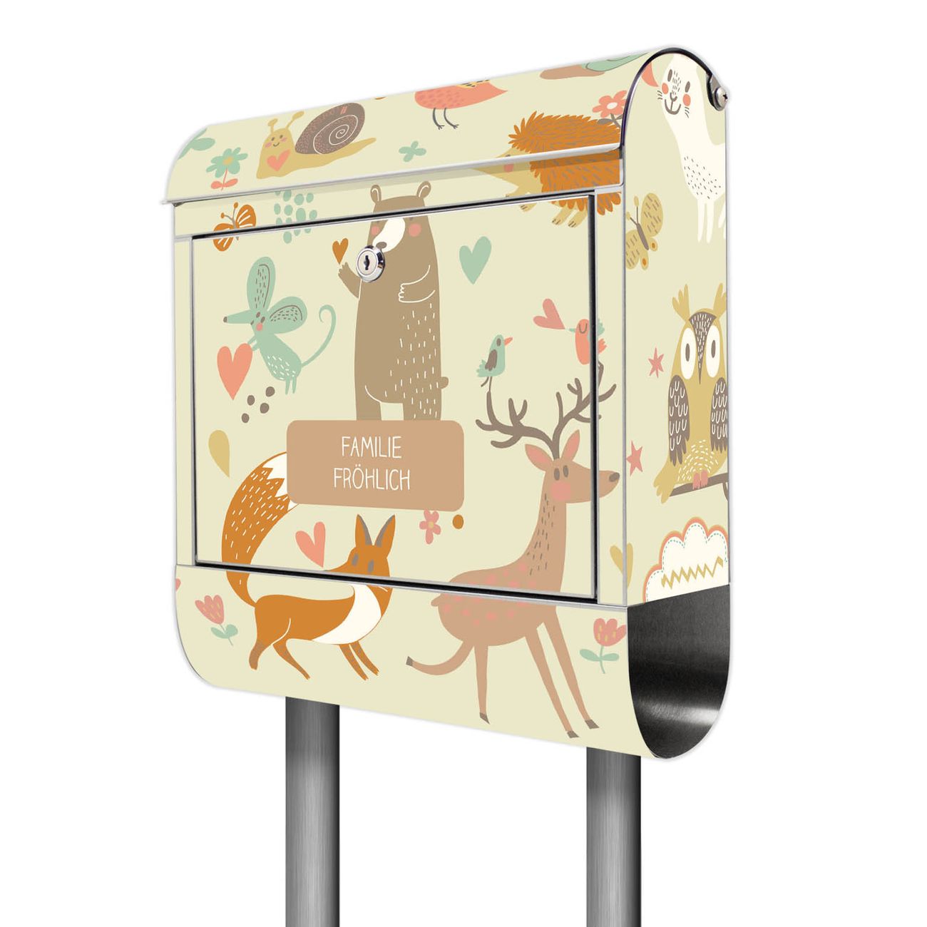 Der Motivstandbriefkasten hat ein sehr ansprechendes und ausgefallenes Design, damit entlocken Sie Ihren Nachbarn und dem Postboten ein Lächeln. Heben Sie Sich ab von der tristen grauen Masse, ohne auf Funktionalität zu verzichten. Der Briefkasten besteht aus hochwertigem 18/0 Edelstahl und die Wetter- und UV-resistenten Folie mit Waldtiere Motiv ist zusätzlich mit einem Schutzlaminat überzogen. Der Standbriefkasten wird mit Montagematerial und zwei Schlüsseln geliefert.