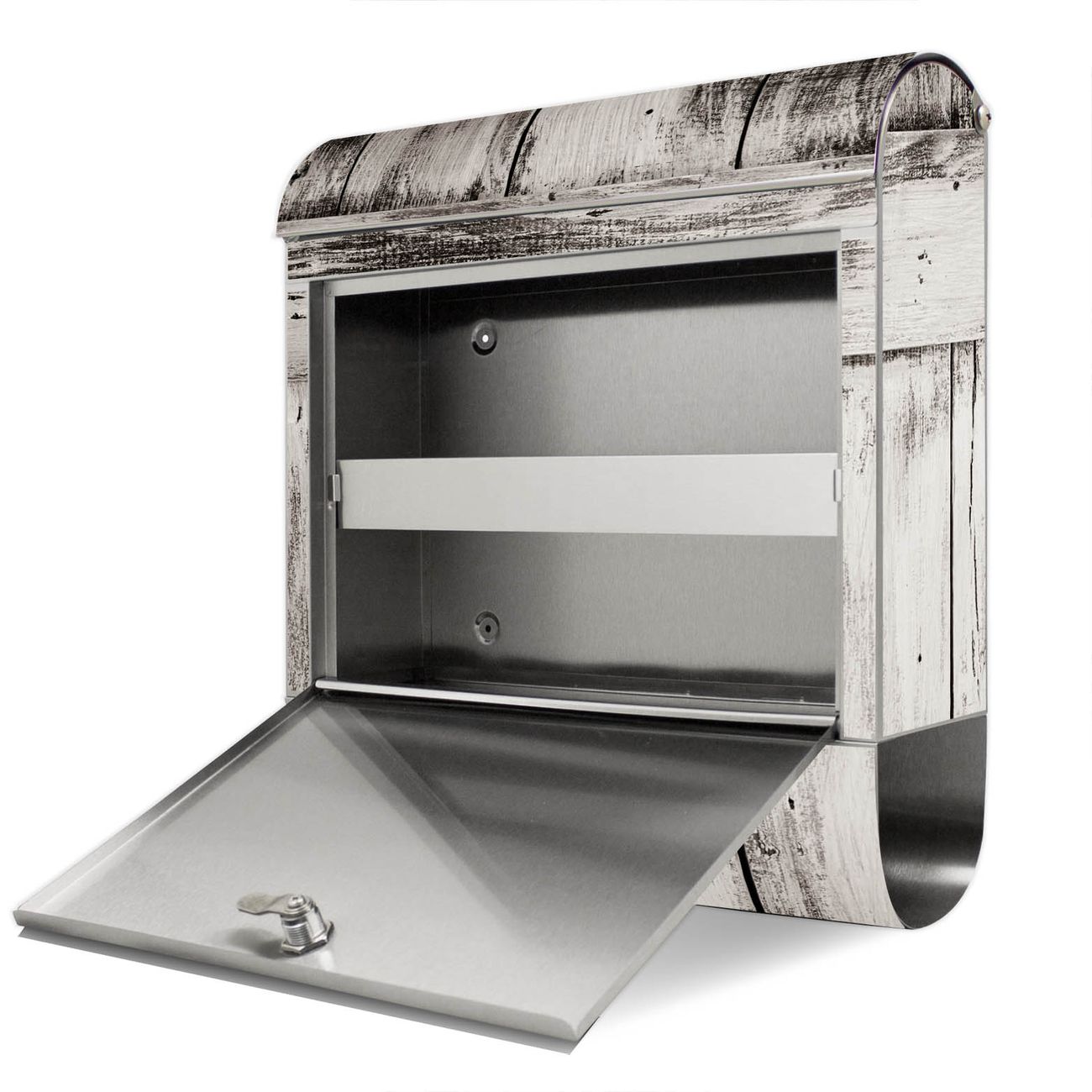 Der Motivstandbriefkasten hat ein sehr ansprechendes und ausgefallenes Design, damit entlocken Sie Ihren Nachbarn und dem Postboten ein Lächeln. Heben Sie Sich ab von der tristen grauen Masse, ohne auf Funktionalität zu verzichten. Der Briefkasten besteht aus hochwertigem 18/0 Edelstahl und die Wetter- und UV-resistenten Folie mit weiße Bretter Motiv ist zusätzlich mit einem Schutzlaminat überzogen. Der Standbriefkasten wird mit Montagematerial und zwei Schlüsseln geliefert.