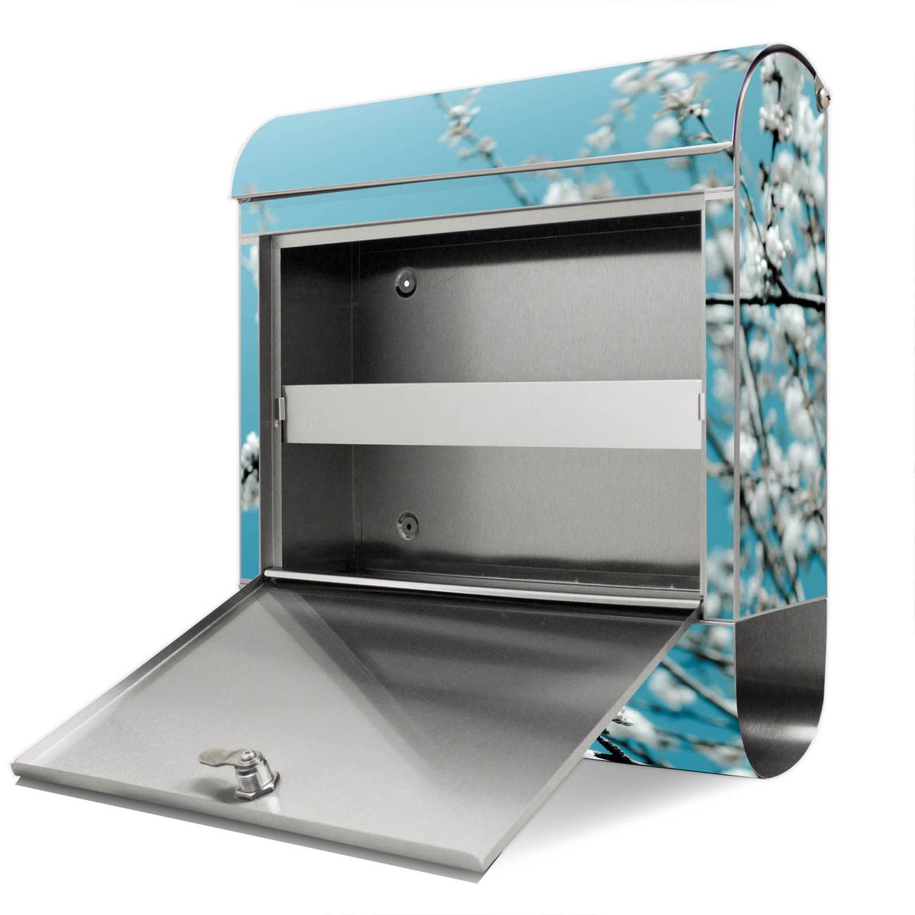 Der Motivstandbriefkasten hat ein sehr ansprechendes und ausgefallenes Design, damit entlocken Sie Ihren Nachbarn und dem Postboten ein Lächeln. Heben Sie Sich ab von der tristen grauen Masse, ohne auf Funktionalität zu verzichten. Der Briefkasten besteht aus hochwertigem 18/0 Edelstahl und die Wetter- und UV-resistenten Folie mit weiße Kirschblüten Motiv ist zusätzlich mit einem Schutzlaminat überzogen. Der Standbriefkasten wird mit Montagematerial und zwei Schlüsseln geliefert.