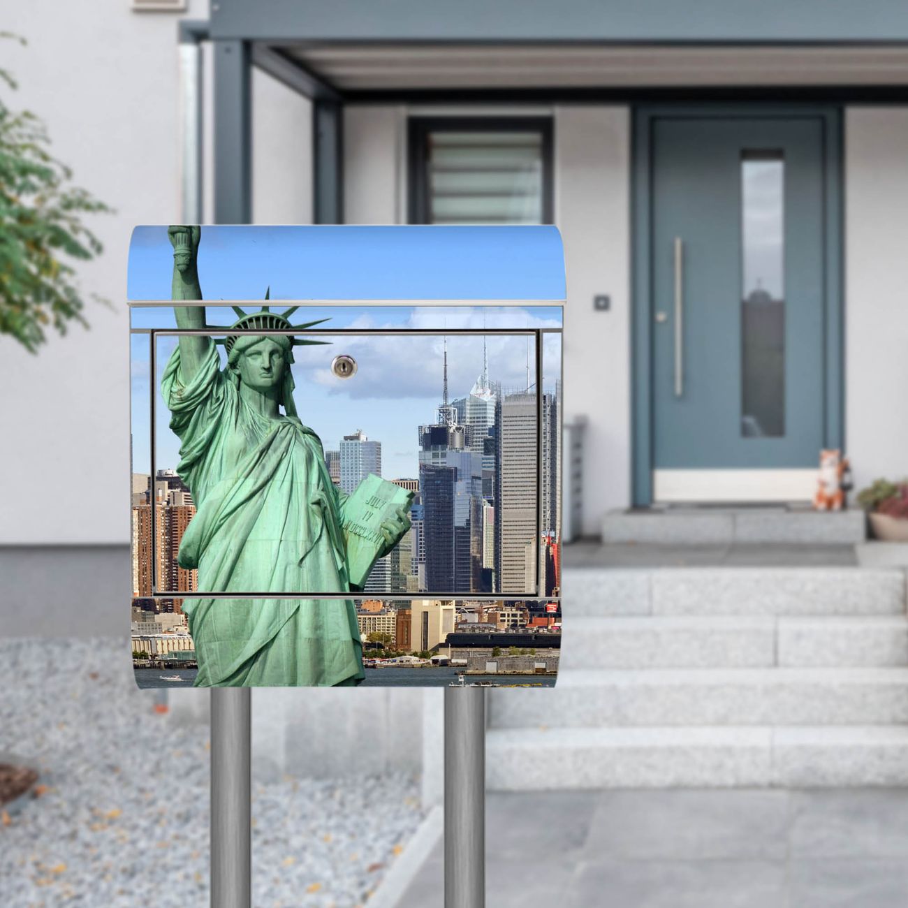 Der Motivstandbriefkasten hat ein sehr ansprechendes und ausgefallenes Design, damit entlocken Sie Ihren Nachbarn und dem Postboten ein Lächeln. Heben Sie Sich ab von der tristen grauen Masse, ohne auf Funktionalität zu verzichten. Der Briefkasten besteht aus hochwertigem 18/0 Edelstahl und die Wetter- und UV-resistenten Folie mit Welcome To NY Motiv ist zusätzlich mit einem Schutzlaminat überzogen. Der Standbriefkasten wird mit Montagematerial und zwei Schlüsseln geliefert.