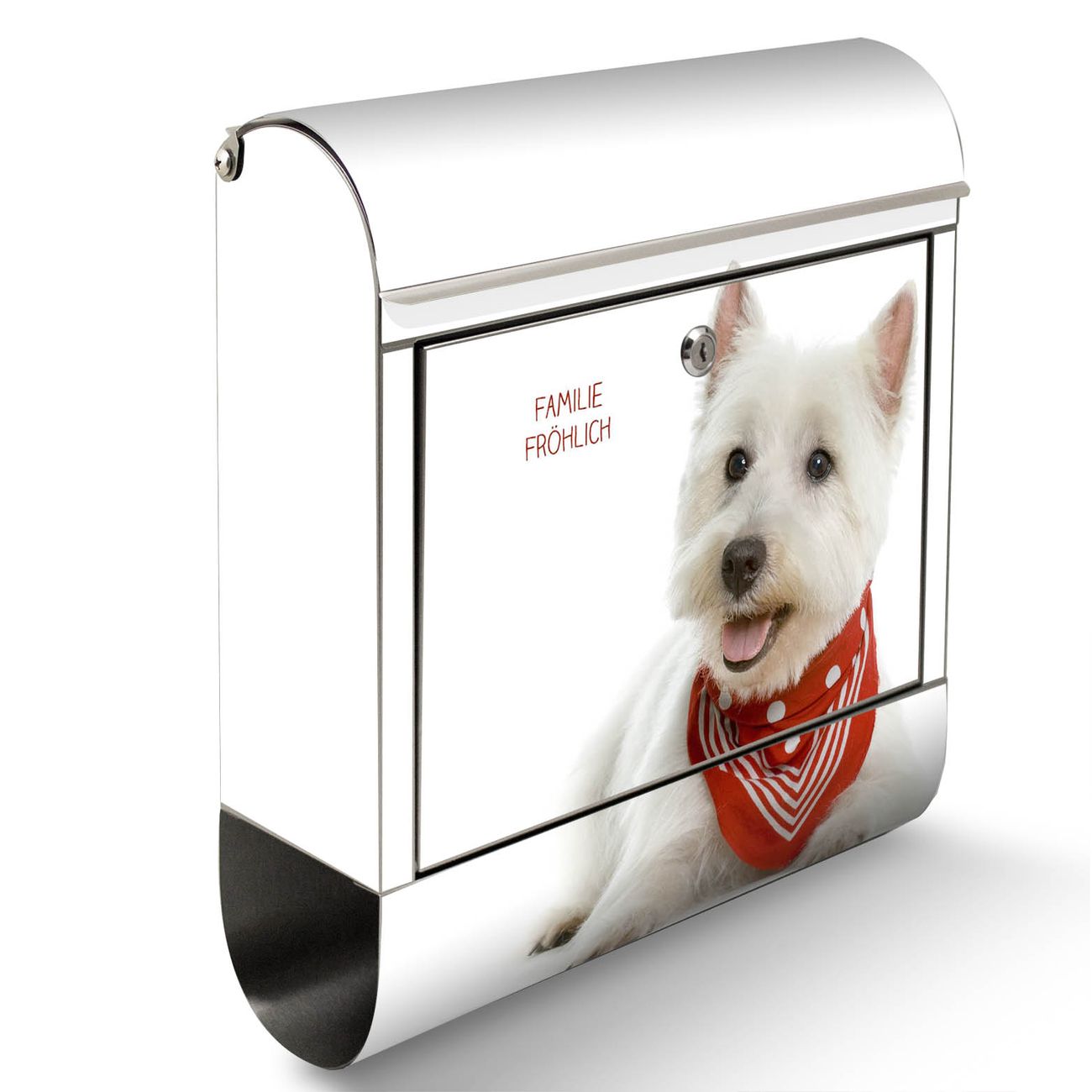 Der banjado Edelstahl Standbriefkasten mit Motiv Westie und eigenem Wunschtext bietet Ihnen mit seinem Fassungsvermögen genügend Platz auch für große A4 Sendungen. Das integrierte Zeitungsfach eignet sich hervorragend, um unkompliziert die Tageszeitung zu fassen.