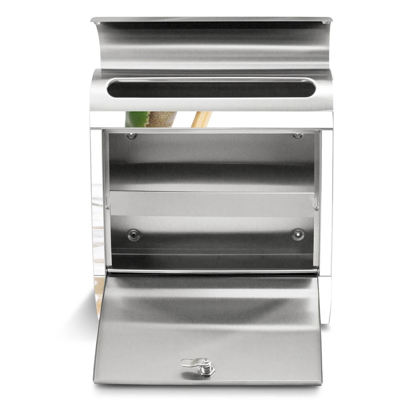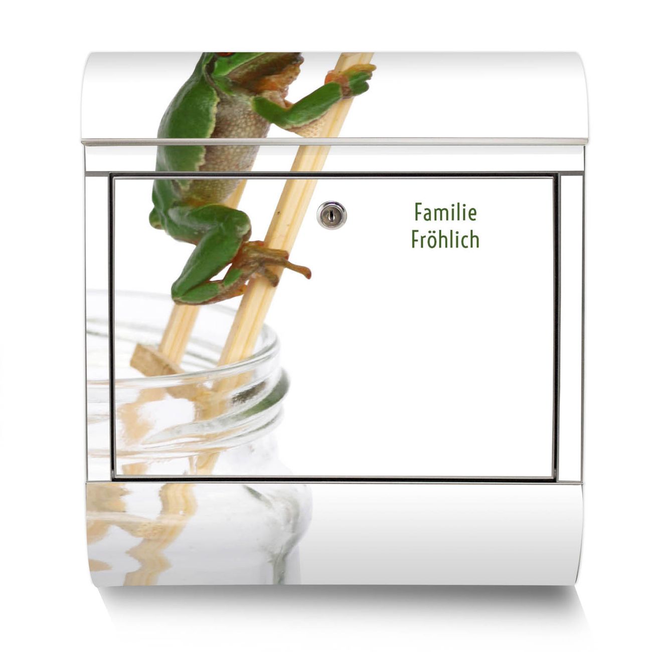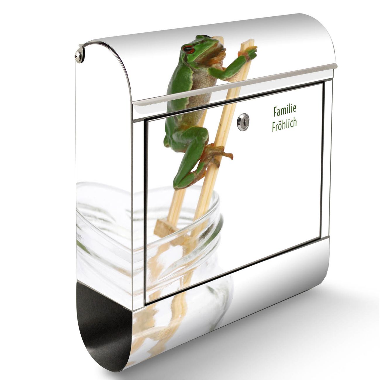 Der banjado Edelstahl Standbriefkasten mit Motiv Wetterfrosch und eigenem Wunschtext bietet Ihnen mit seinem Fassungsvermögen genügend Platz auch für große A4 Sendungen. Das integrierte Zeitungsfach eignet sich hervorragend, um unkompliziert die Tageszeitung zu fassen.
