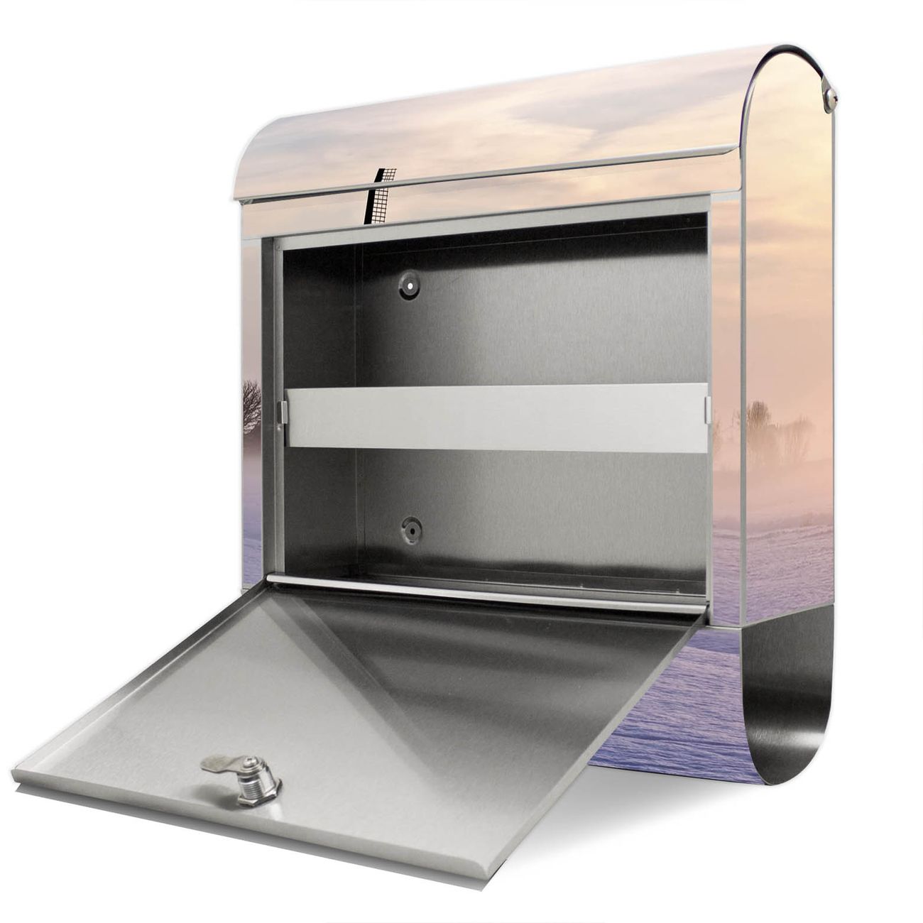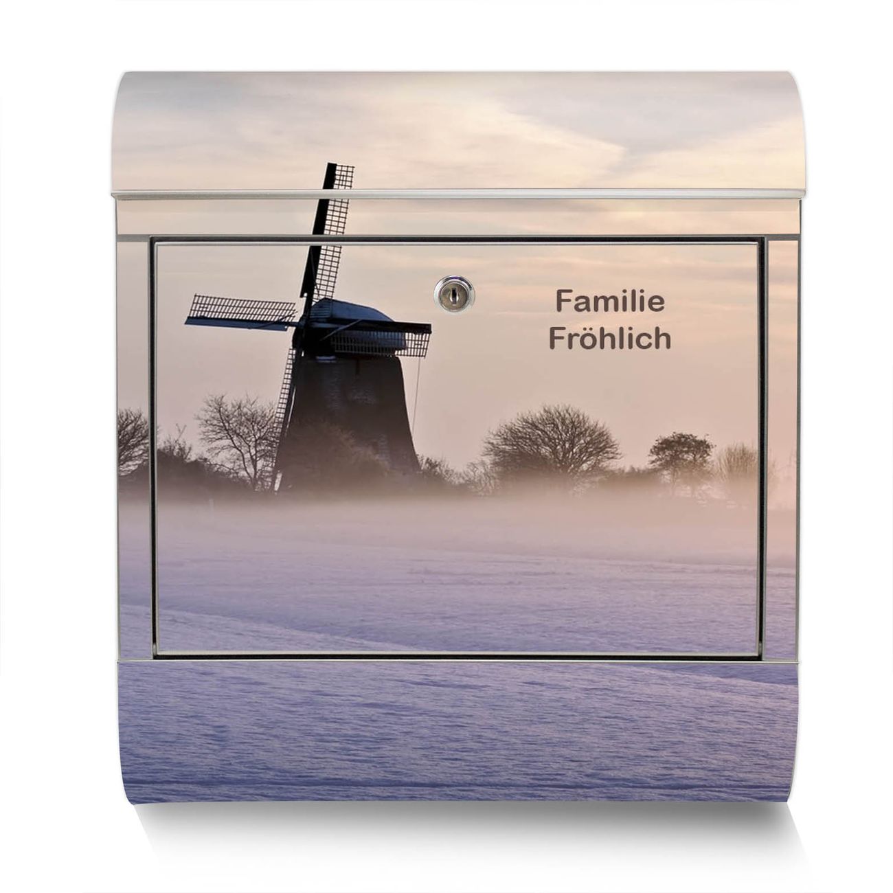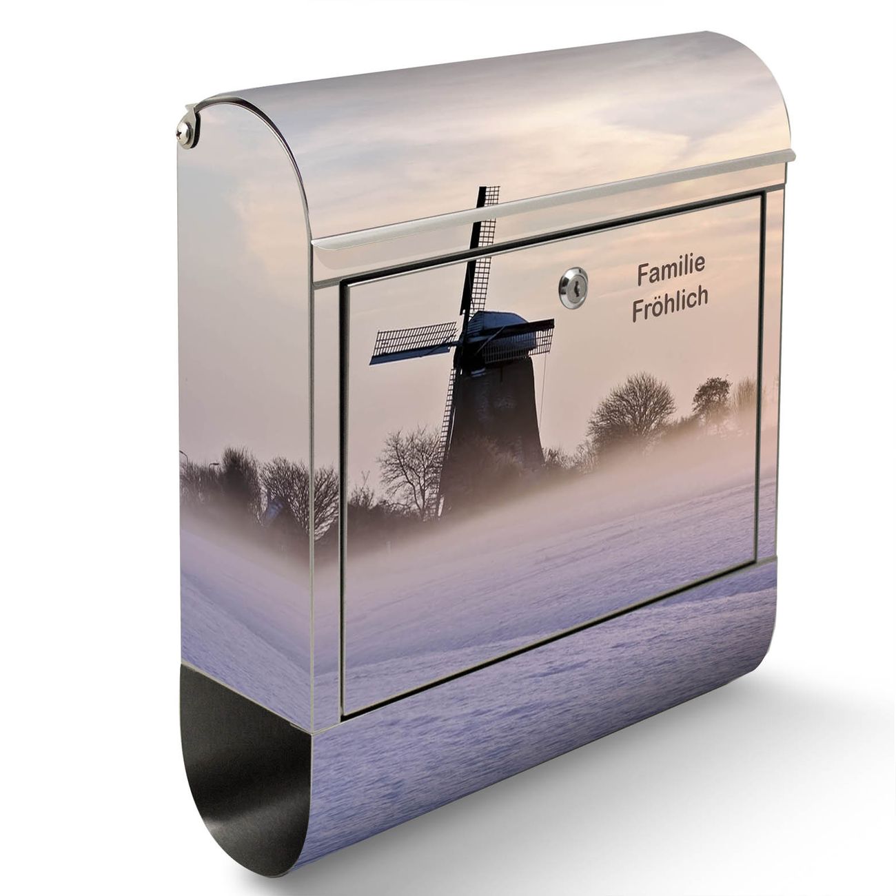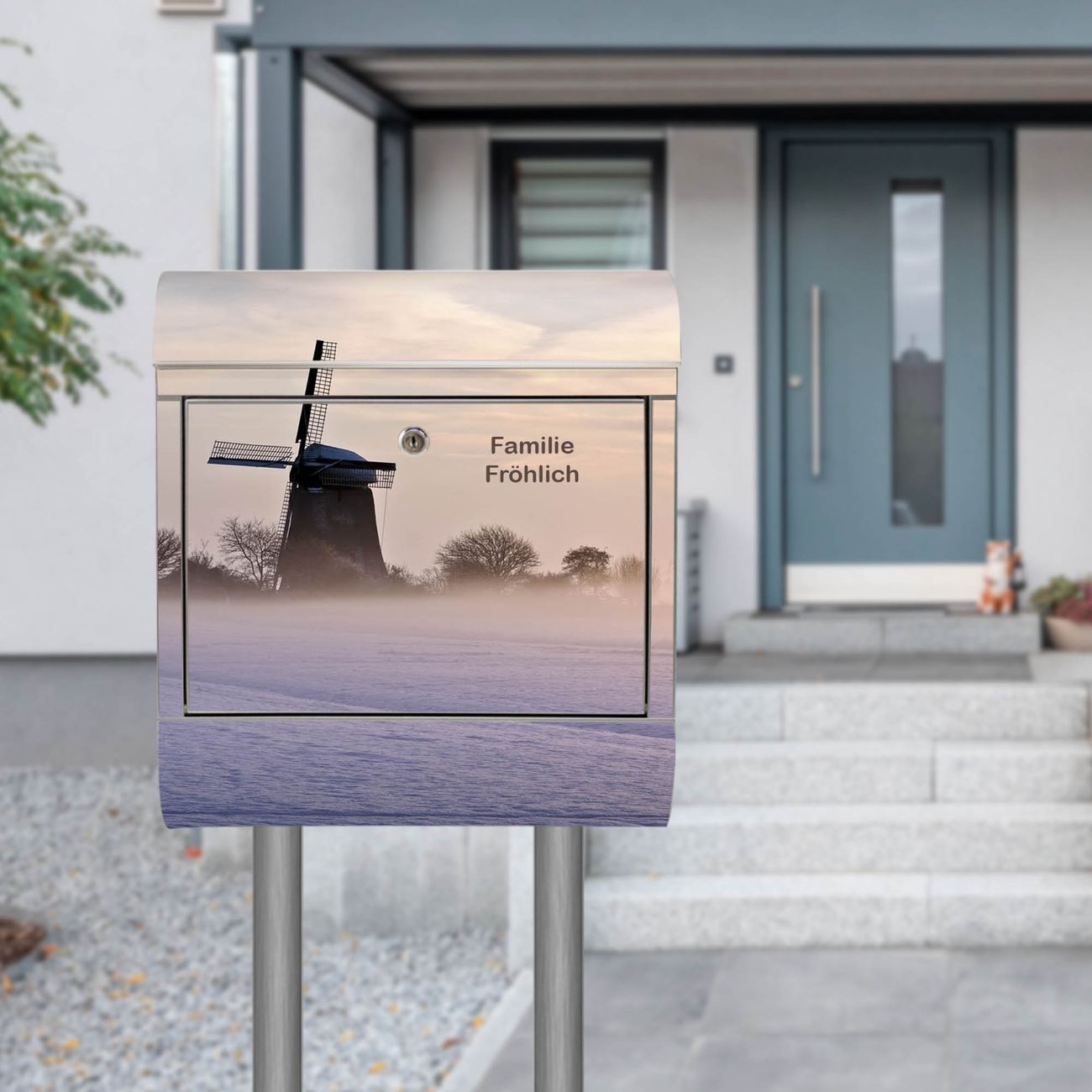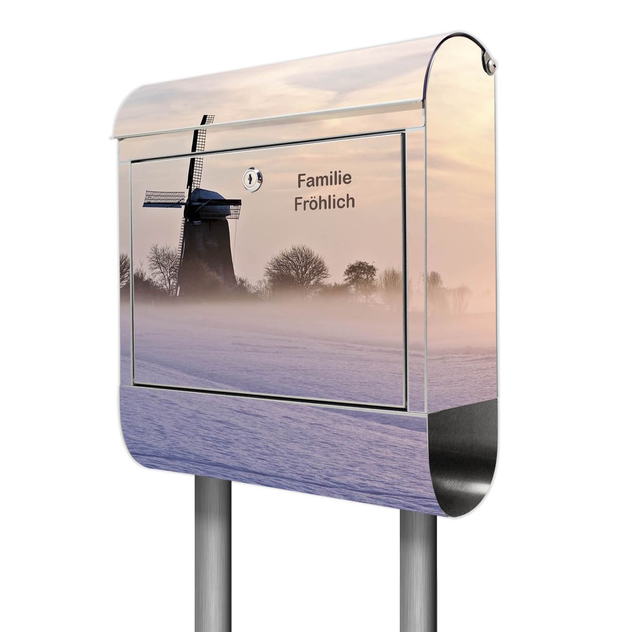 Der banjado Edelstahl Standbriefkasten mit Motiv Windmühle im Winter und eigenem Wunschtext bietet Ihnen mit seinem Fassungsvermögen genügend Platz auch für große A4 Sendungen. Das integrierte Zeitungsfach eignet sich hervorragend, um unkompliziert die Tageszeitung zu fassen.