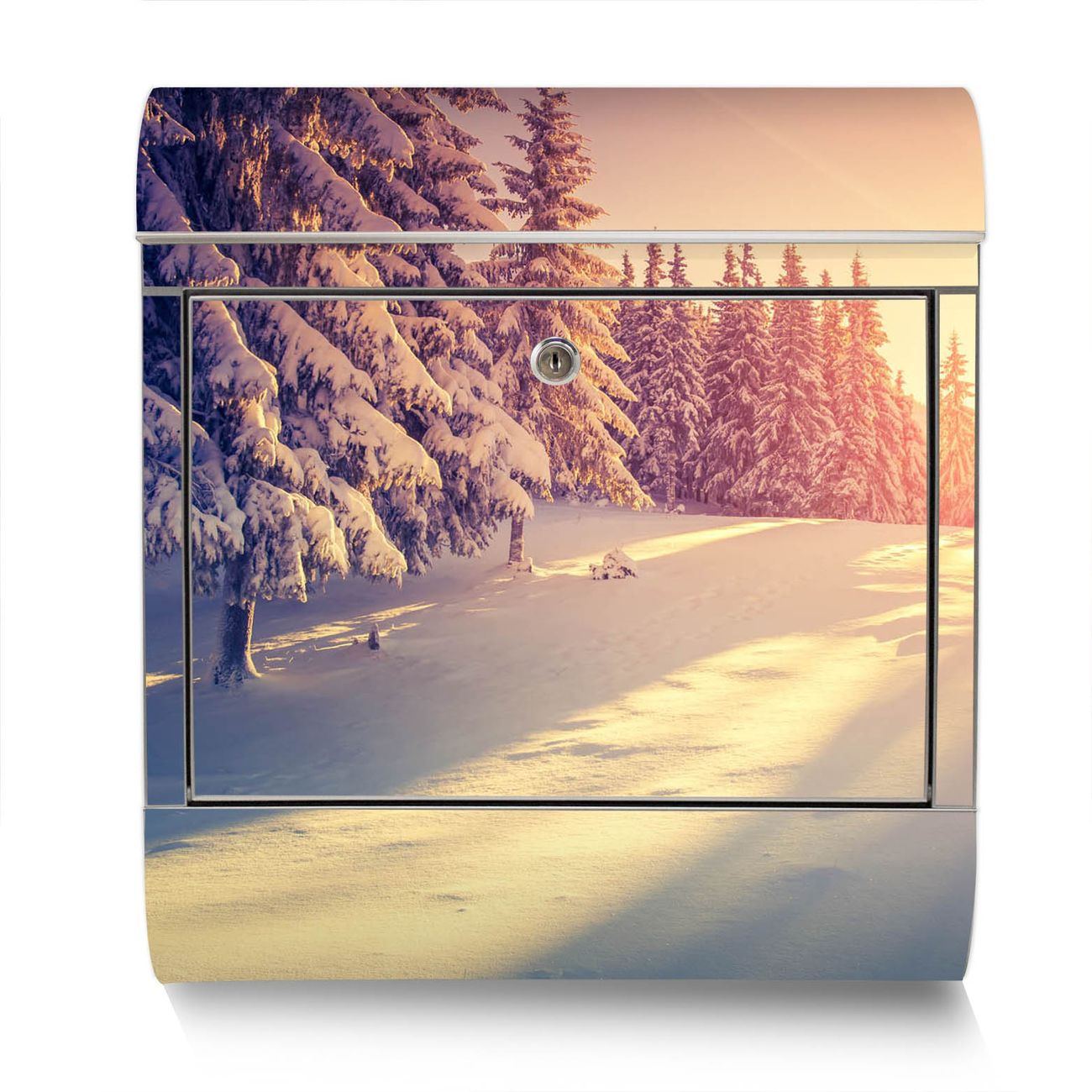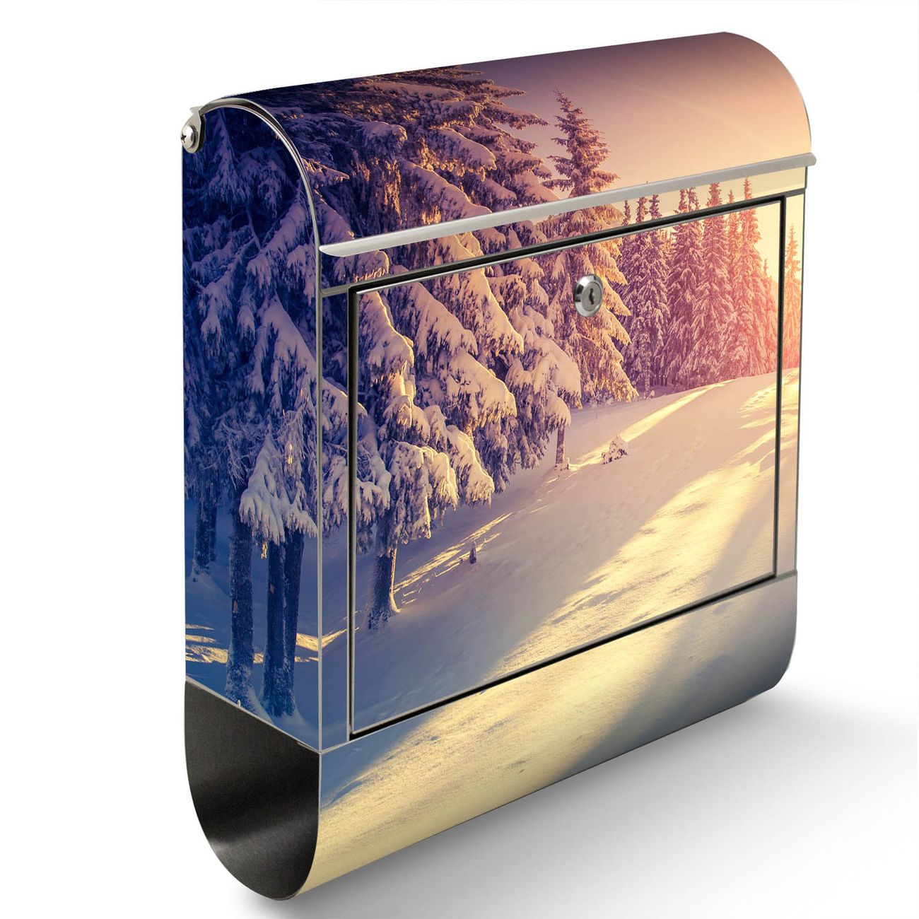Der Motivstandbriefkasten hat ein sehr ansprechendes und ausgefallenes Design, damit entlocken Sie Ihren Nachbarn und dem Postboten ein Lächeln. Heben Sie Sich ab von der tristen grauen Masse, ohne auf Funktionalität zu verzichten. Der Briefkasten besteht aus hochwertigem 18/0 Edelstahl und die Wetter- und UV-resistenten Folie mit Winterabend Motiv ist zusätzlich mit einem Schutzlaminat überzogen. Der Standbriefkasten wird mit Montagematerial und zwei Schlüsseln geliefert.